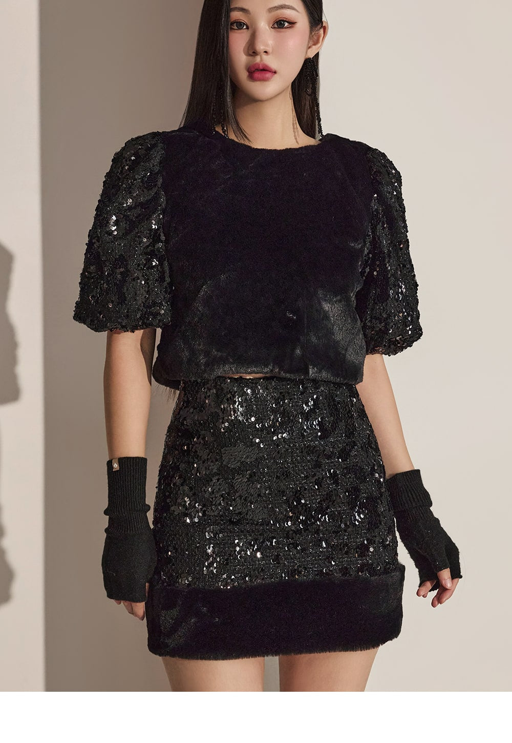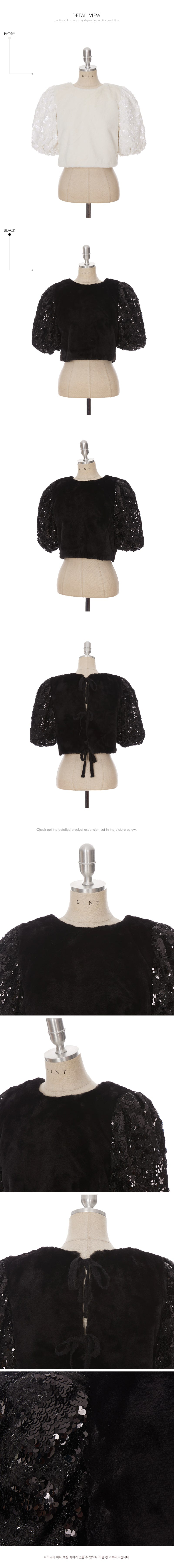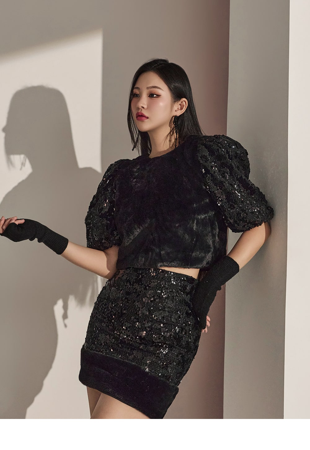 スパンコールの袖のディテールがユニークなタッチを加え、全体の雰囲気を高めます。
