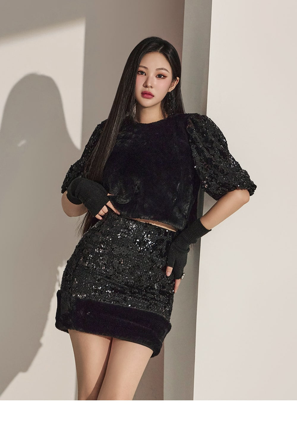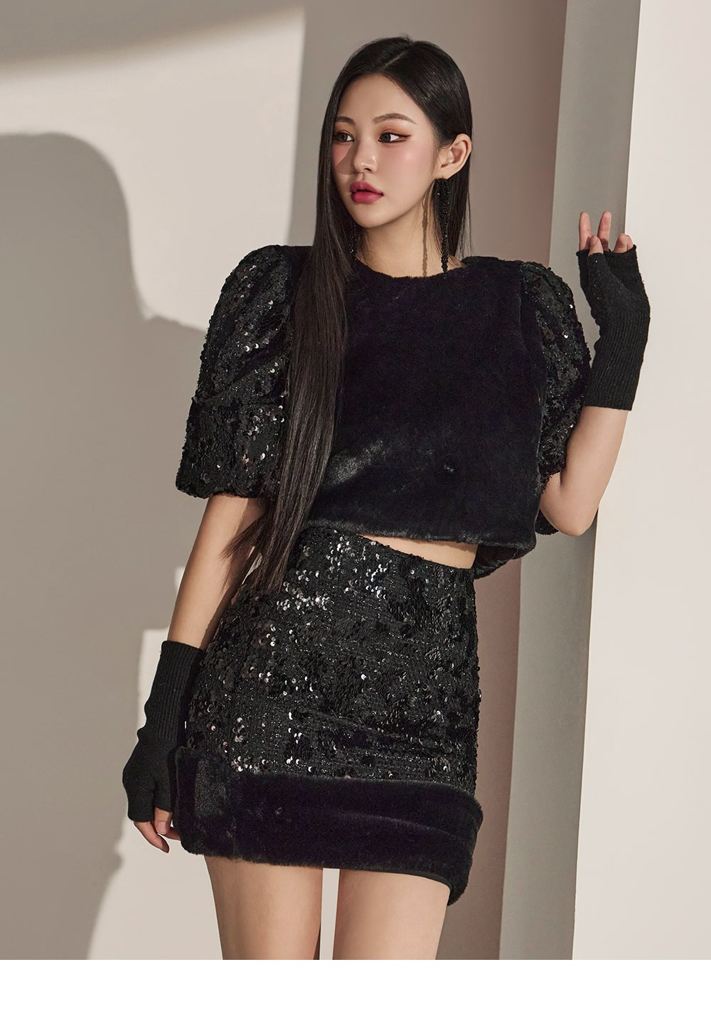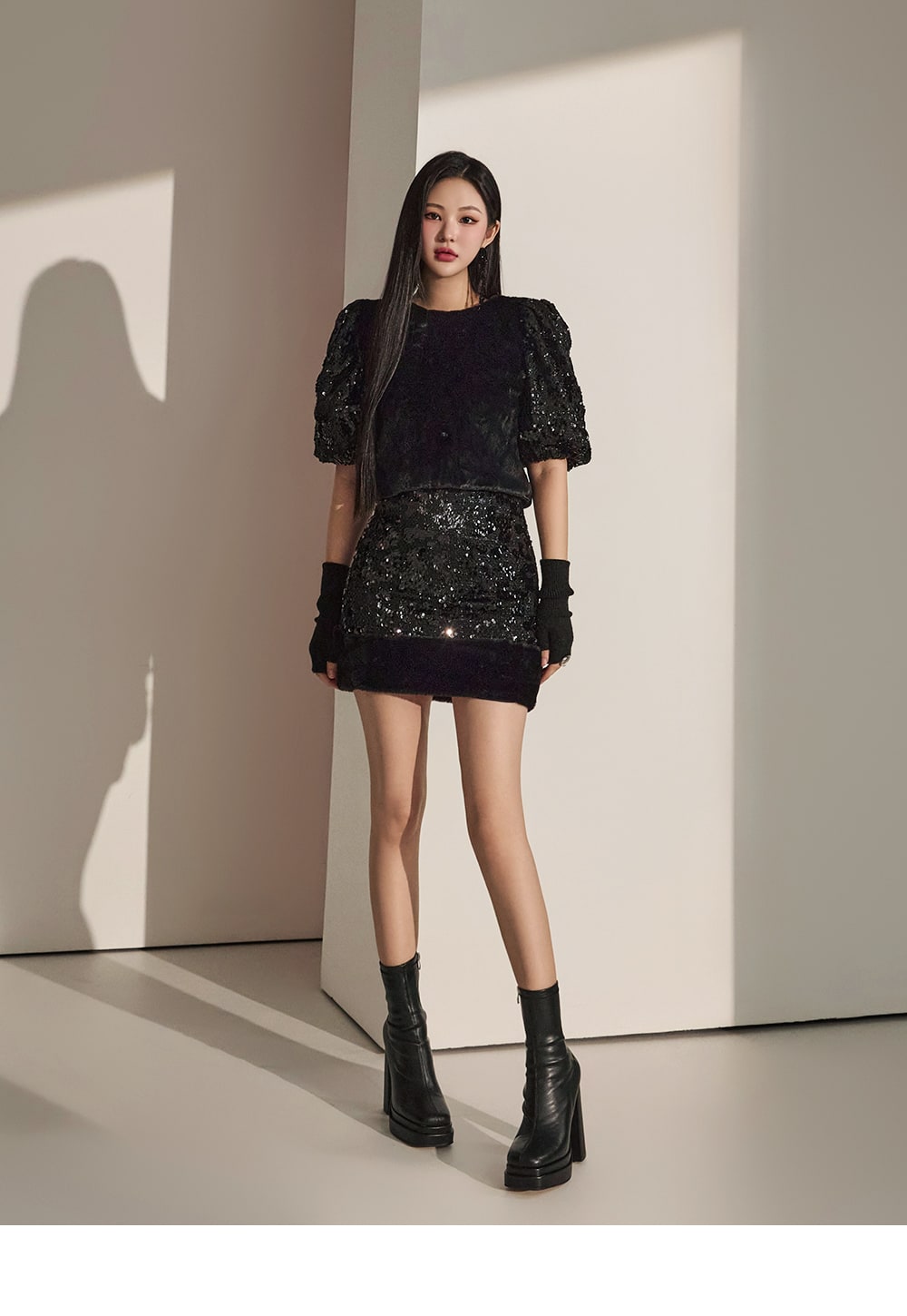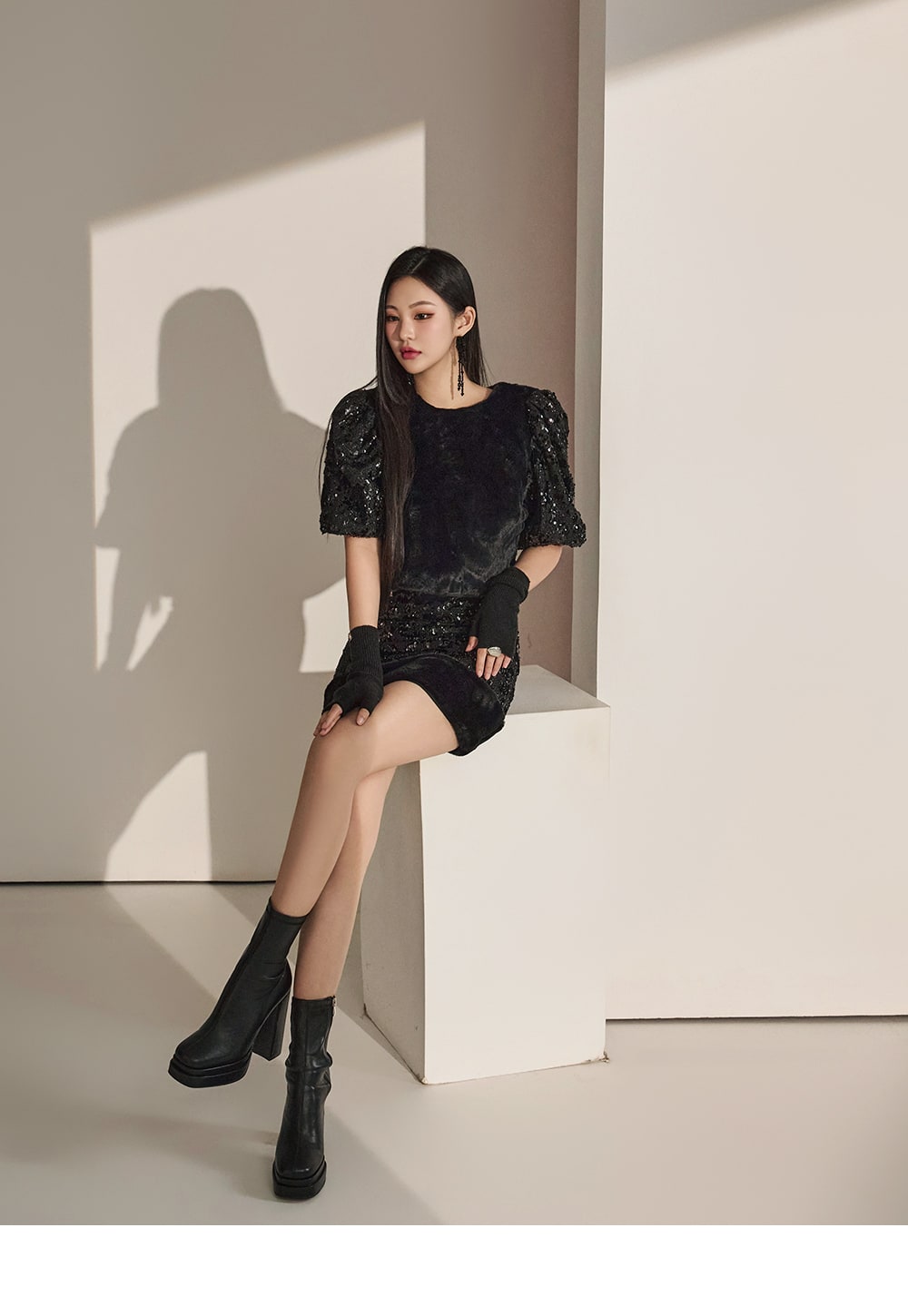 スパンコールの袖のディテールがユニークなタッチを加え、全体の雰囲気を高めます。