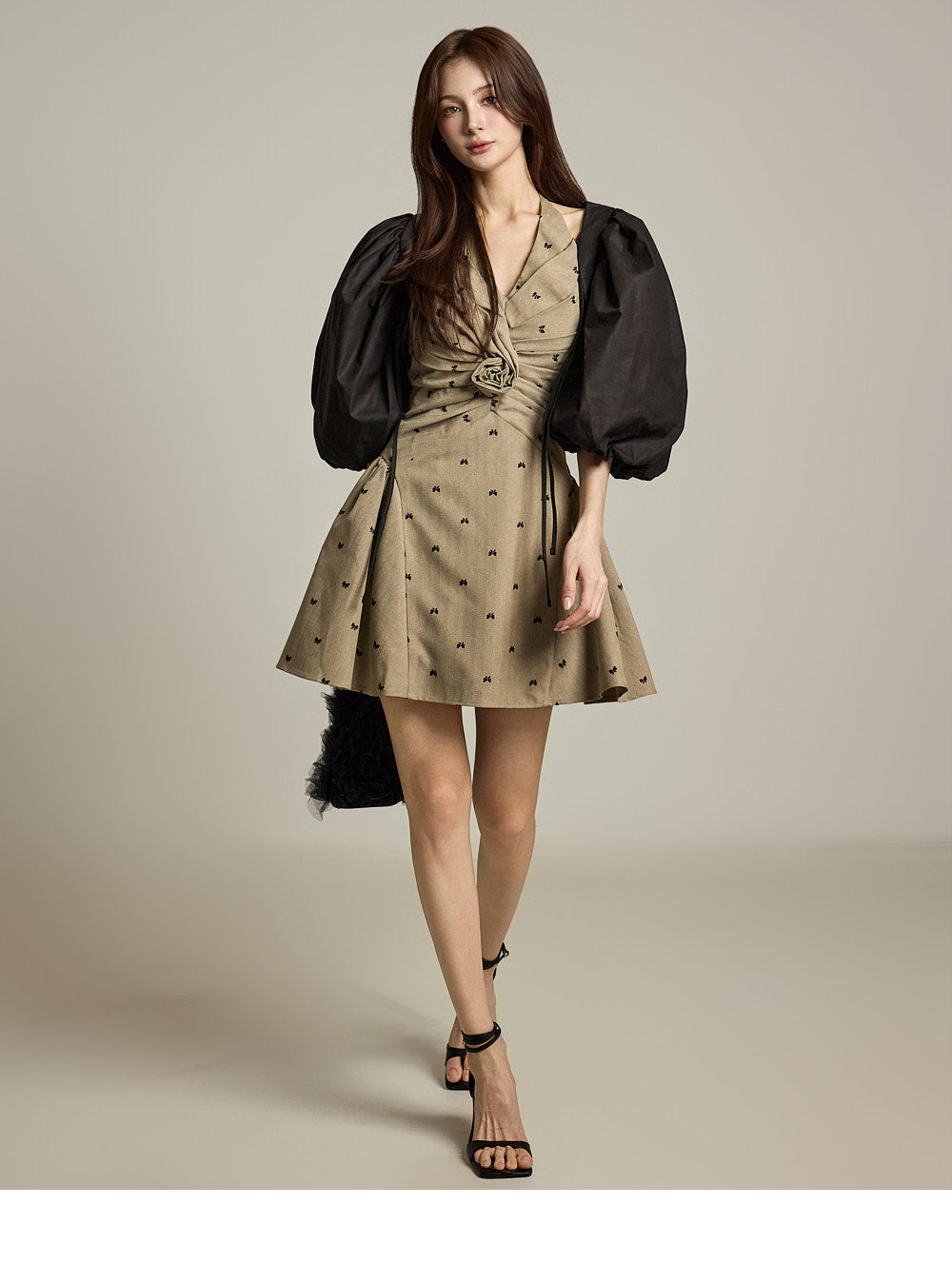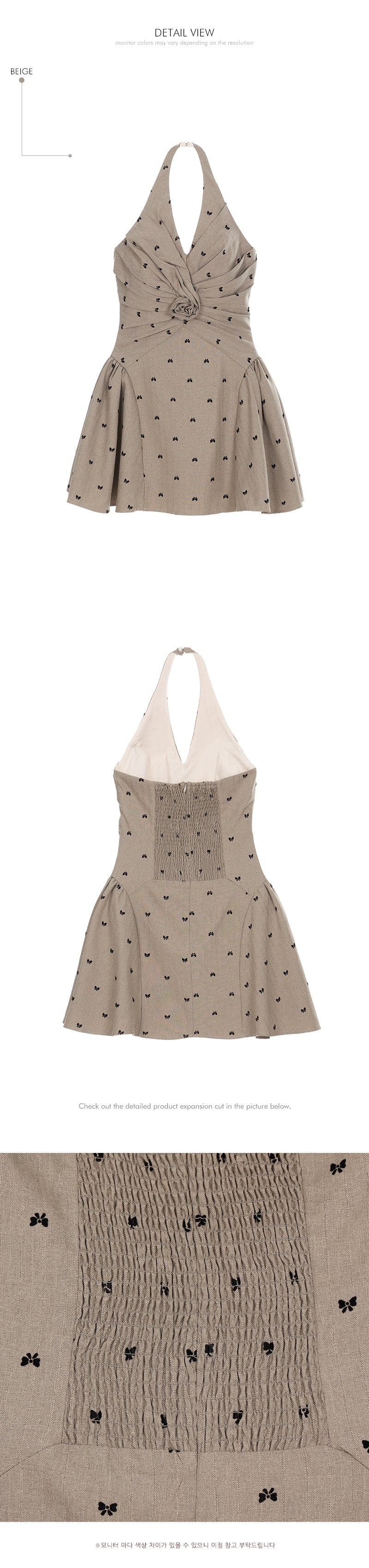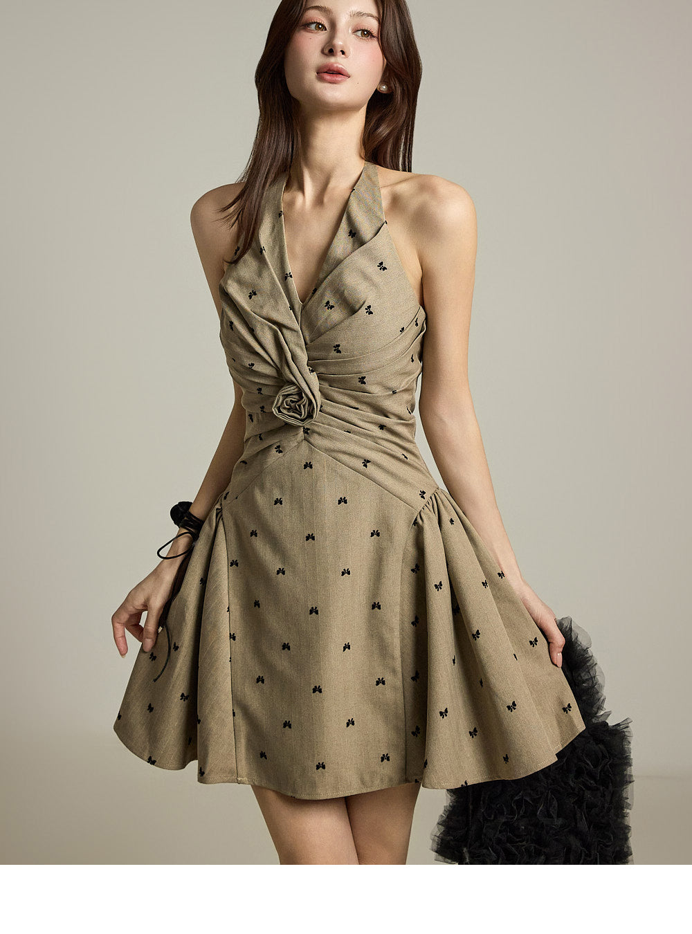 ホルターネックのデザインとコサージュのディテールがスタイリッシュなタッチを添えます。