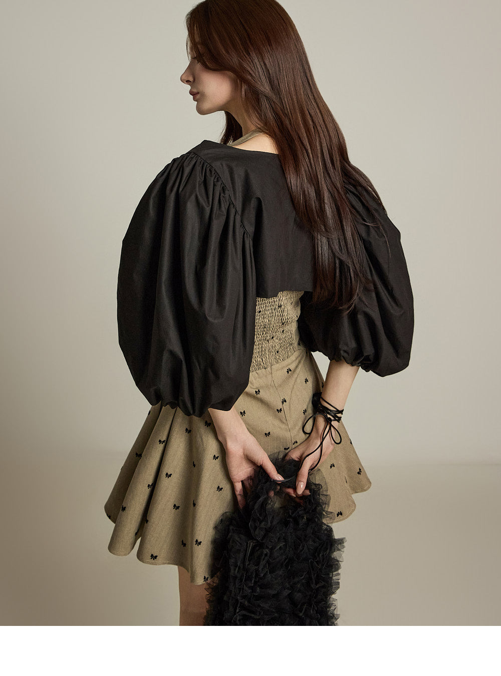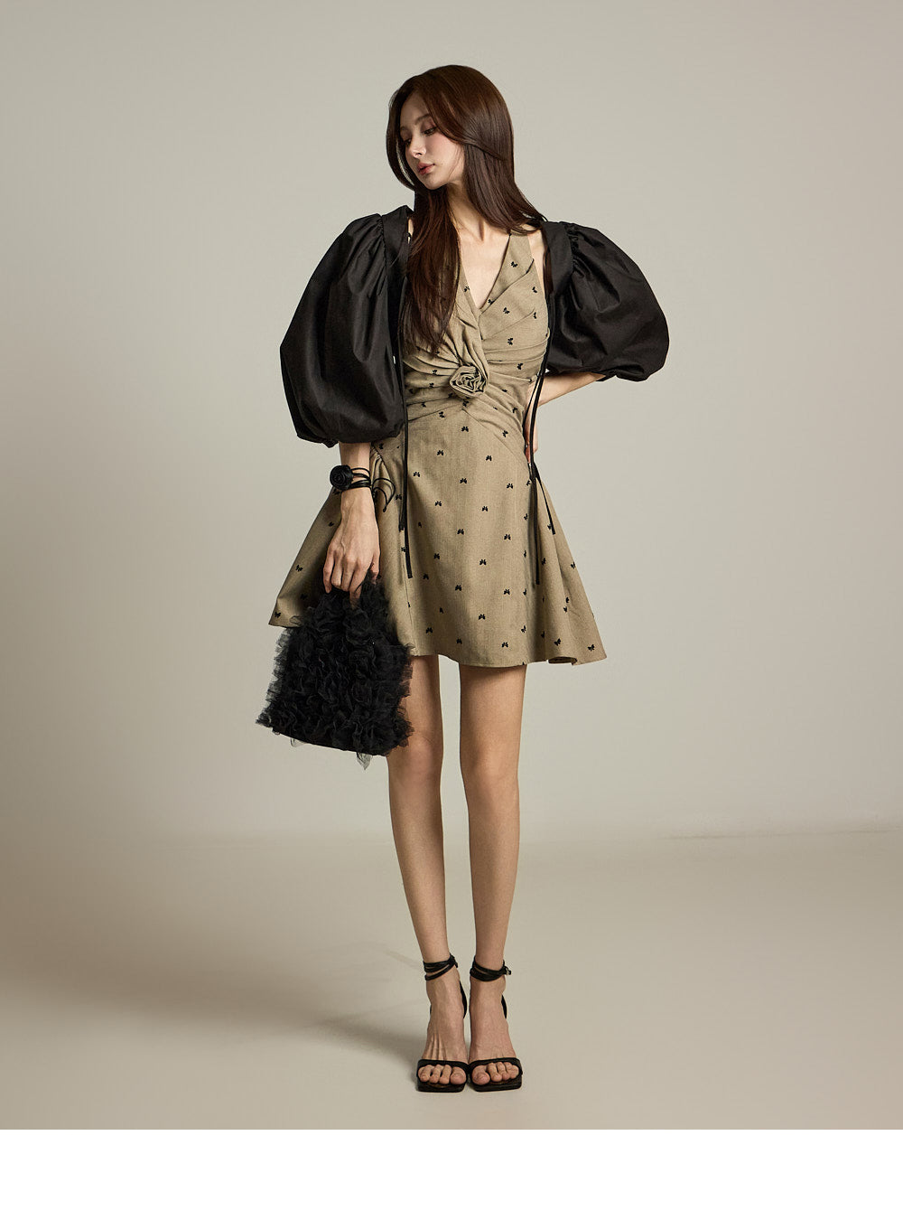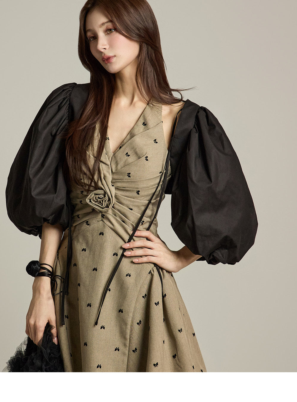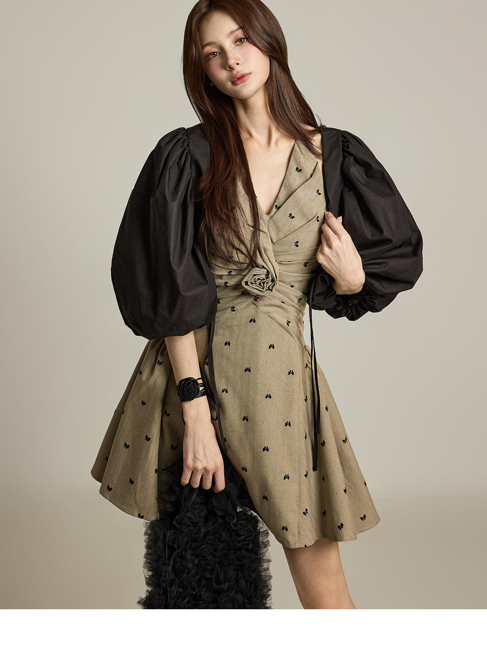 ホルターネックのデザインとコサージュのディテールがスタイリッシュなタッチを添えます。