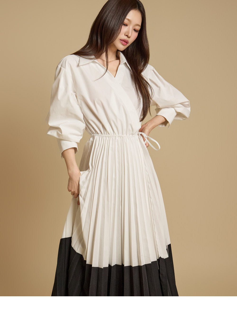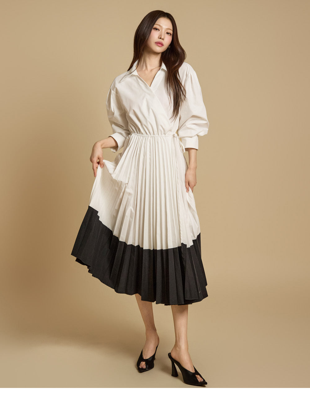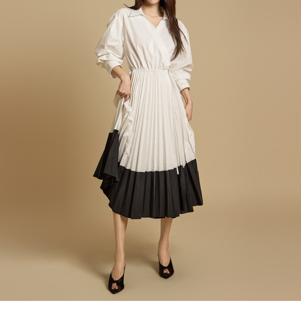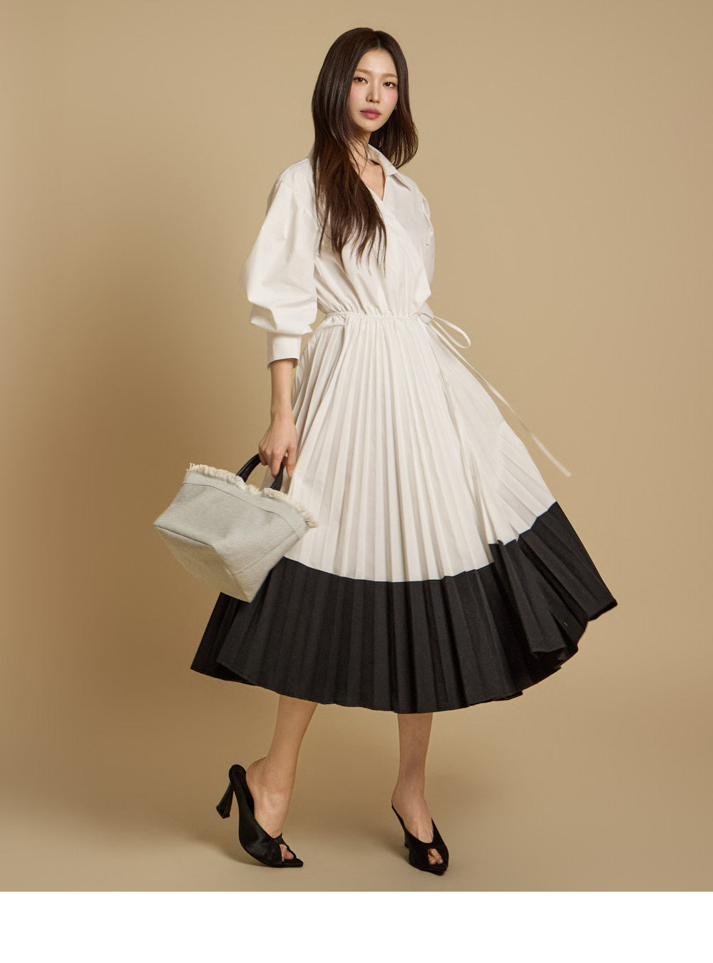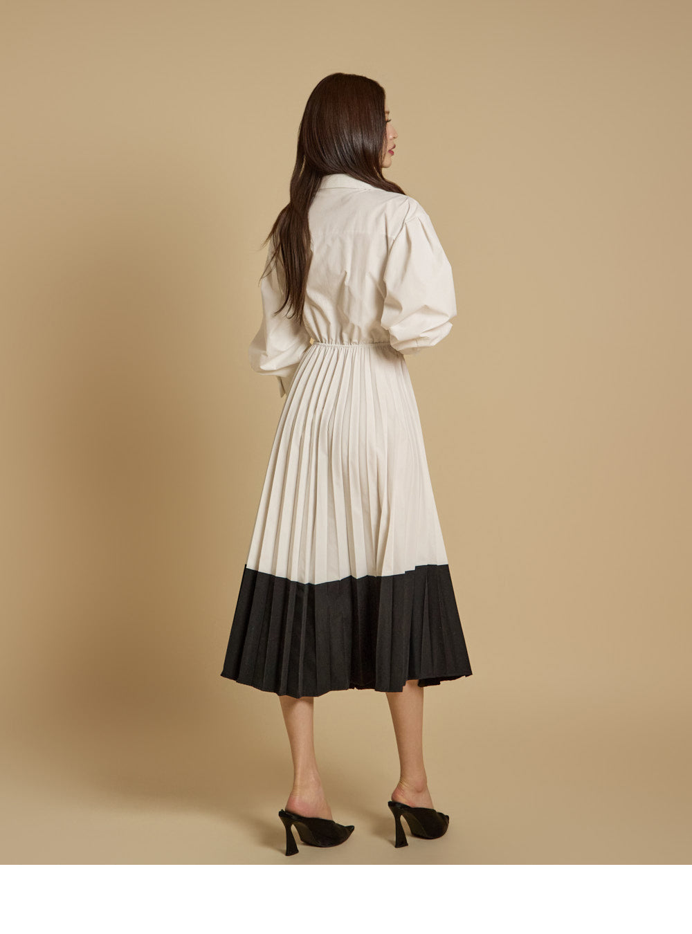 プリーツスカート、袖のシルバーボタンのアクセント、