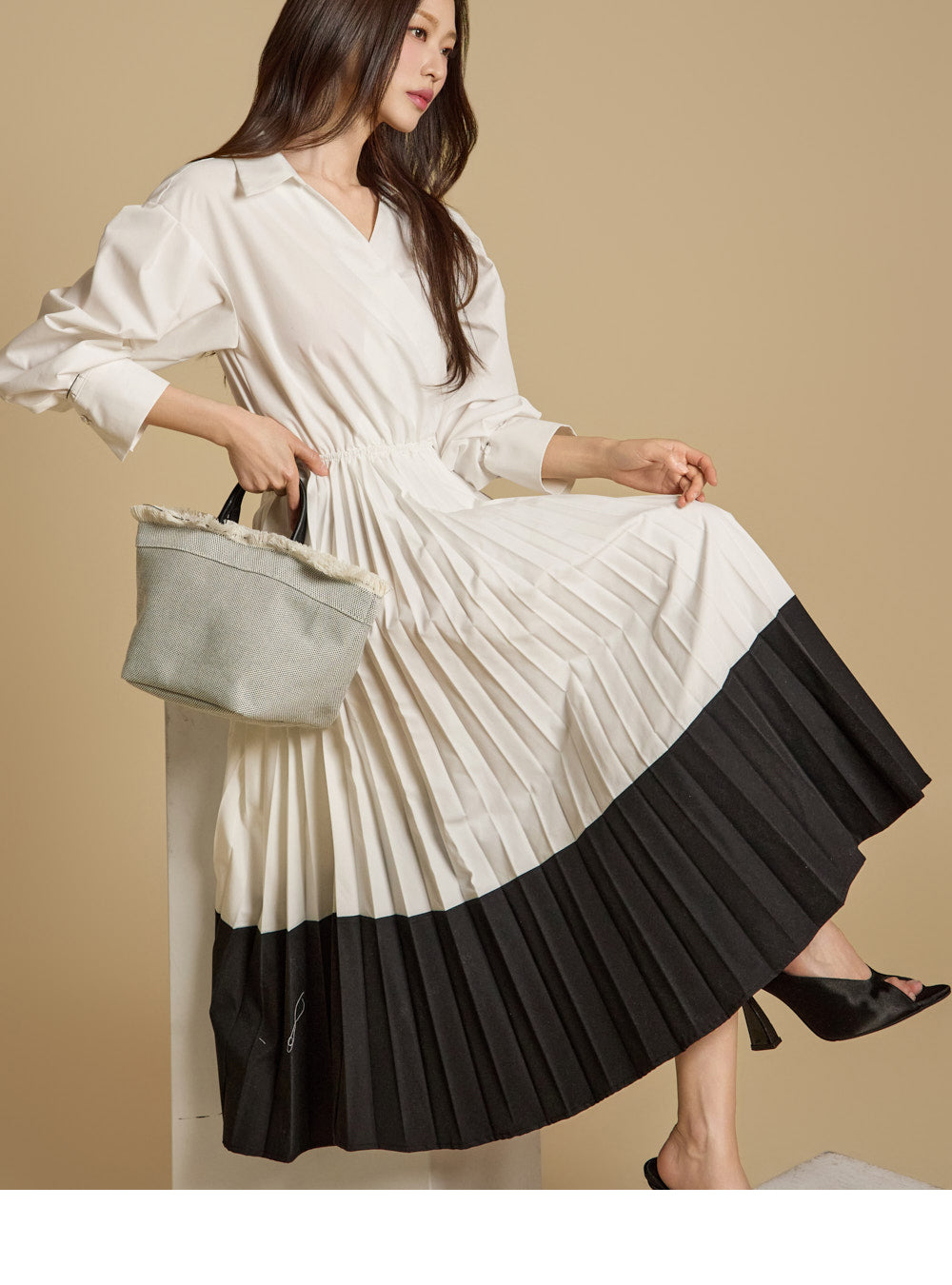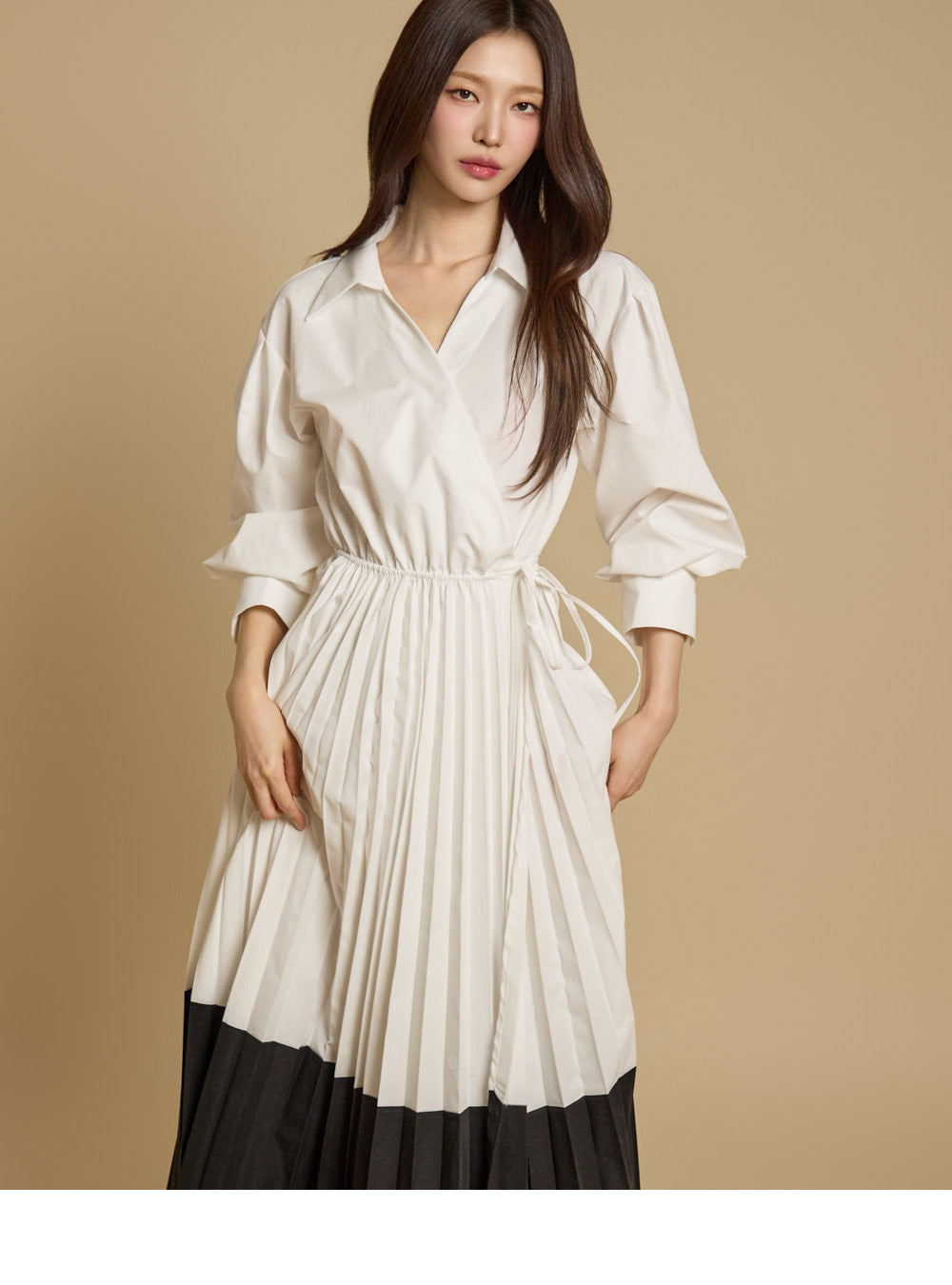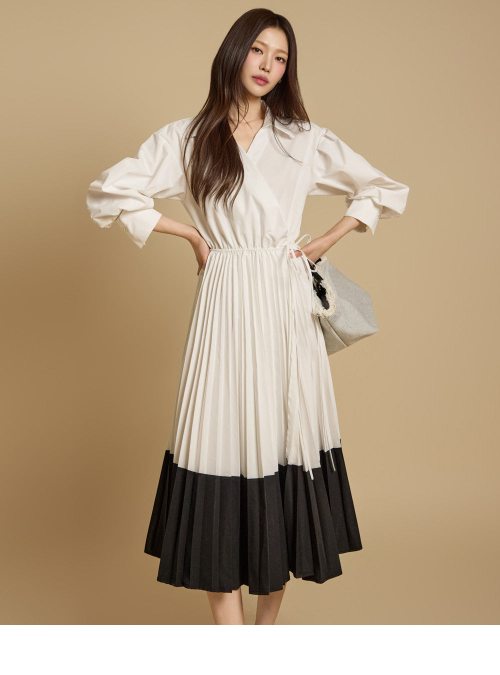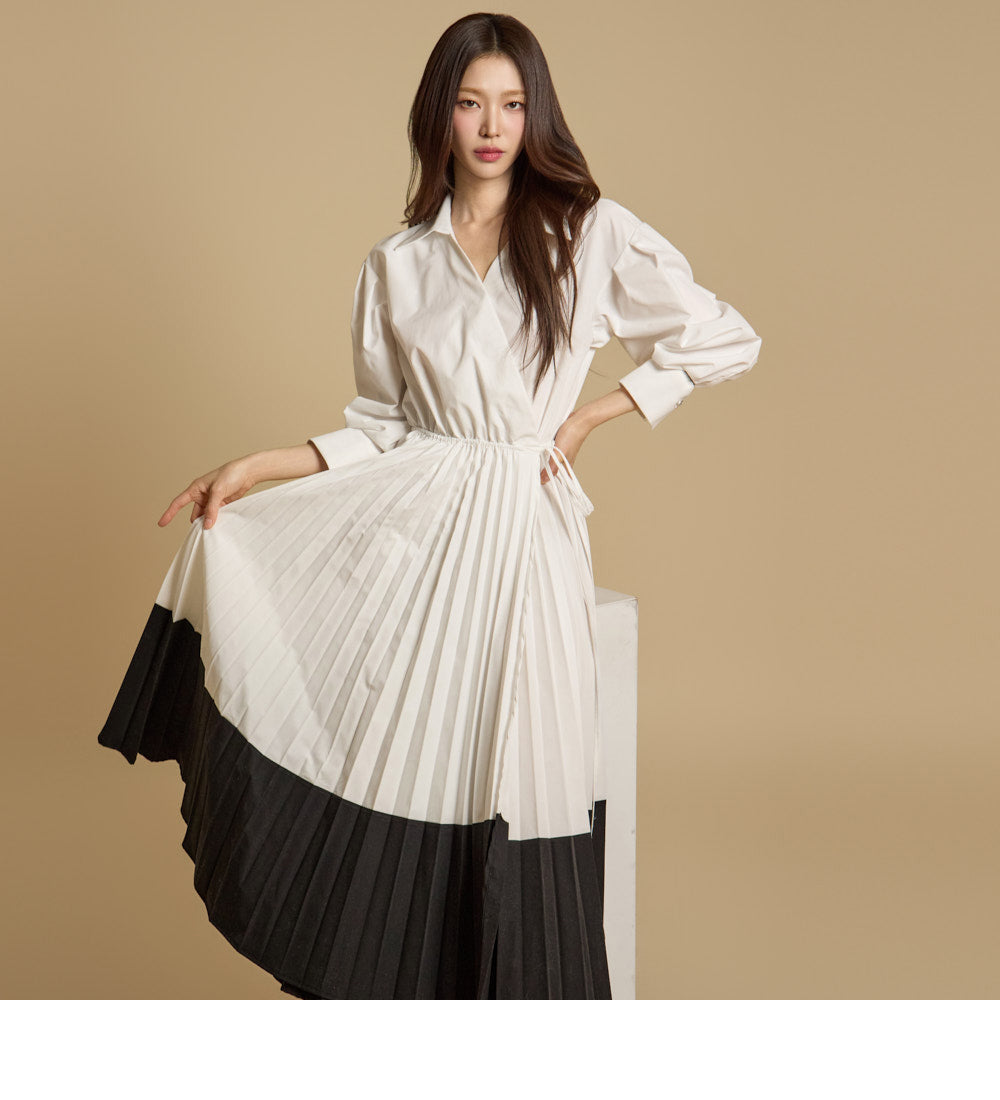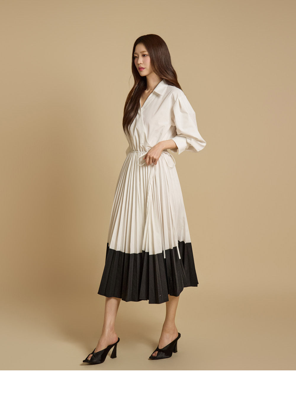 プリーツスカート、袖のシルバーボタンのアクセント、
