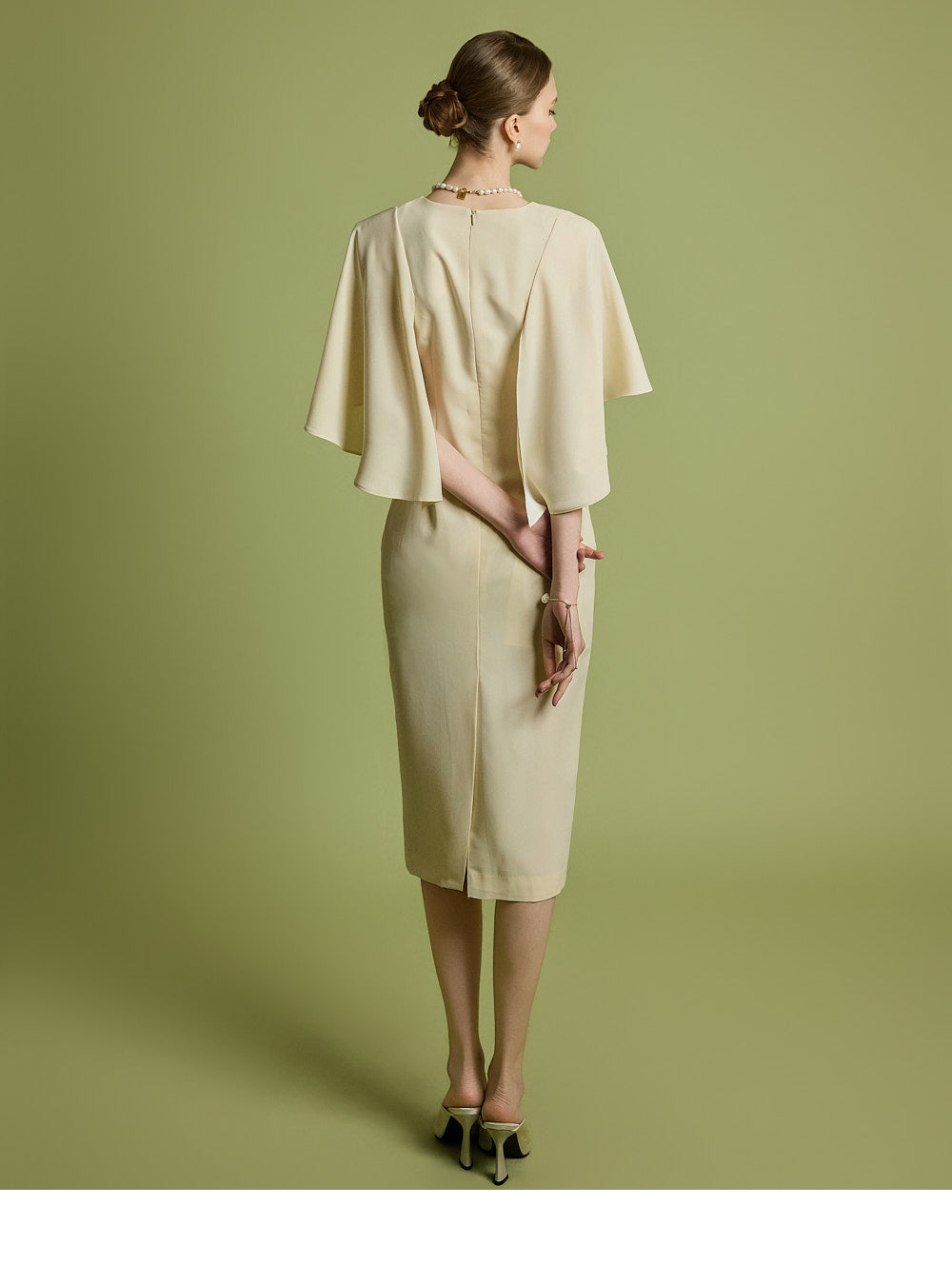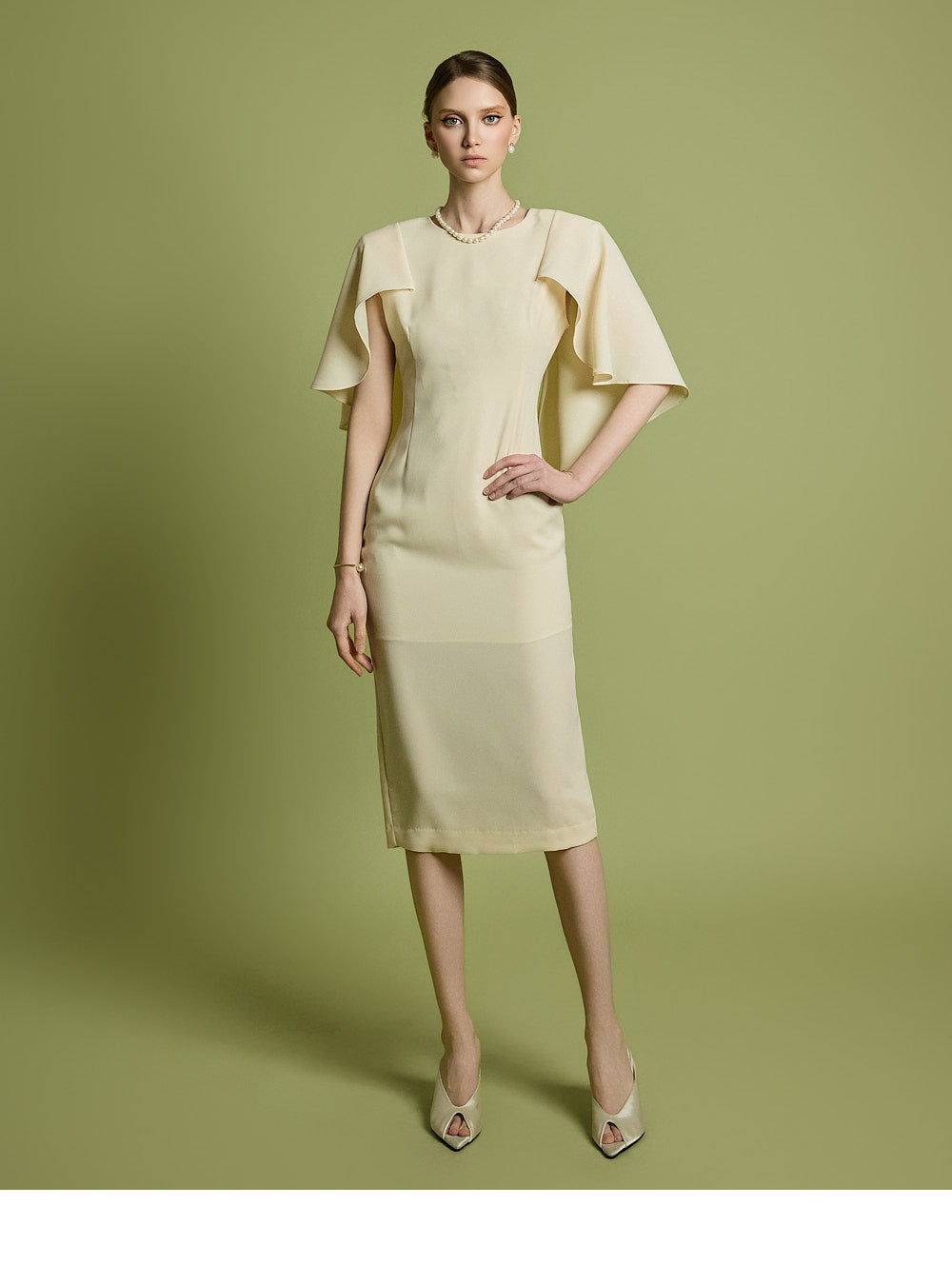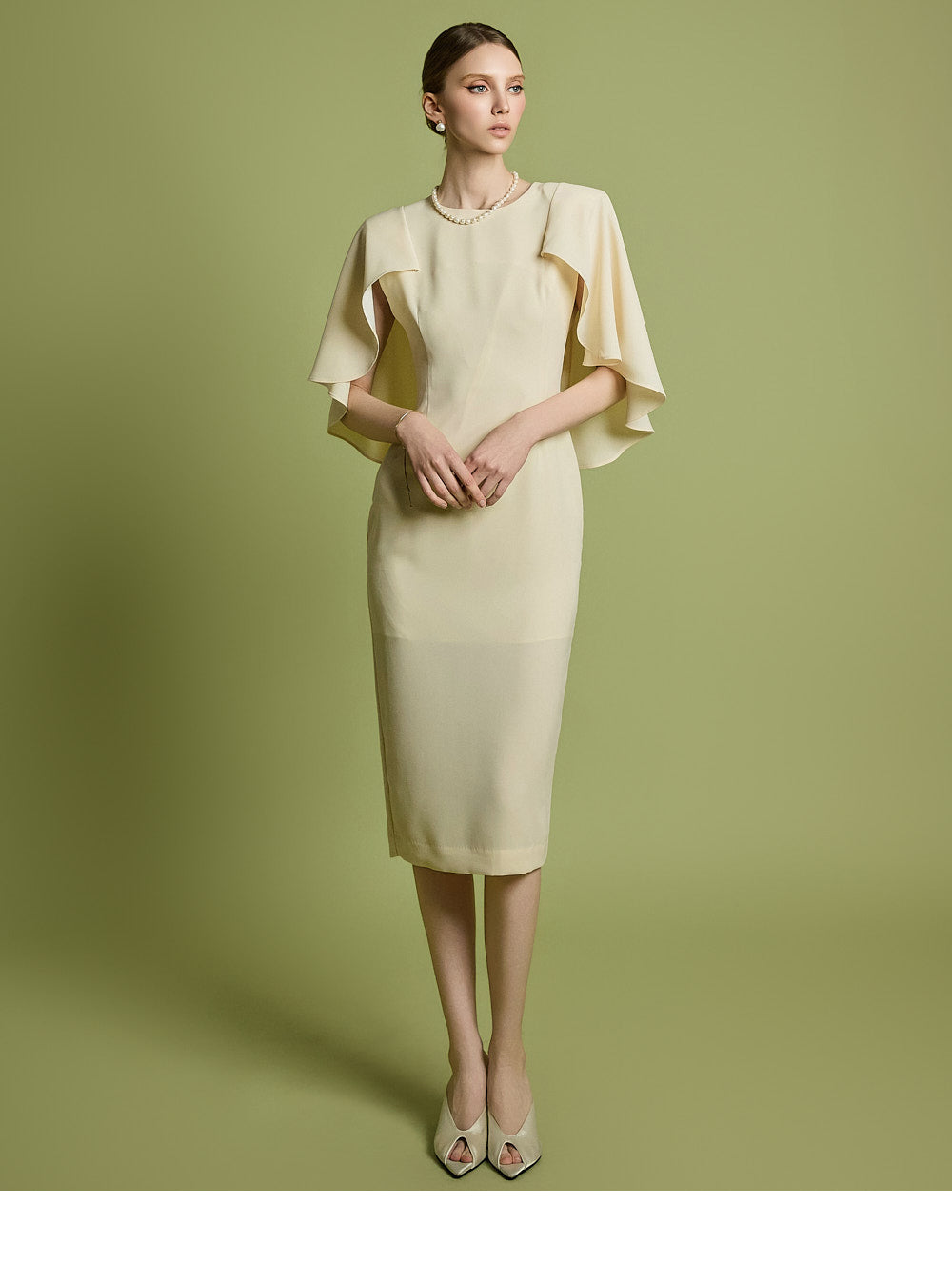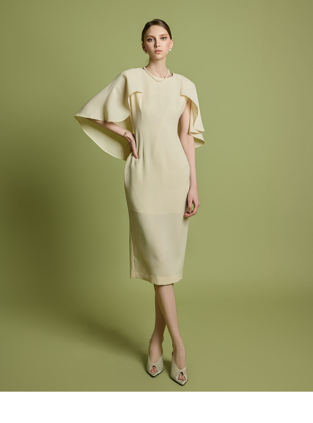 肩のケープディテールがスタイリッシュなアクセントになっています。