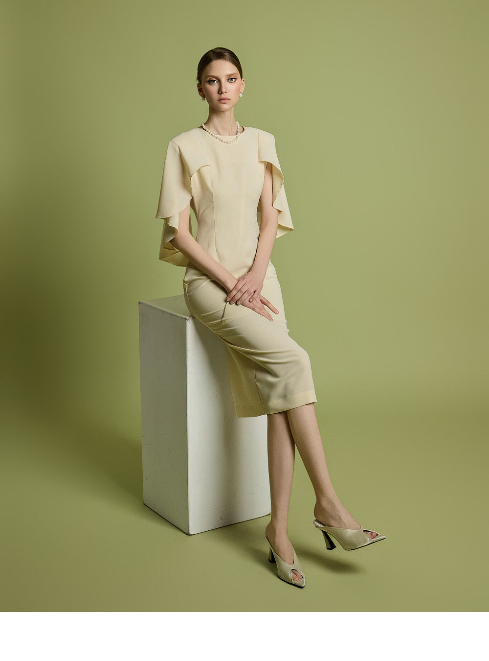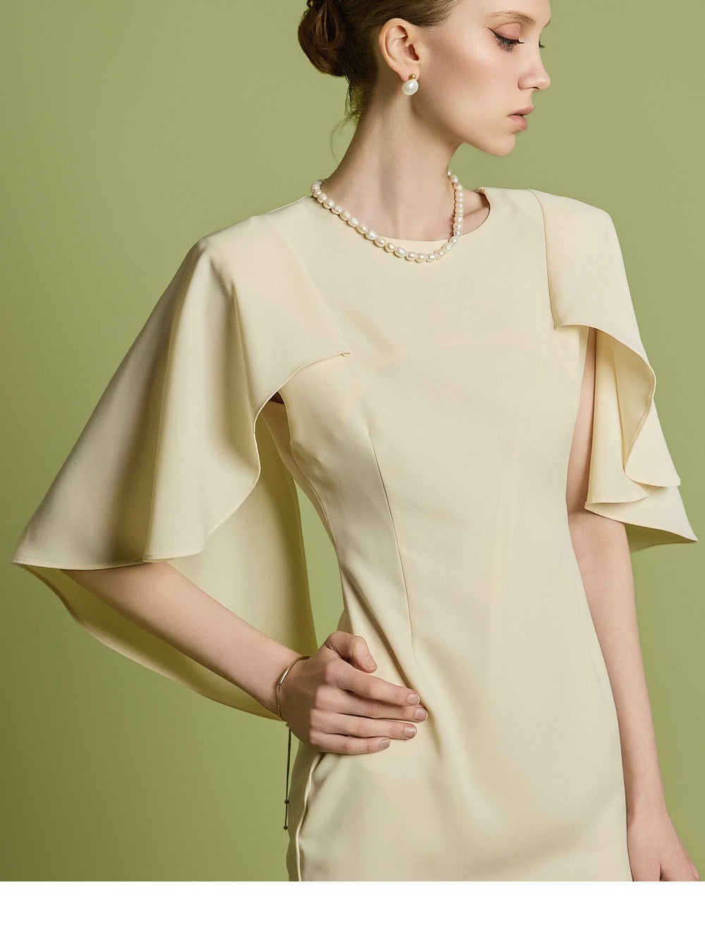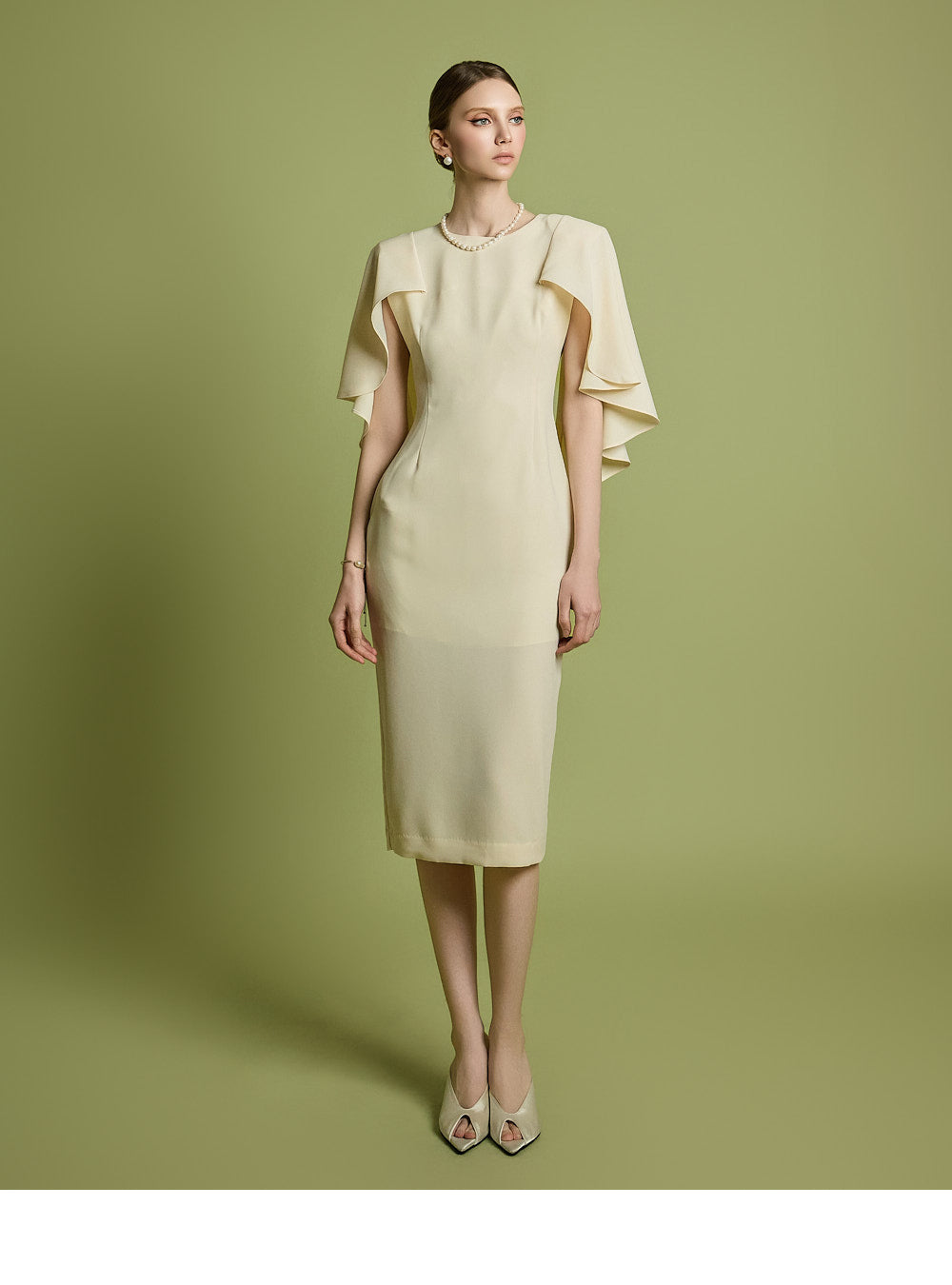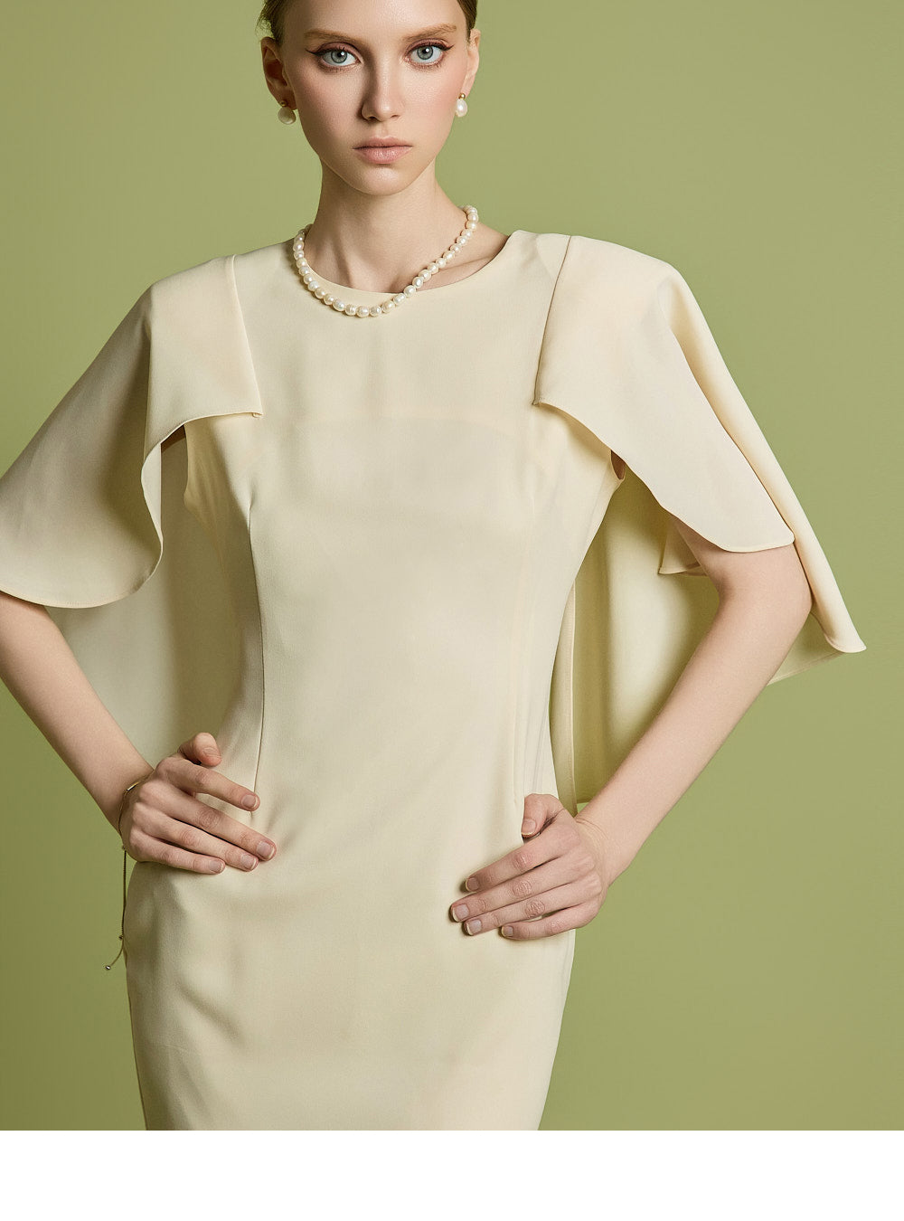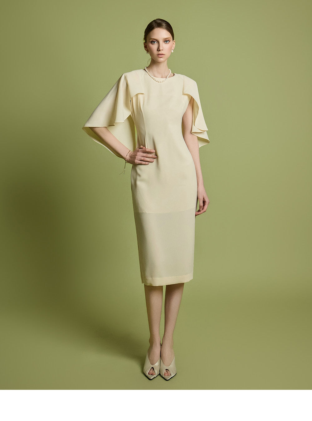 肩のケープディテールがスタイリッシュなアクセントになっています。