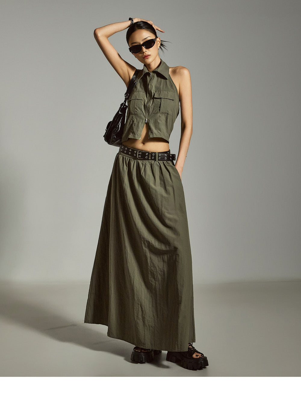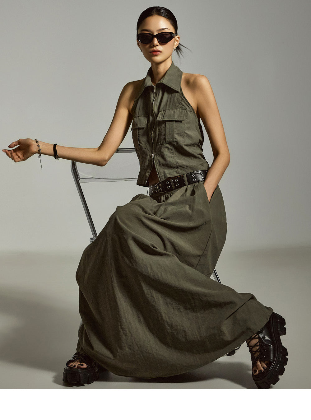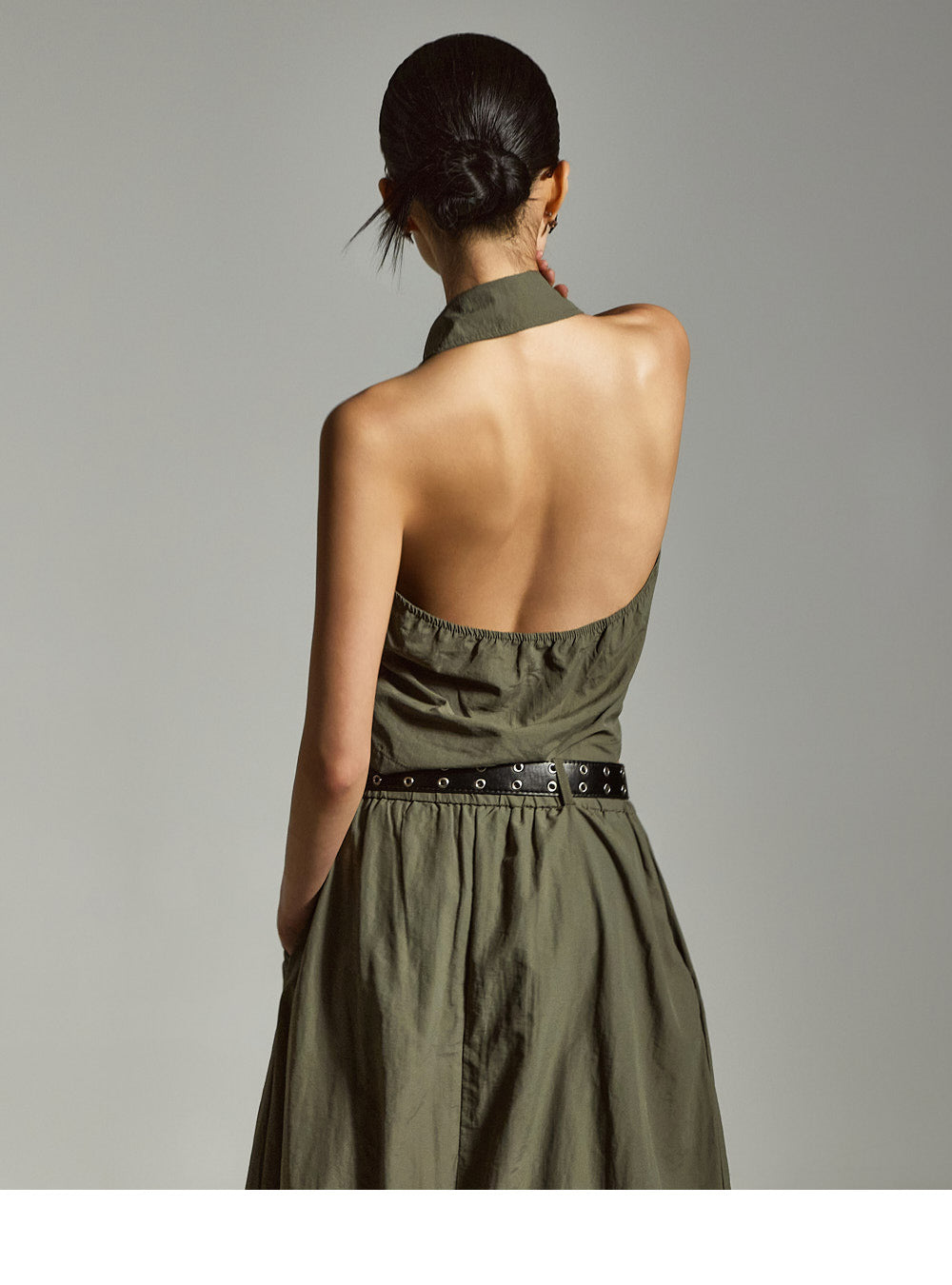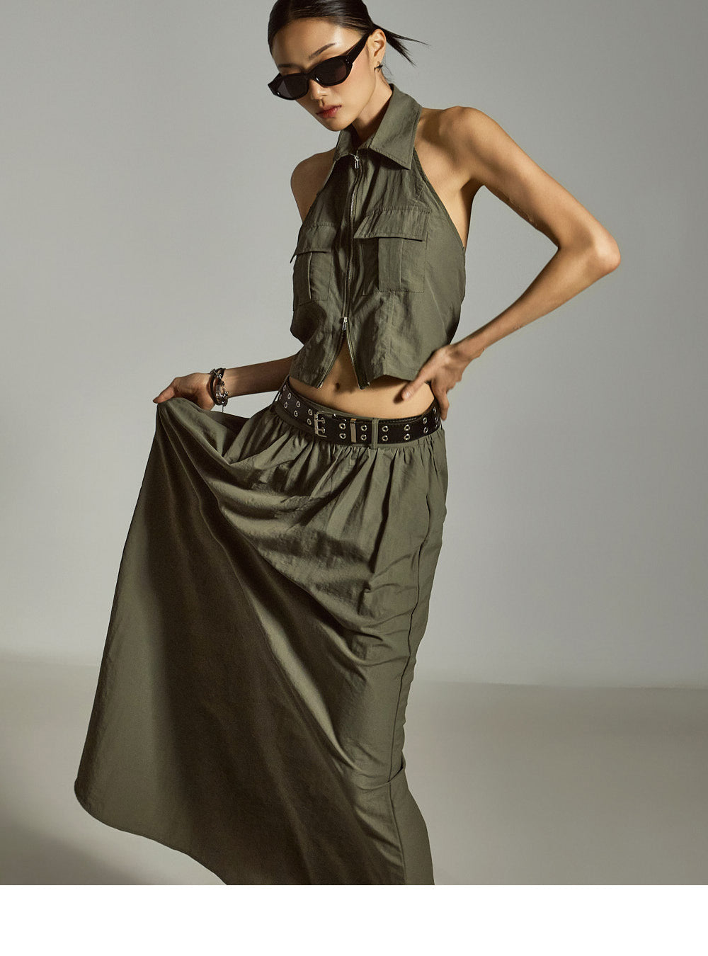 ホルターネックのクロップトップはスリムなシルエットを演出し、