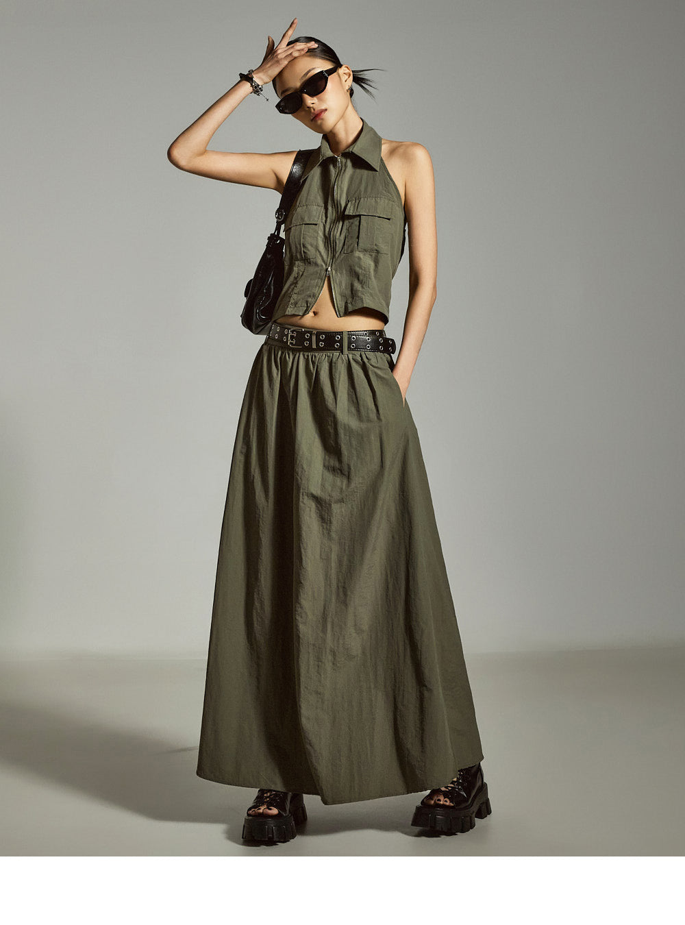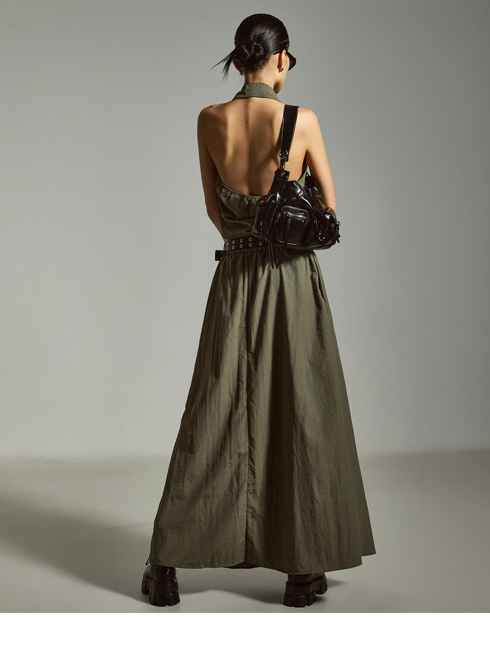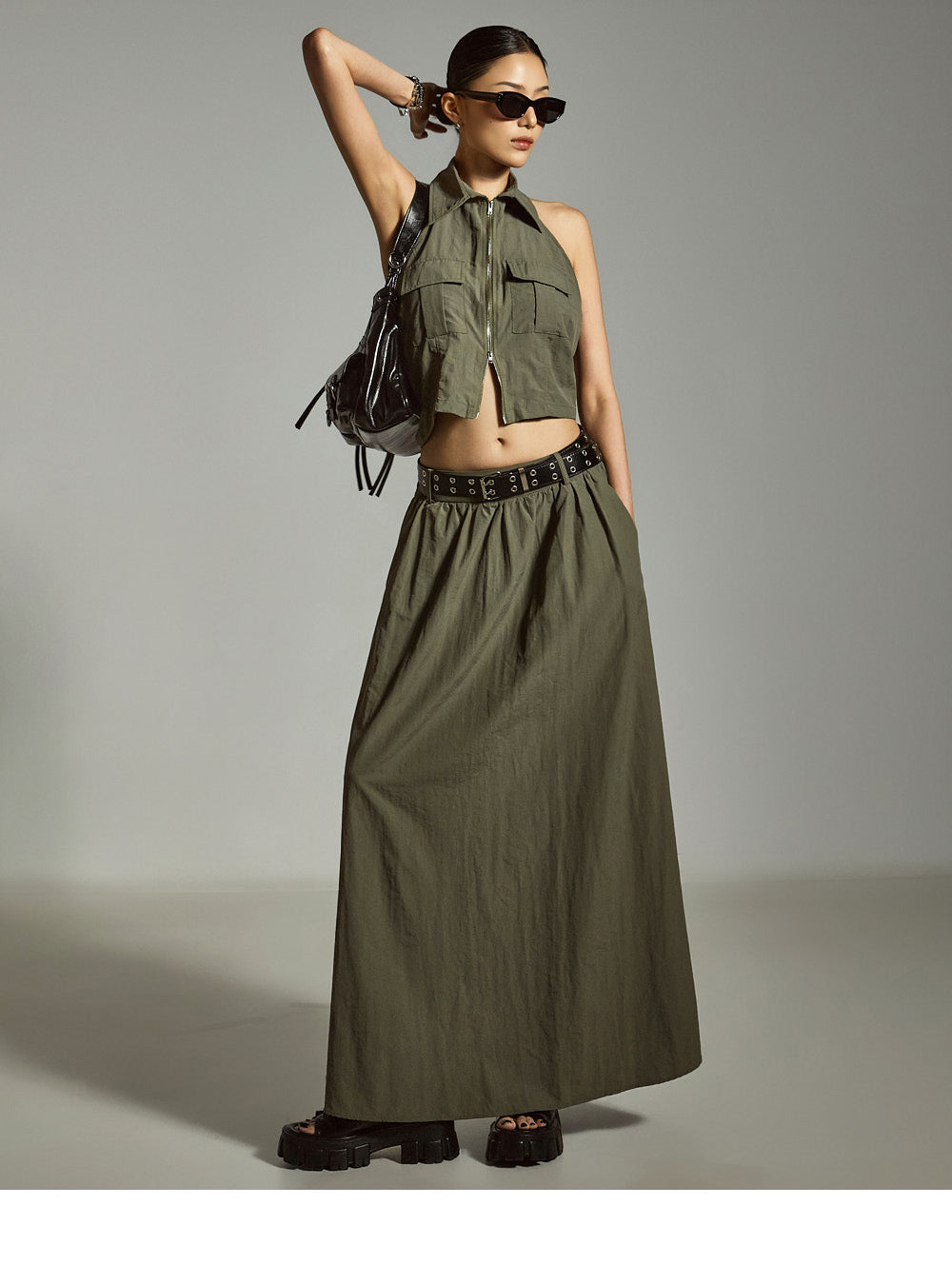 ホルターネックのクロップトップはスリムなシルエットを演出し、