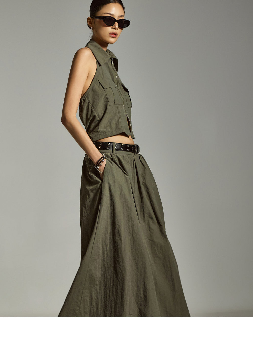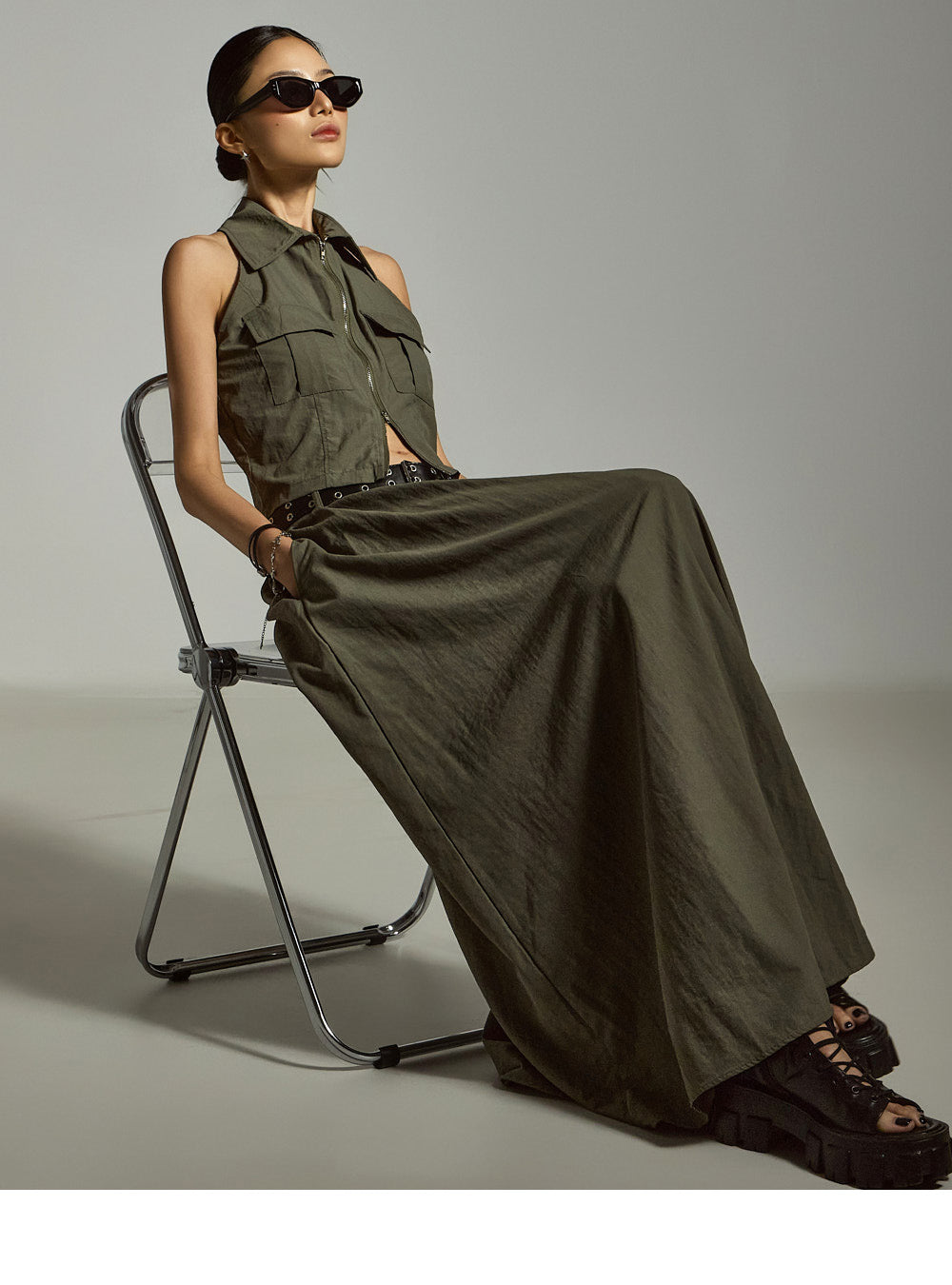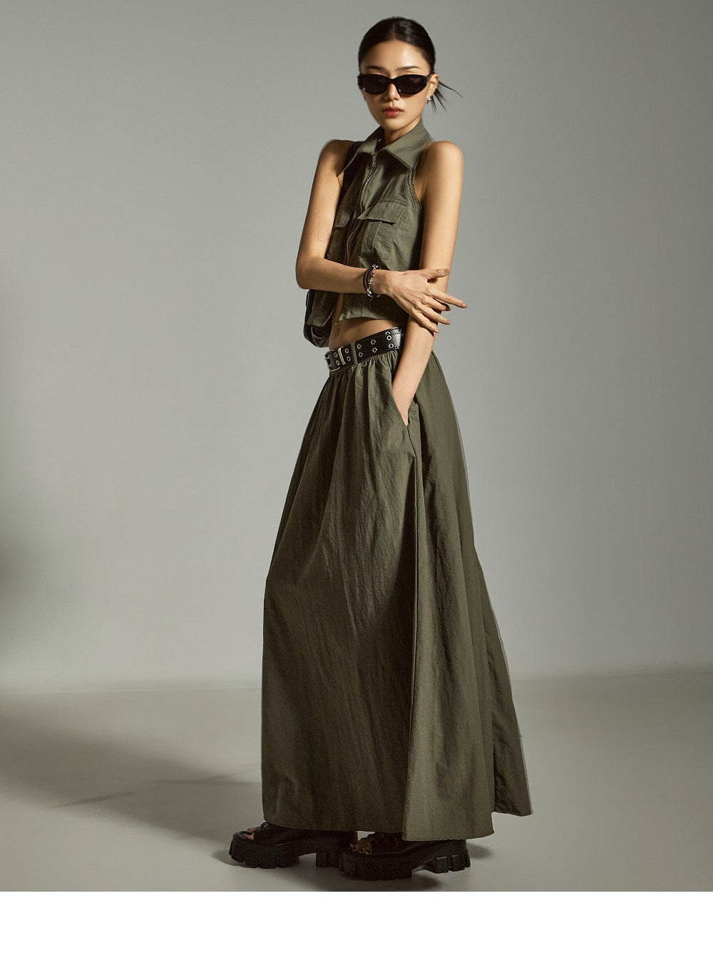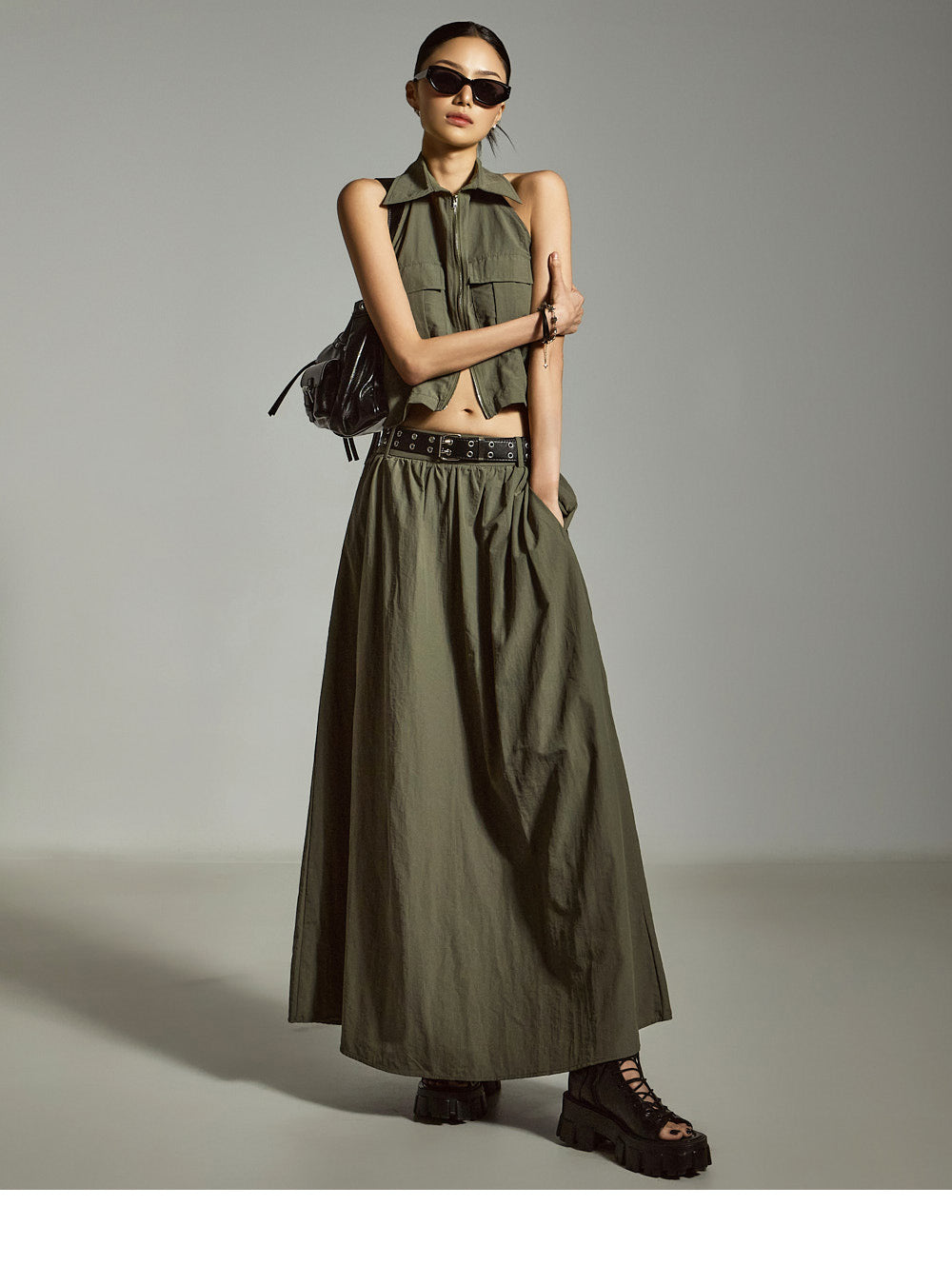 ホルターネックのクロップトップはスリムなシルエットを演出し、