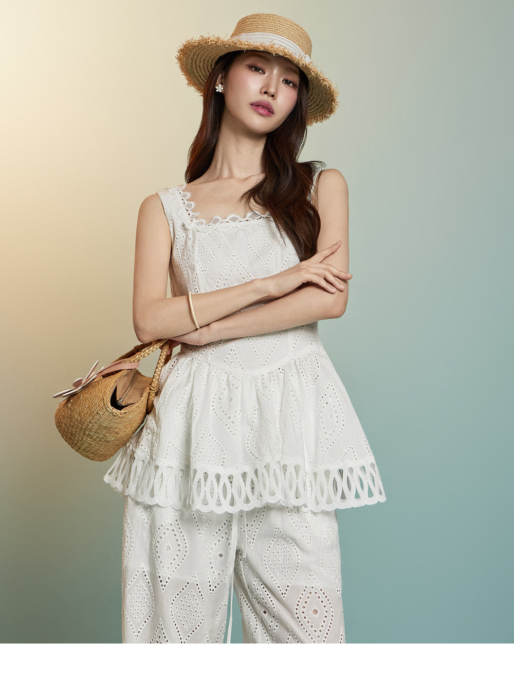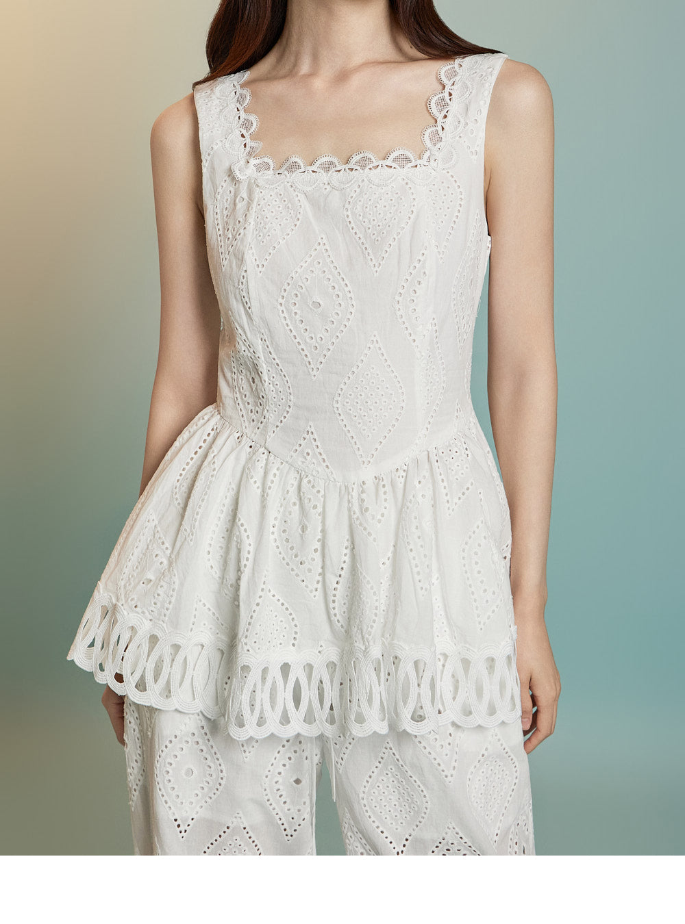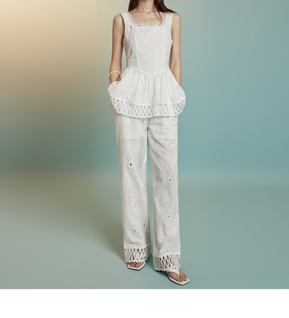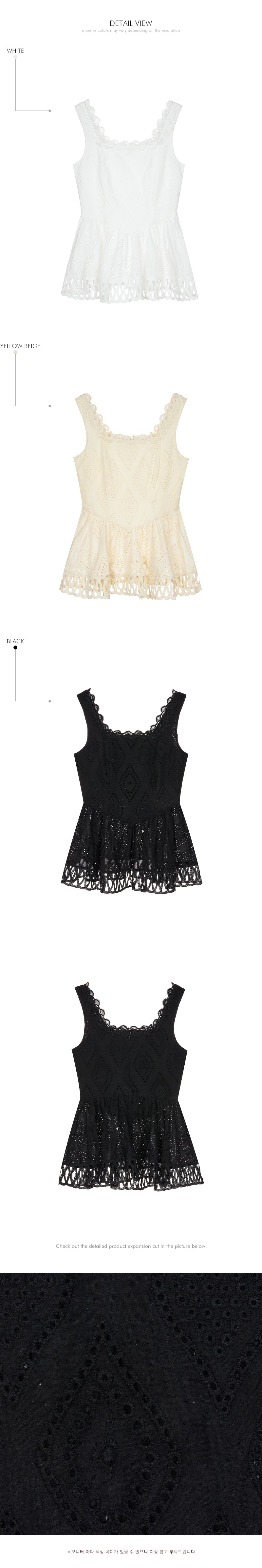 トップスはアイレット生地とノースリーブが特徴です