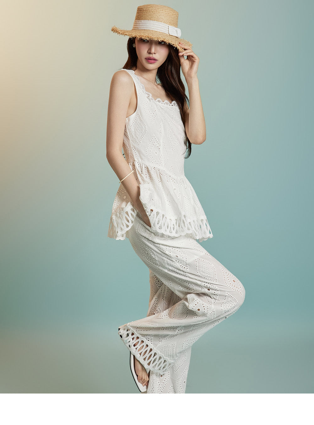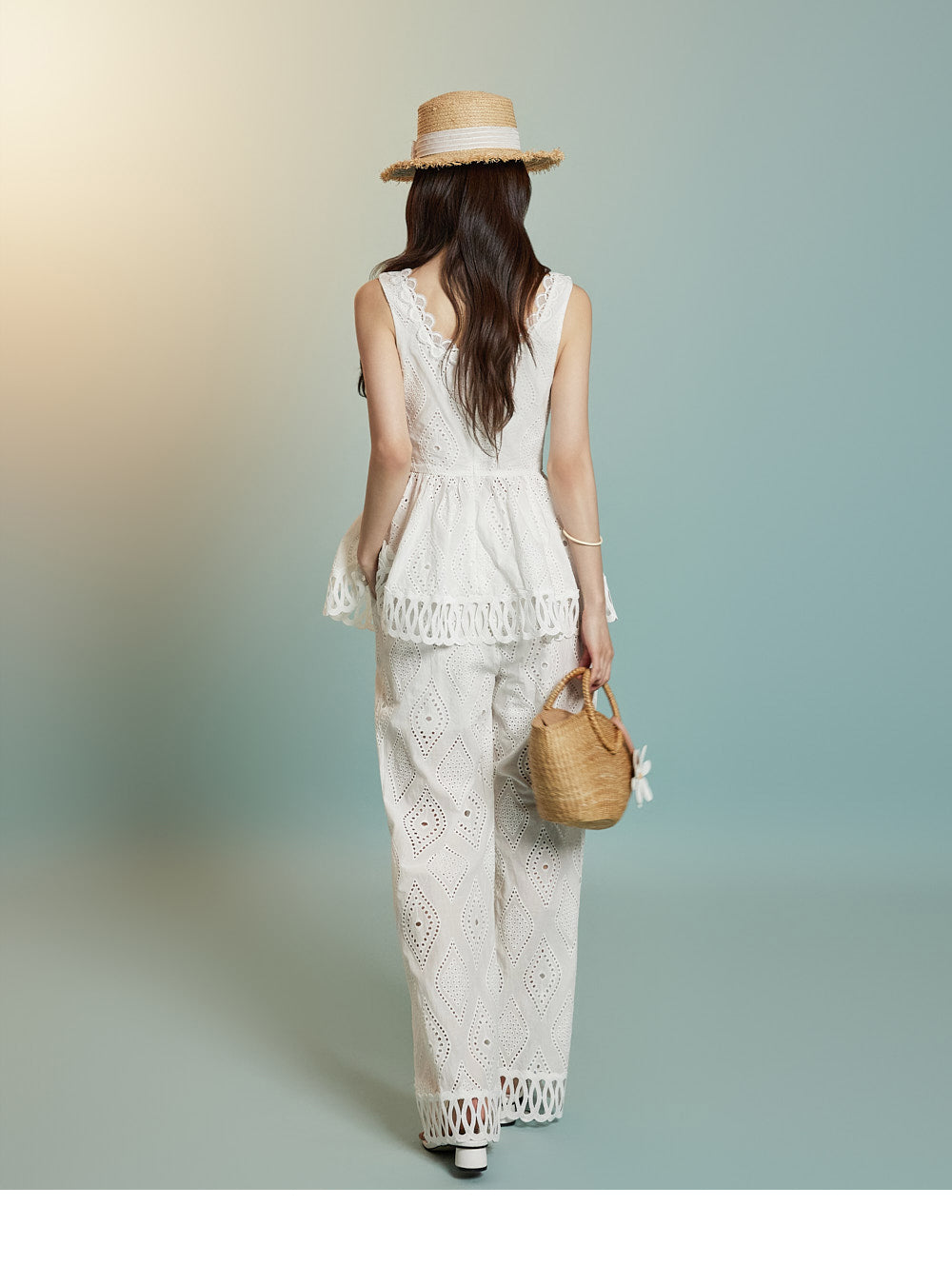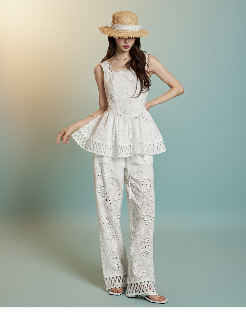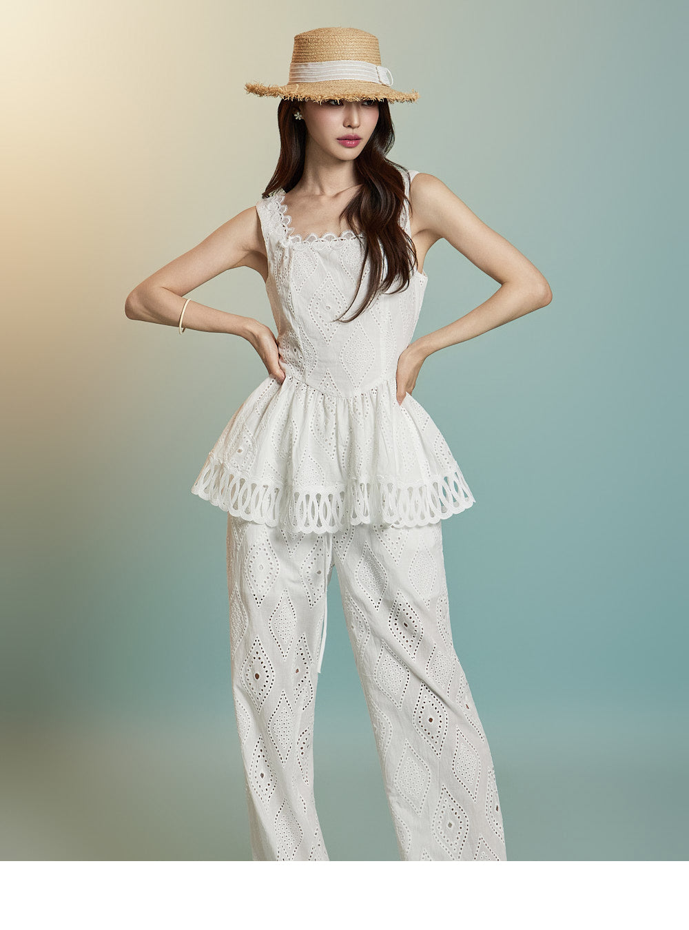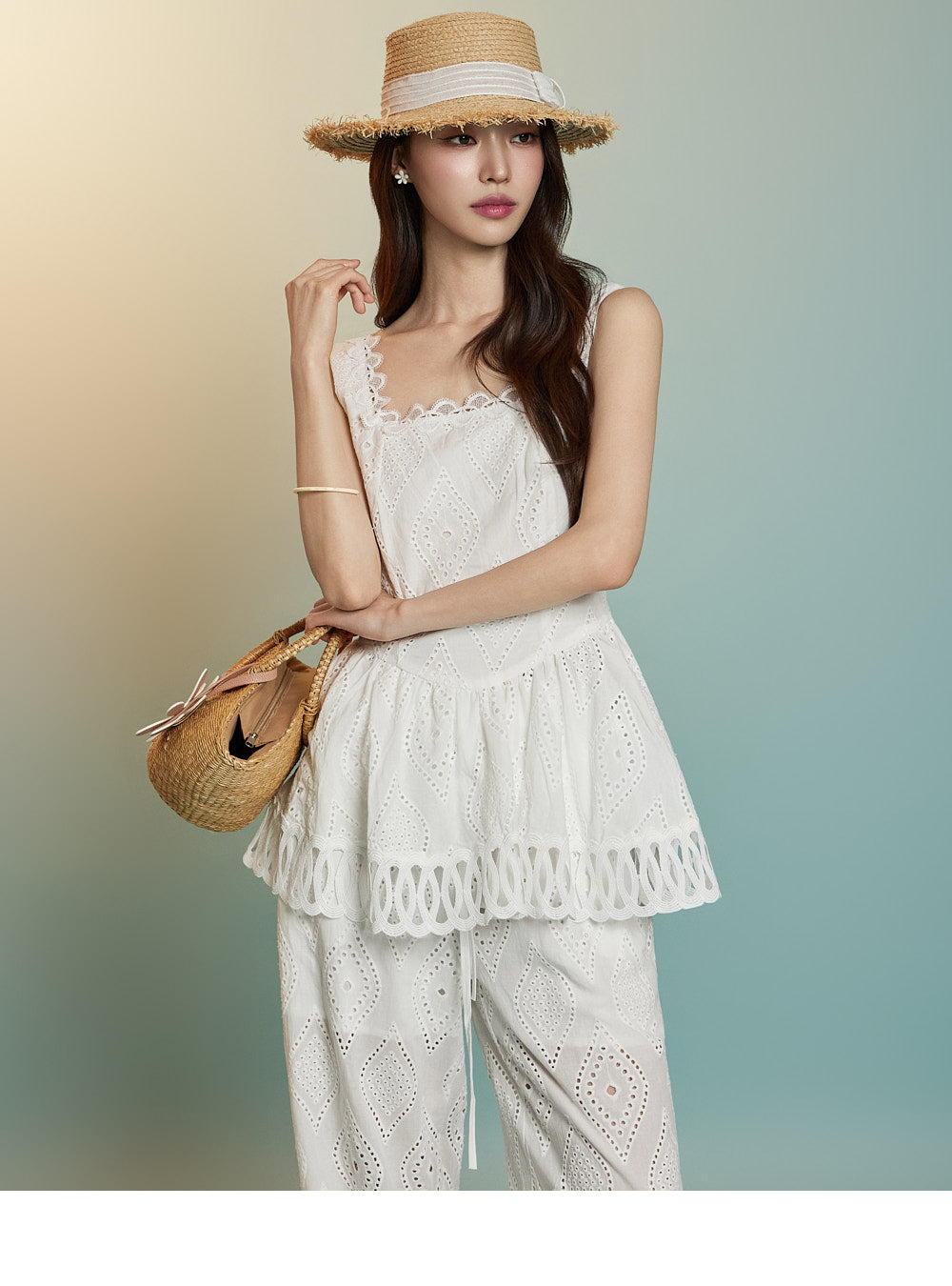 トップスはアイレット生地とノースリーブが特徴です