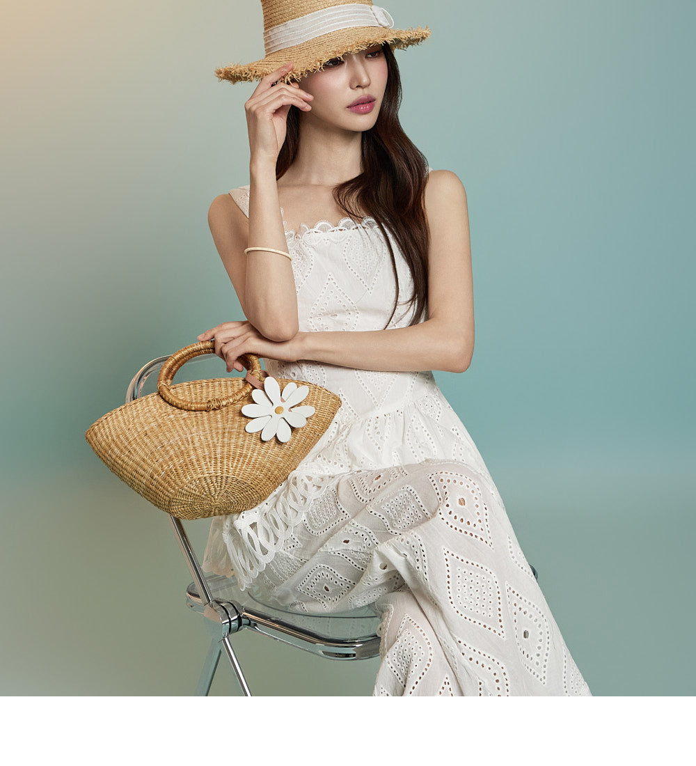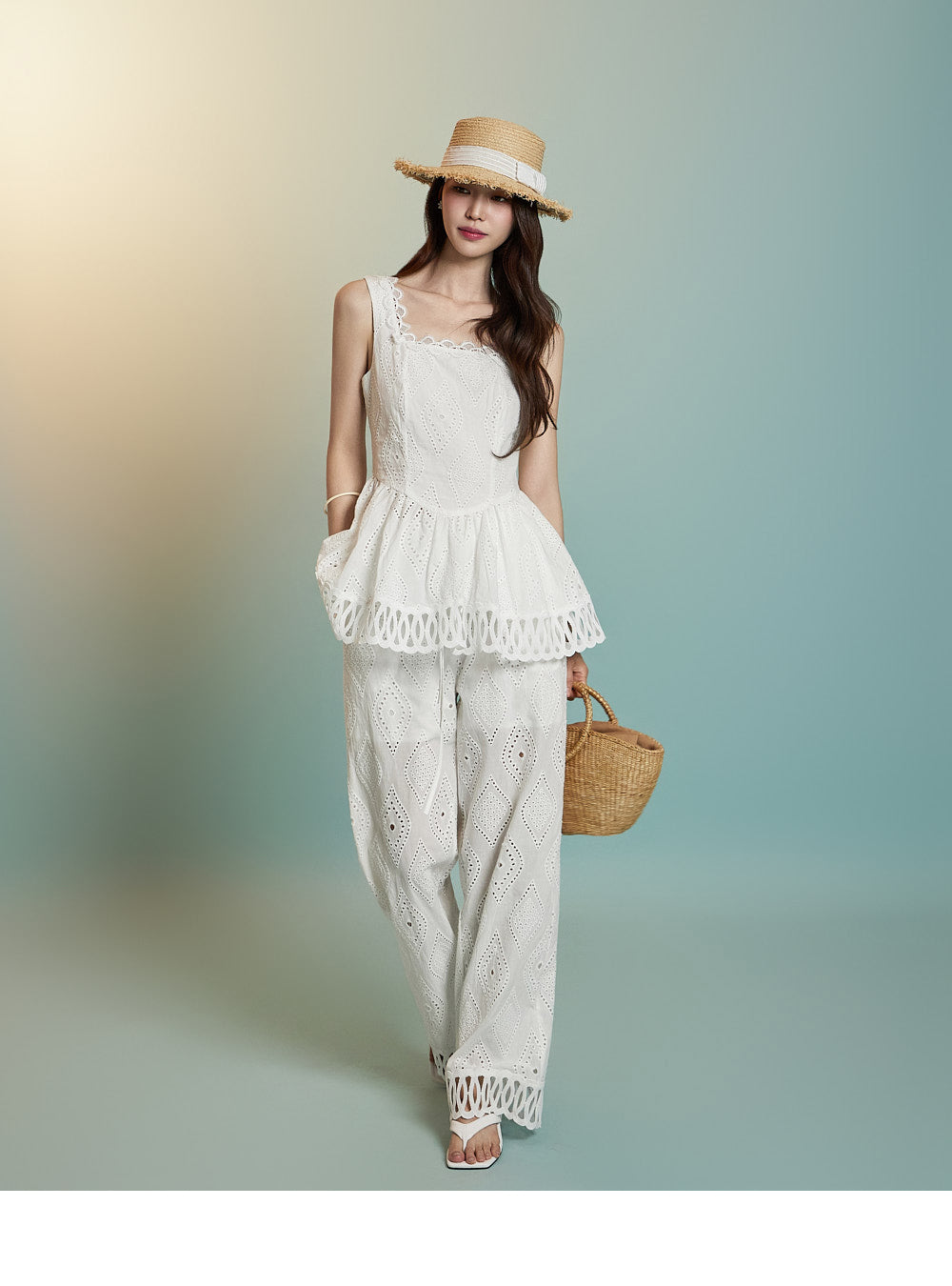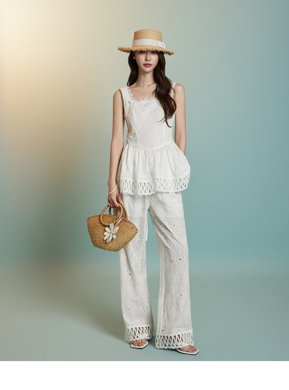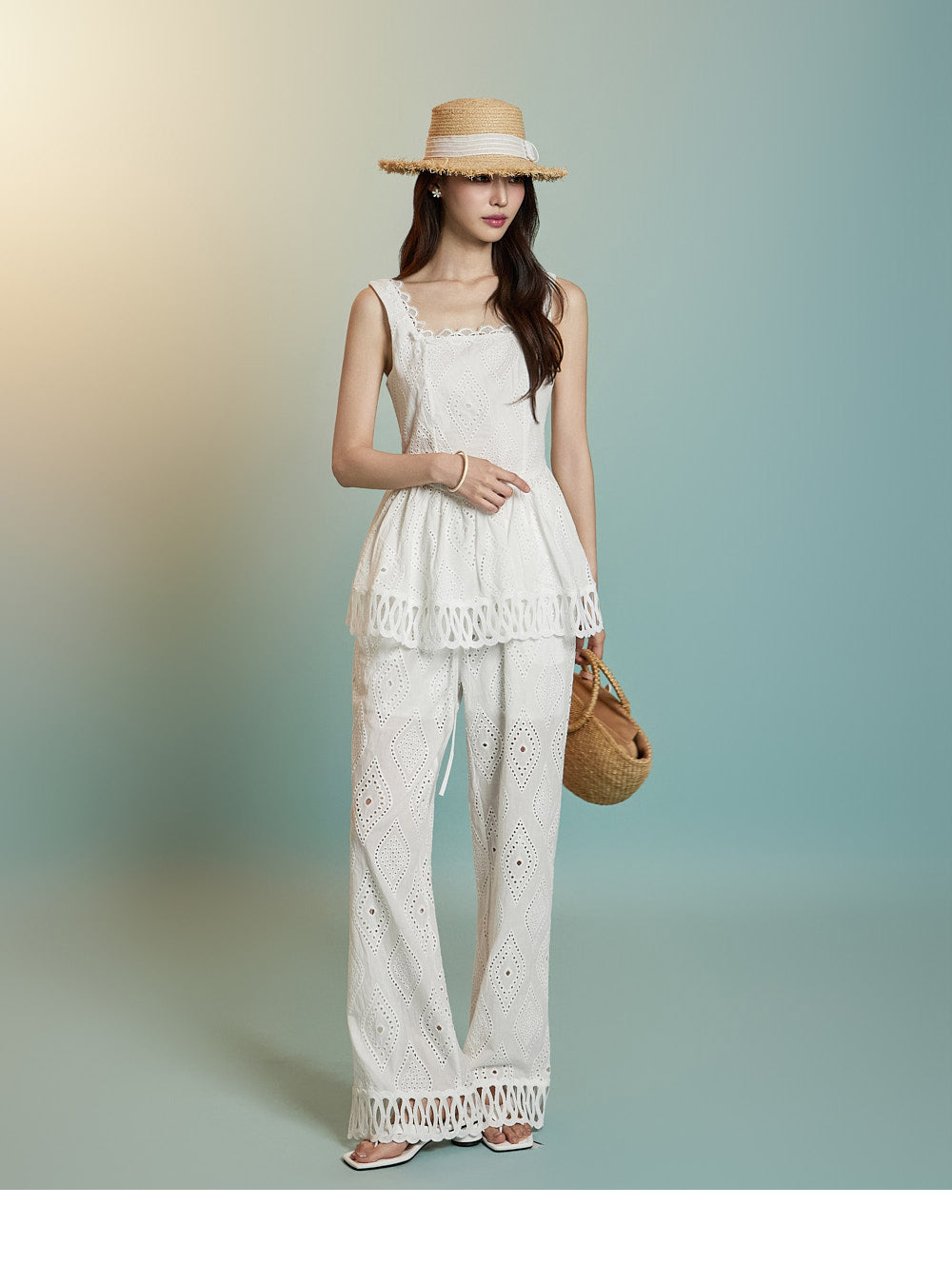 トップスはアイレット生地とノースリーブが特徴です