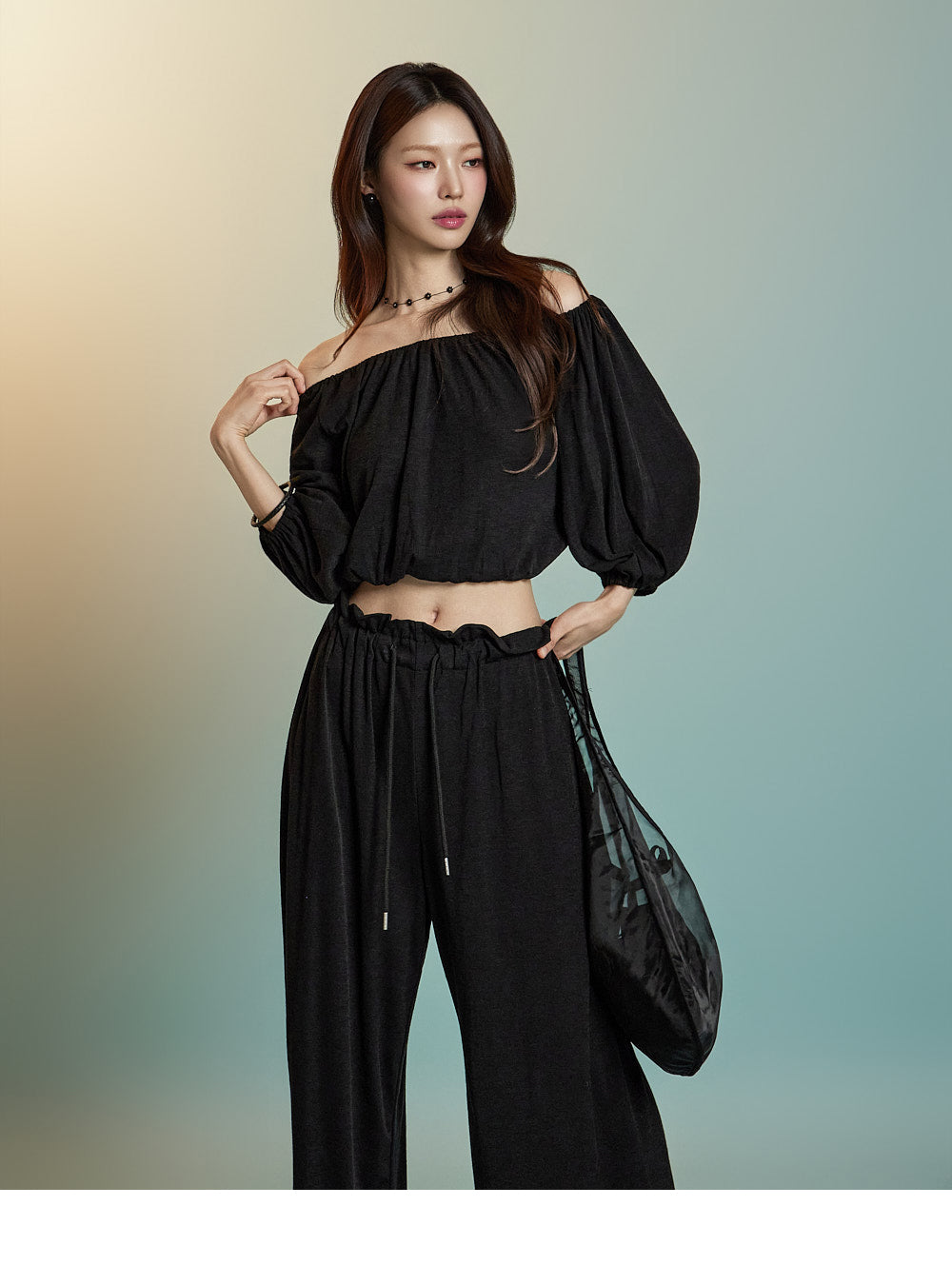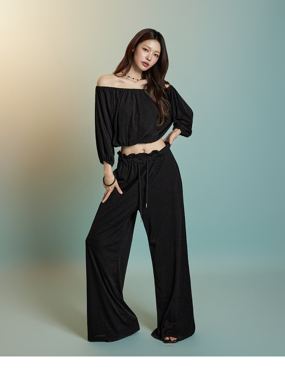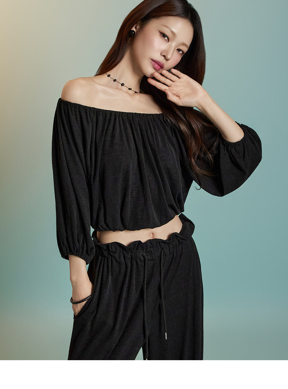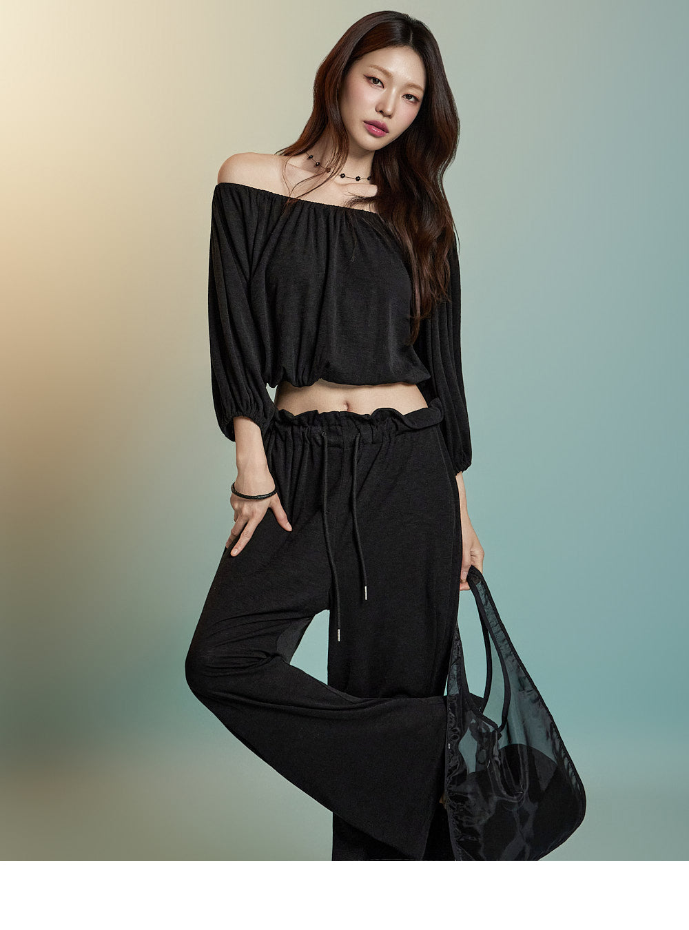 トップスはオフショルダーデザインで、クロップド丈です。