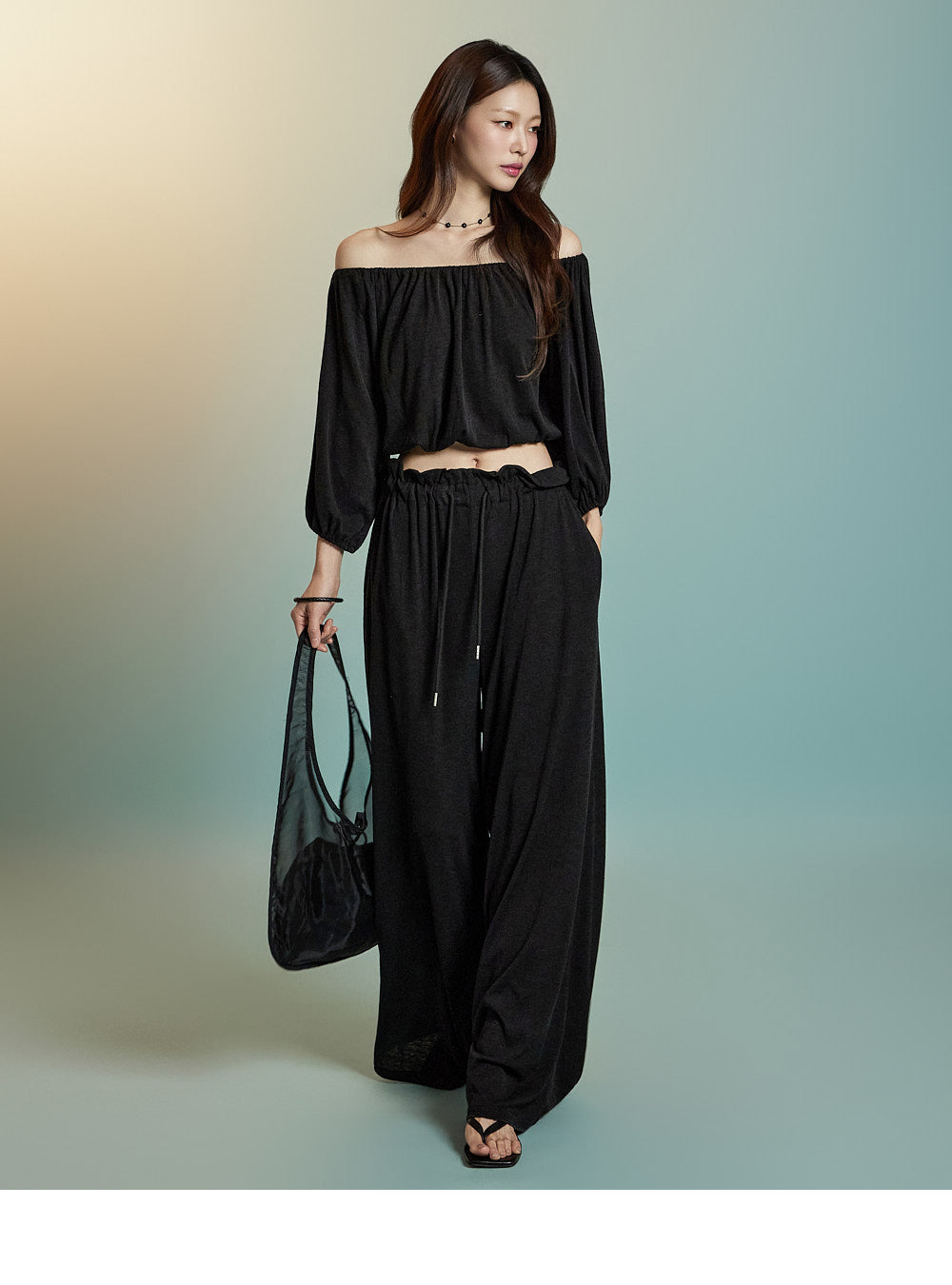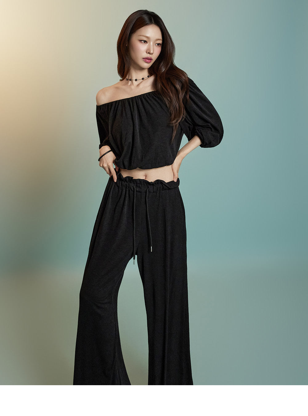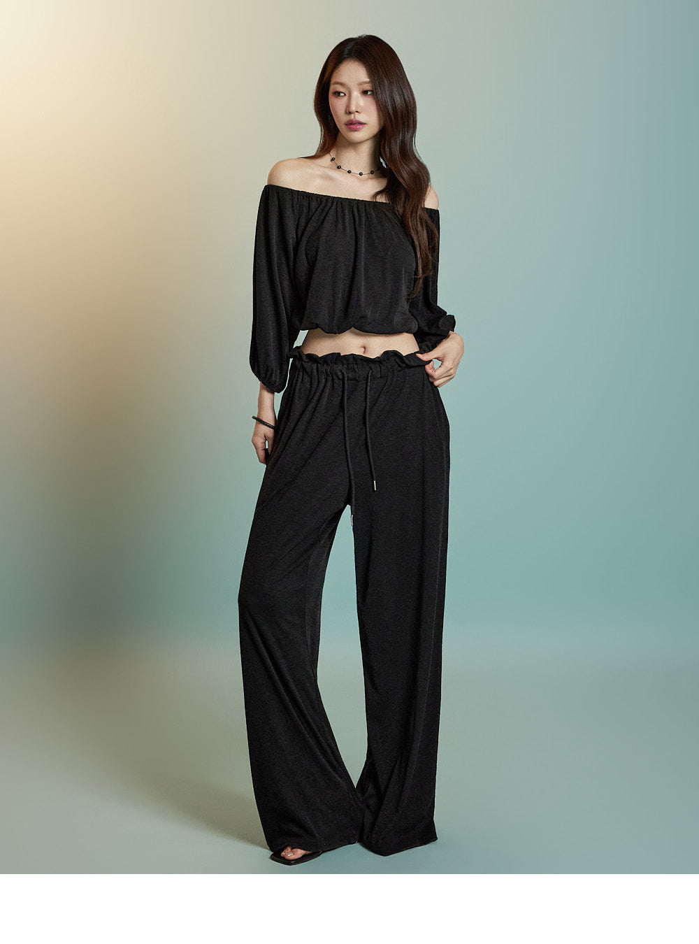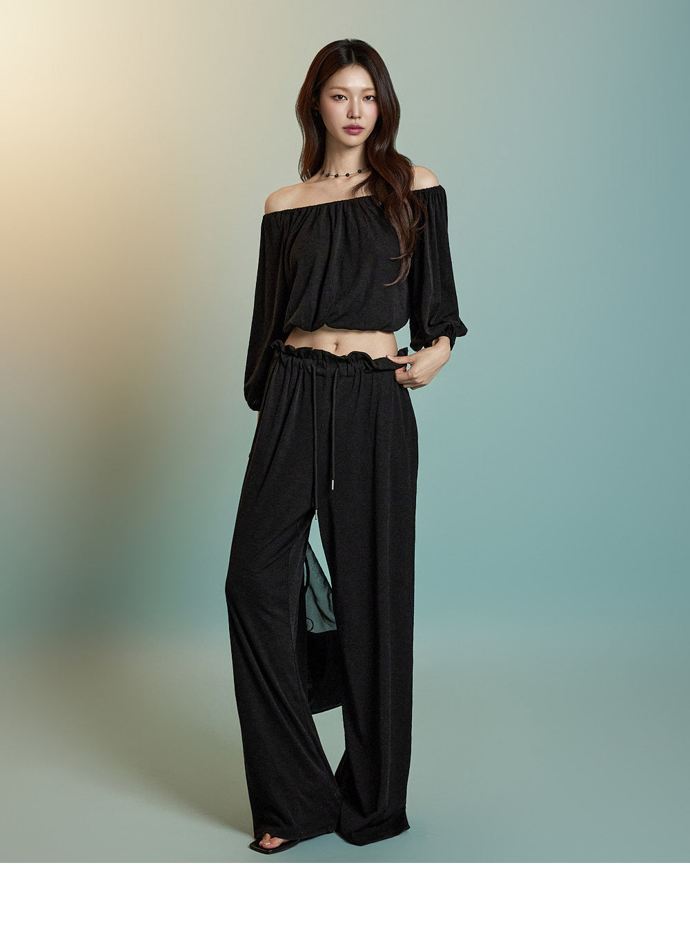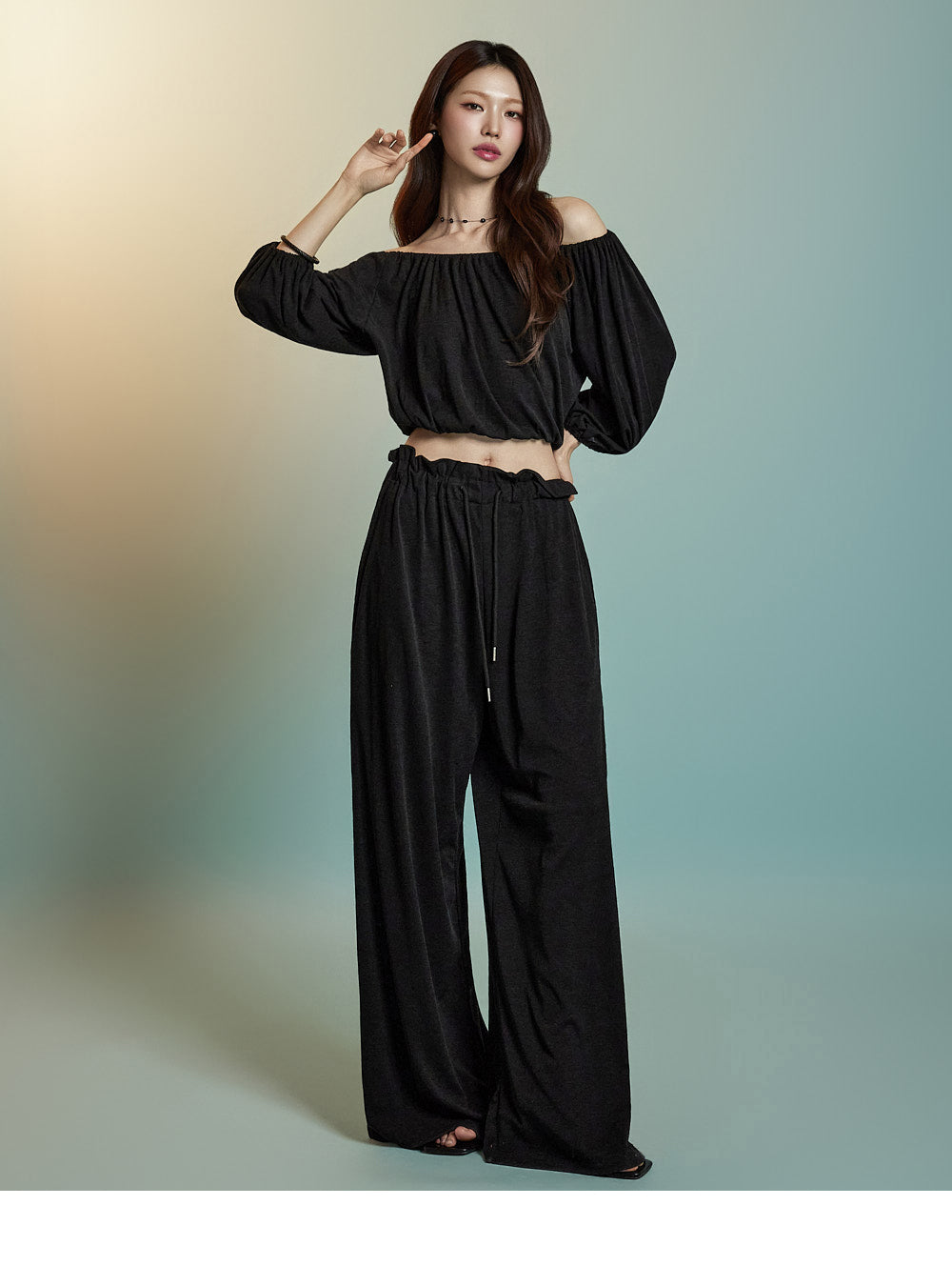 トップスはオフショルダーデザインで、クロップド丈です。