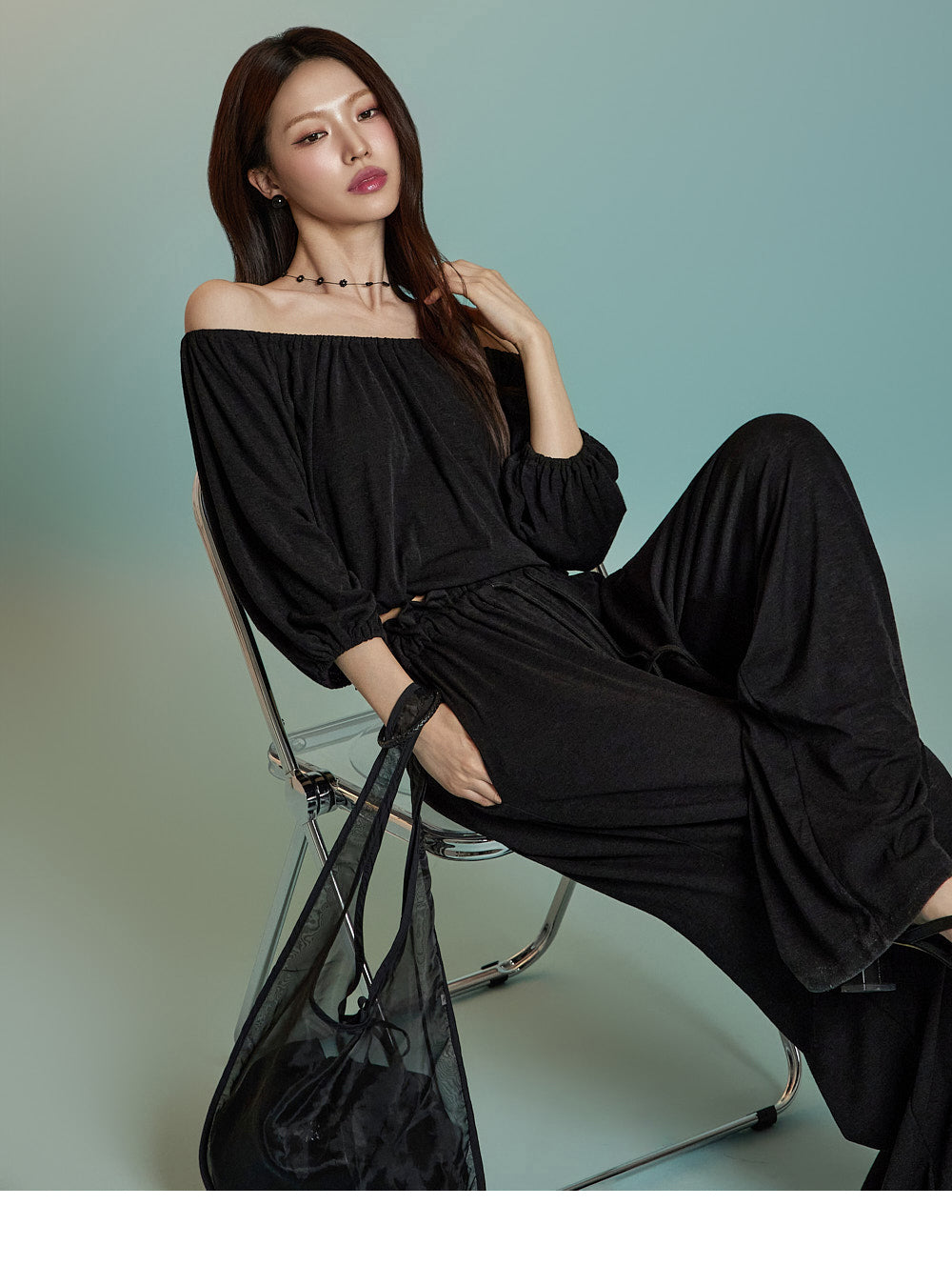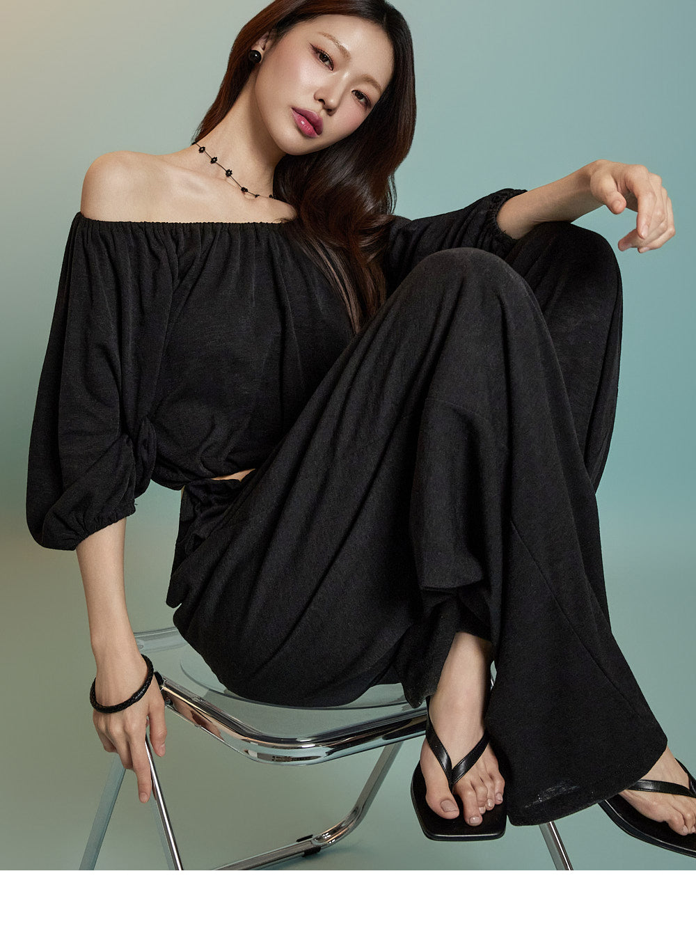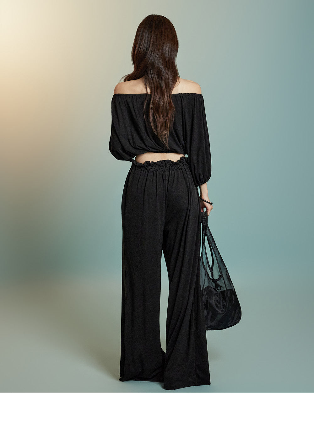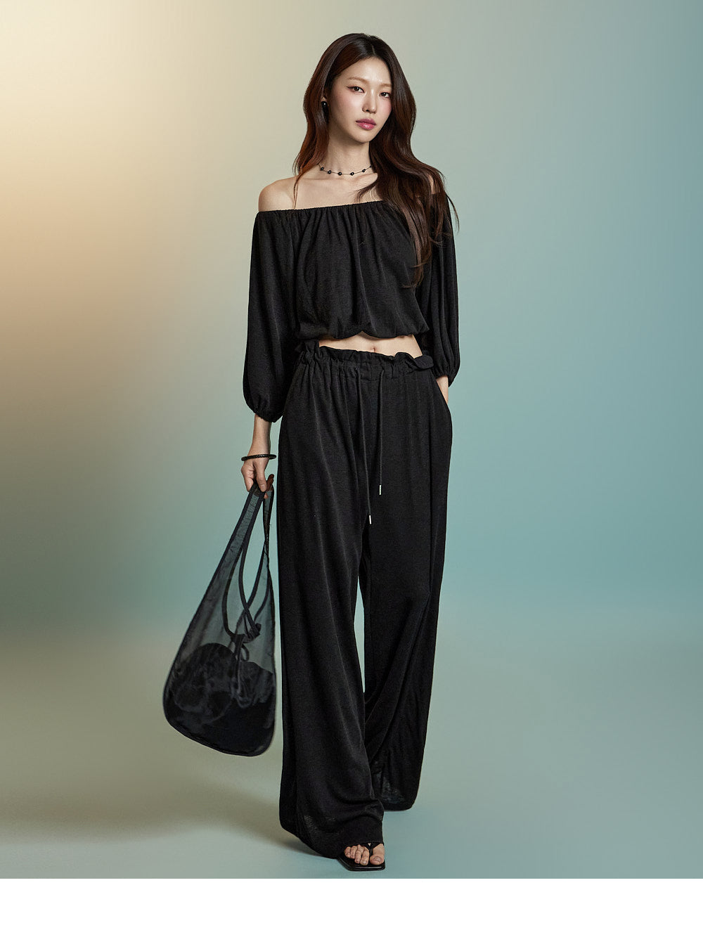 トップスはオフショルダーデザインで、クロップド丈です。