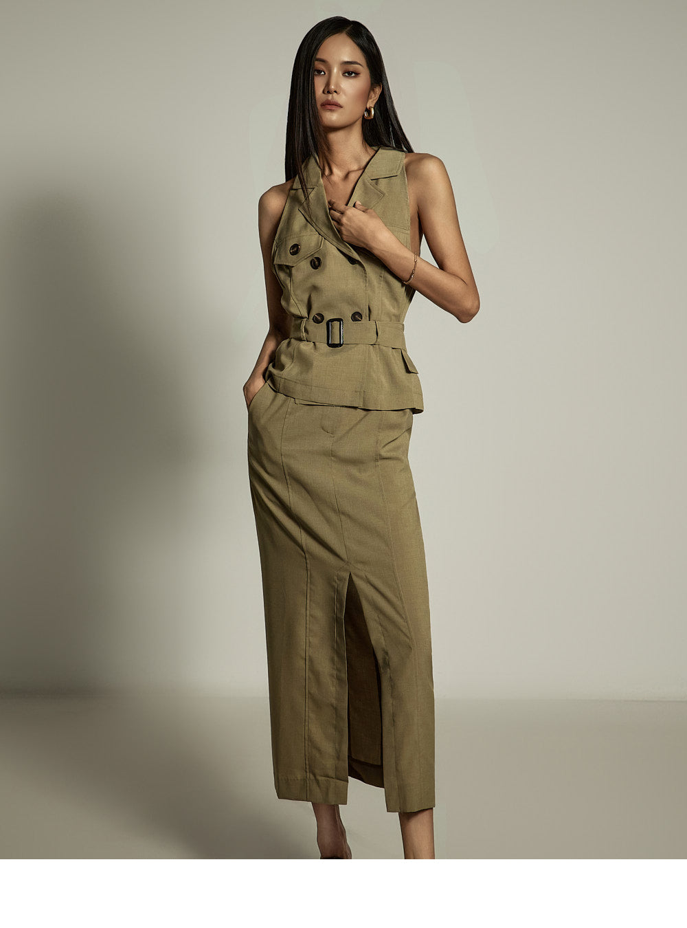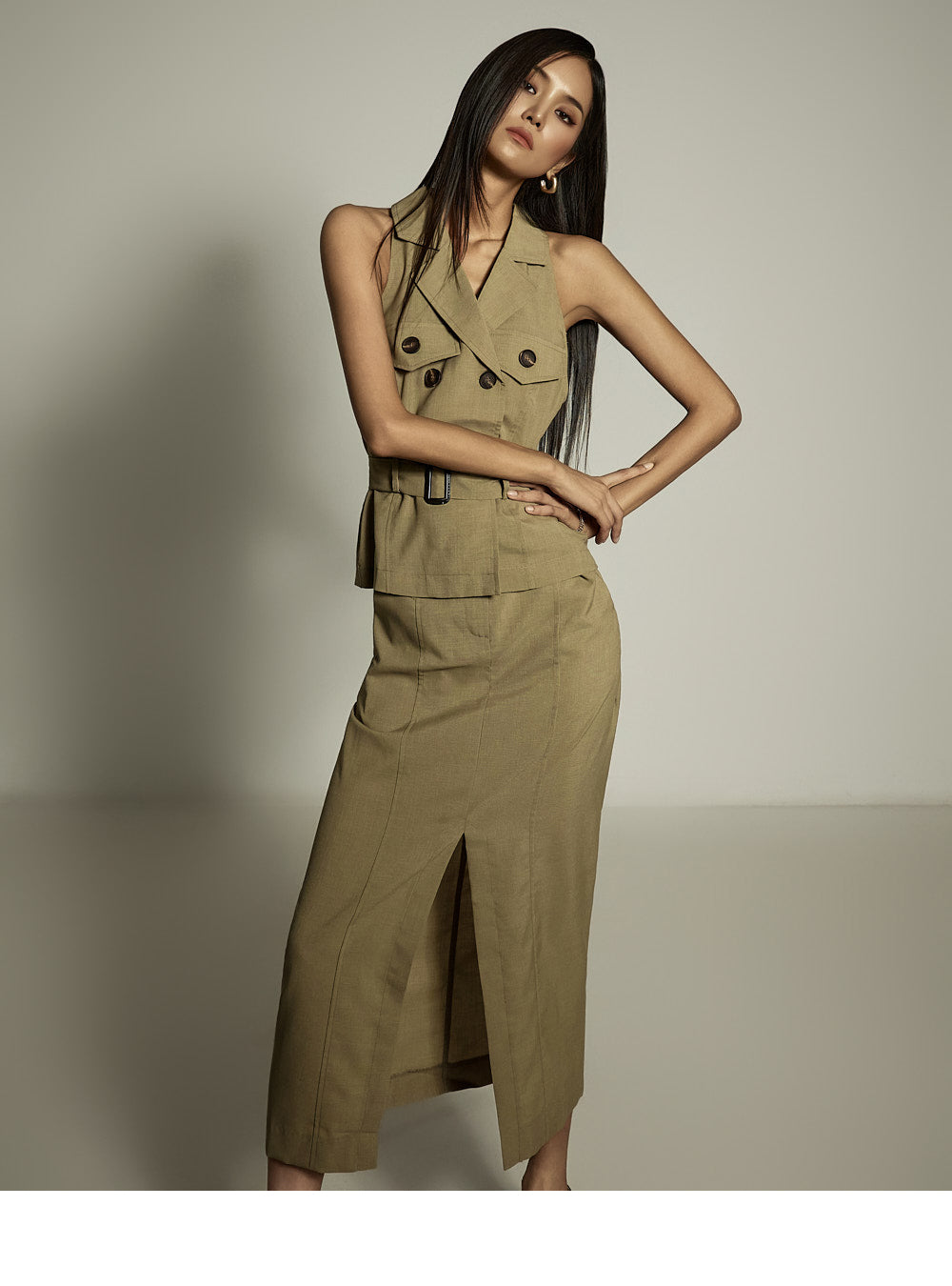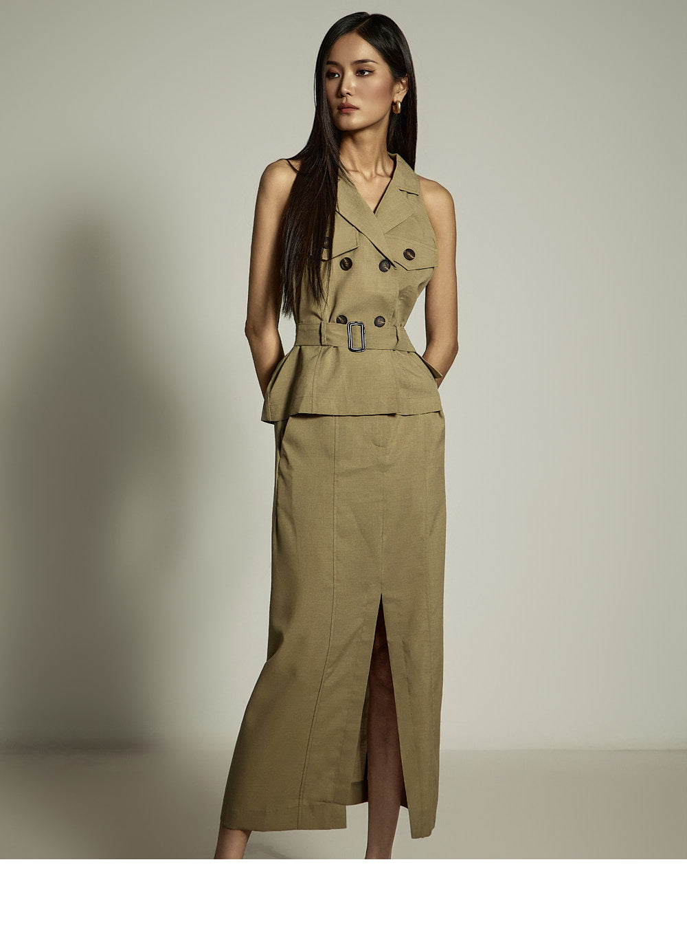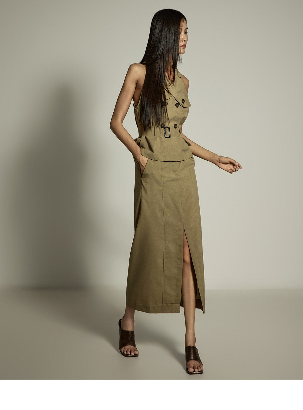 フロントにはジッパーとボタン、サイドポケット、裾スリットを施し、実用性と動きやすさを高めています。