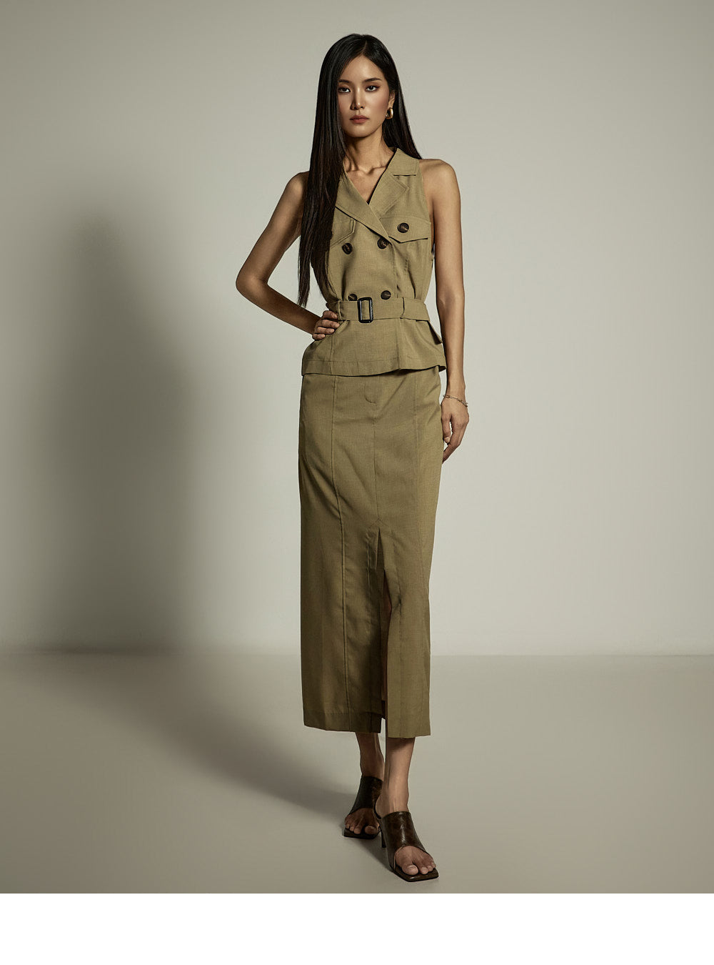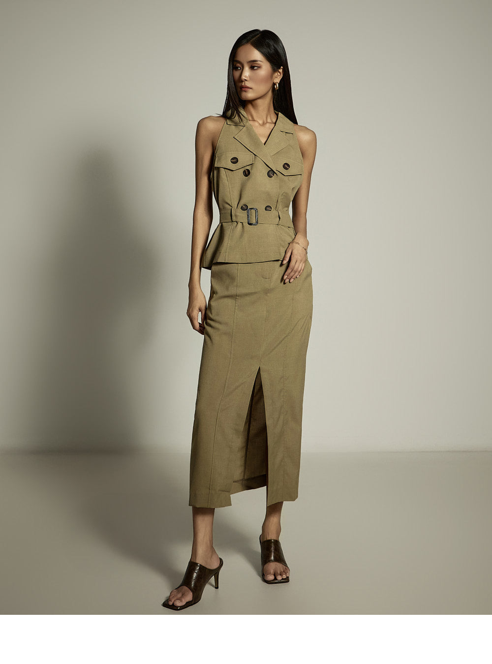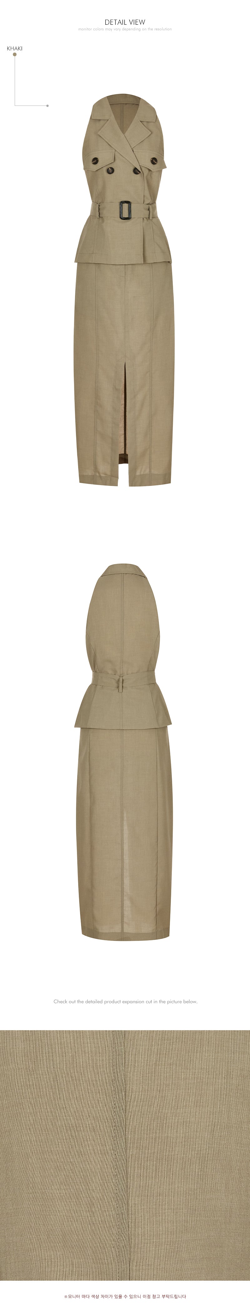 フロントにはジッパーとボタン、サイドポケット、裾スリットを施し、実用性と動きやすさを高めています。