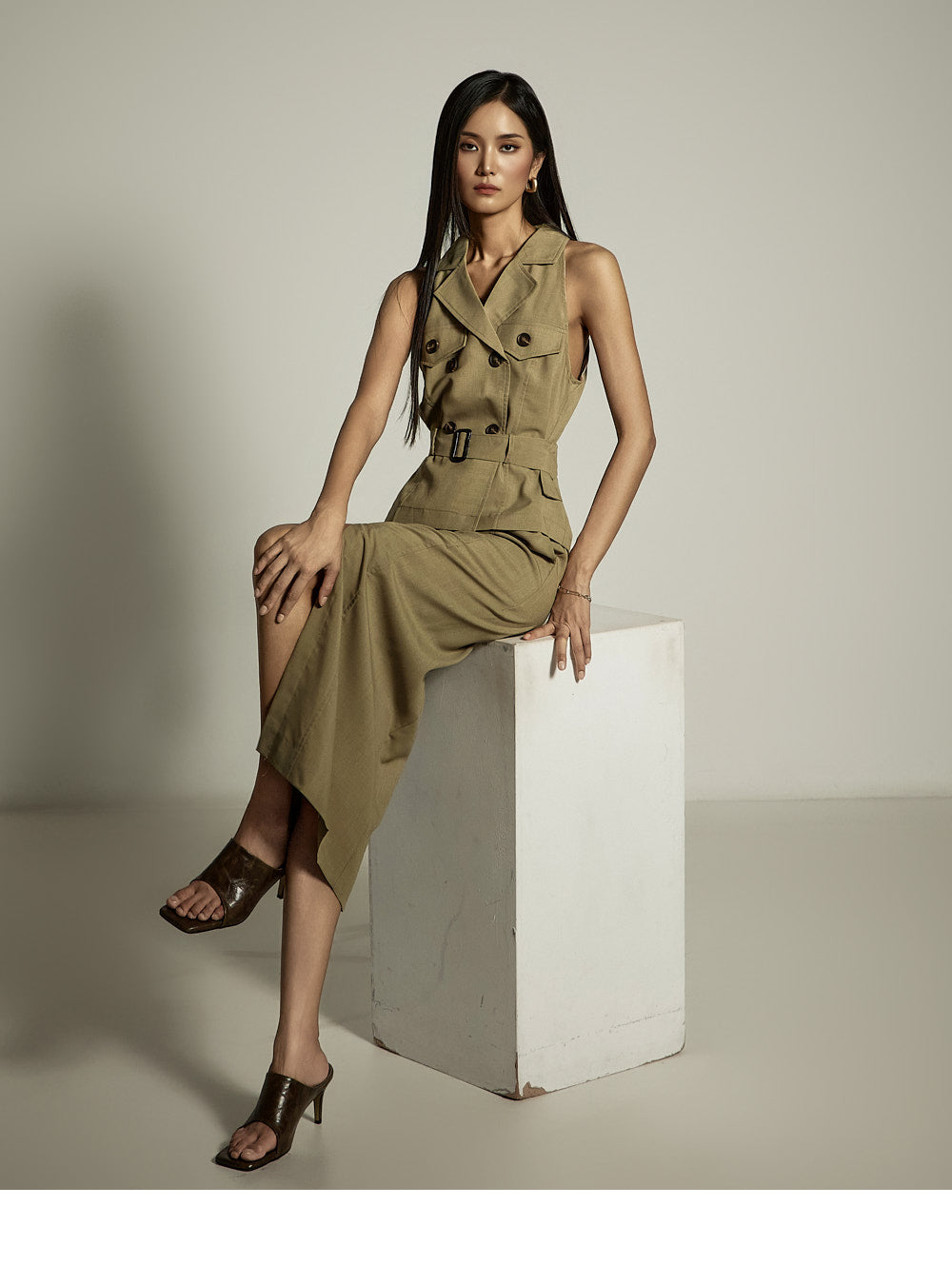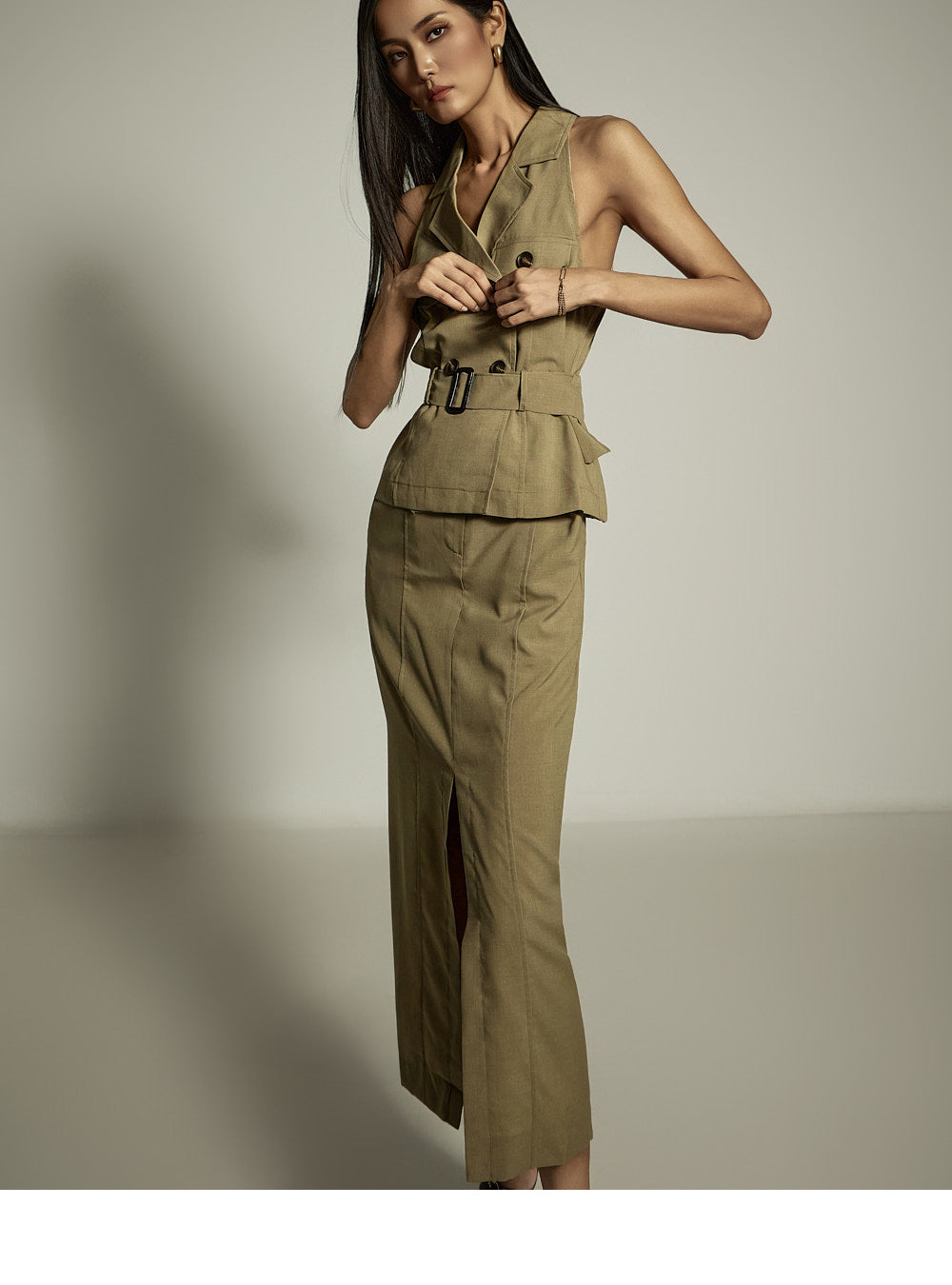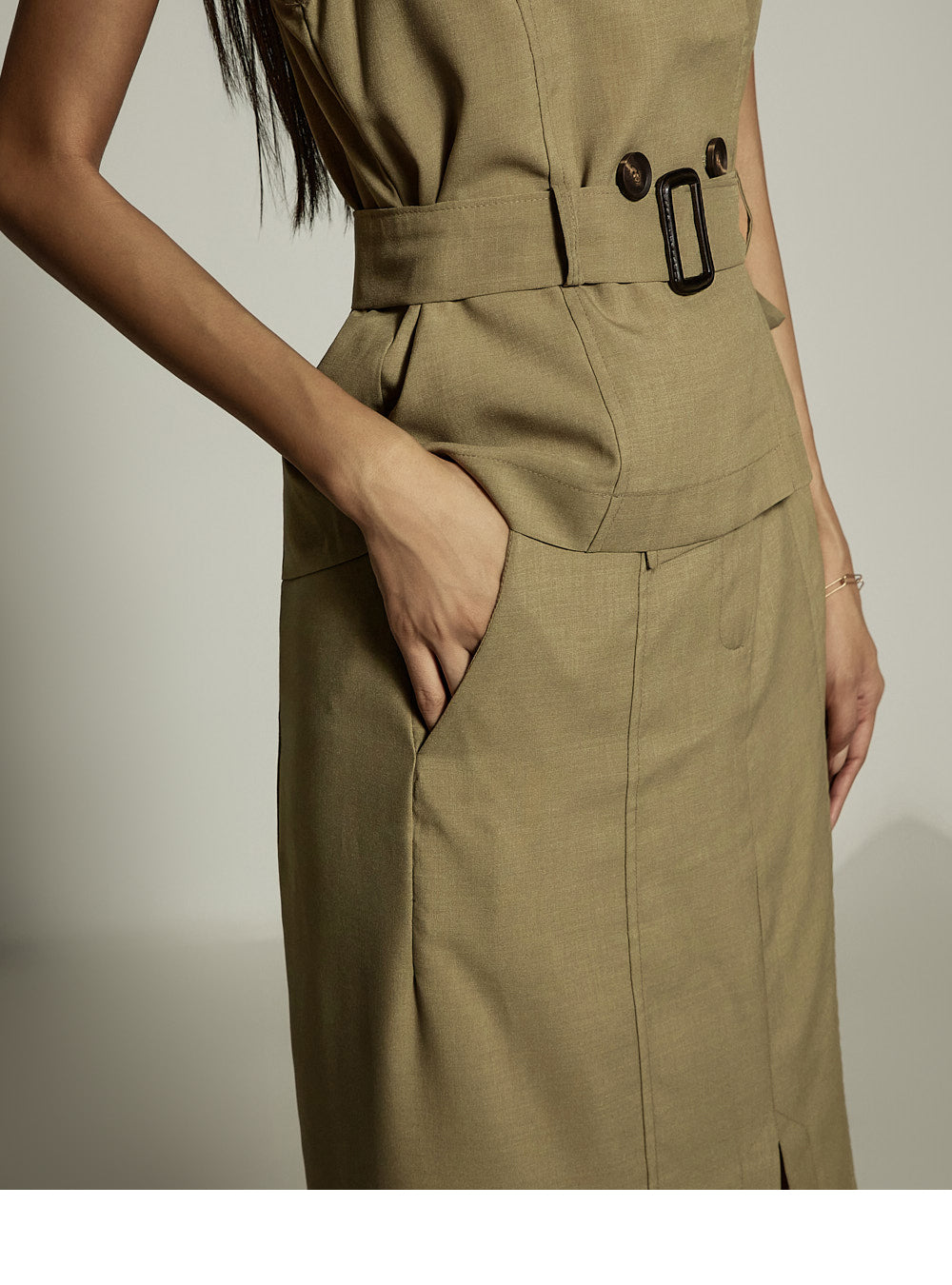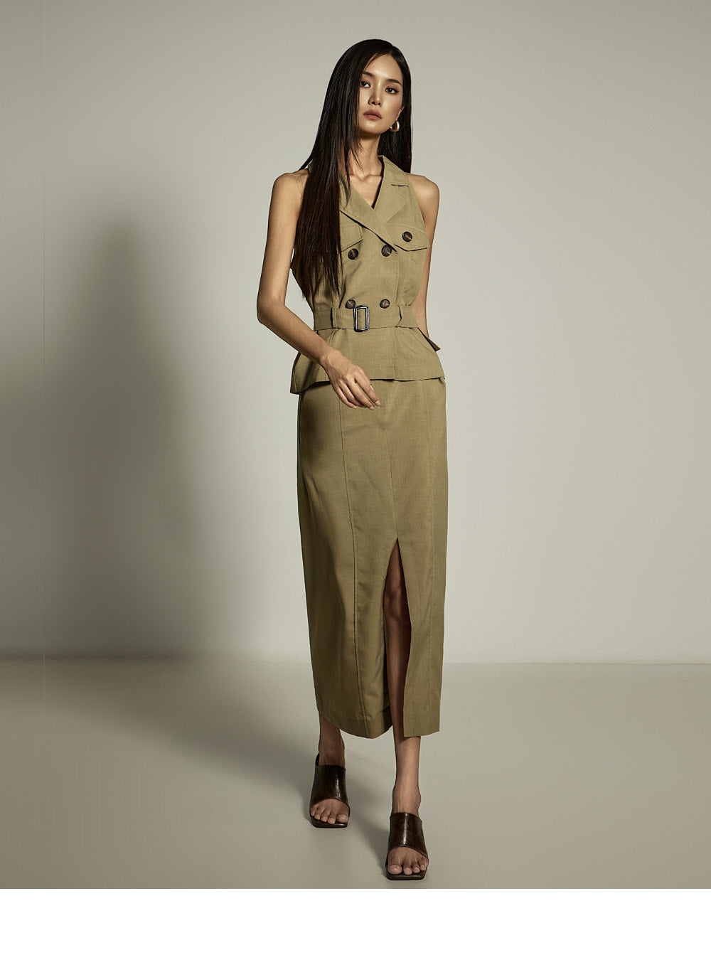 フロントにはジッパーとボタン、サイドポケット、裾スリットを施し、実用性と動きやすさを高めています。