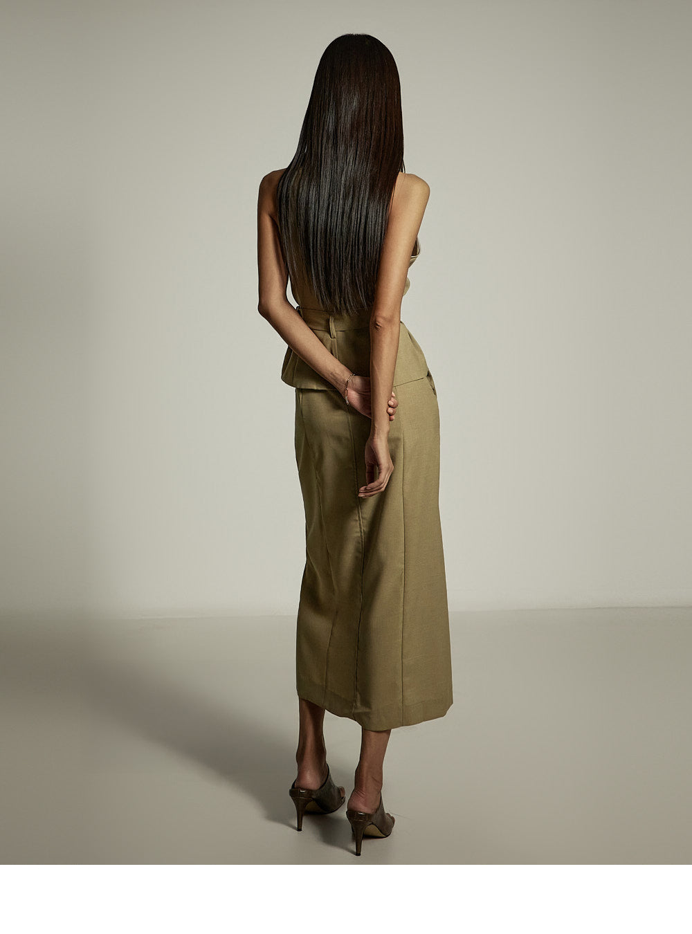 ロング丈のスカートが洗練された雰囲気を演出します。