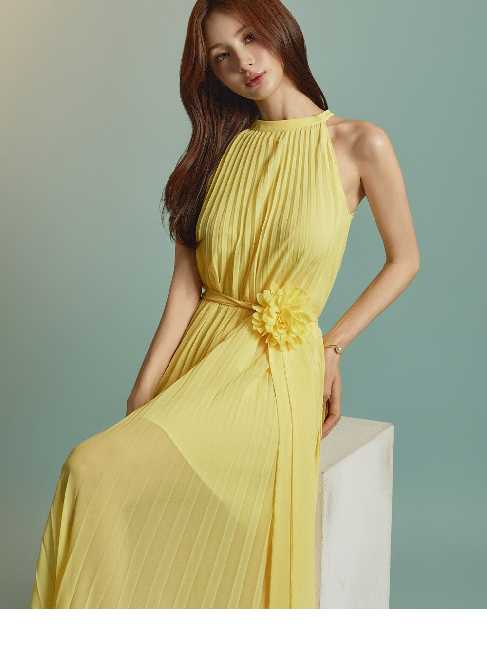 The halter-style, sleeveless cut beautifully highlights the shoulders and neckline, enhancing a gentle and elegant look.
