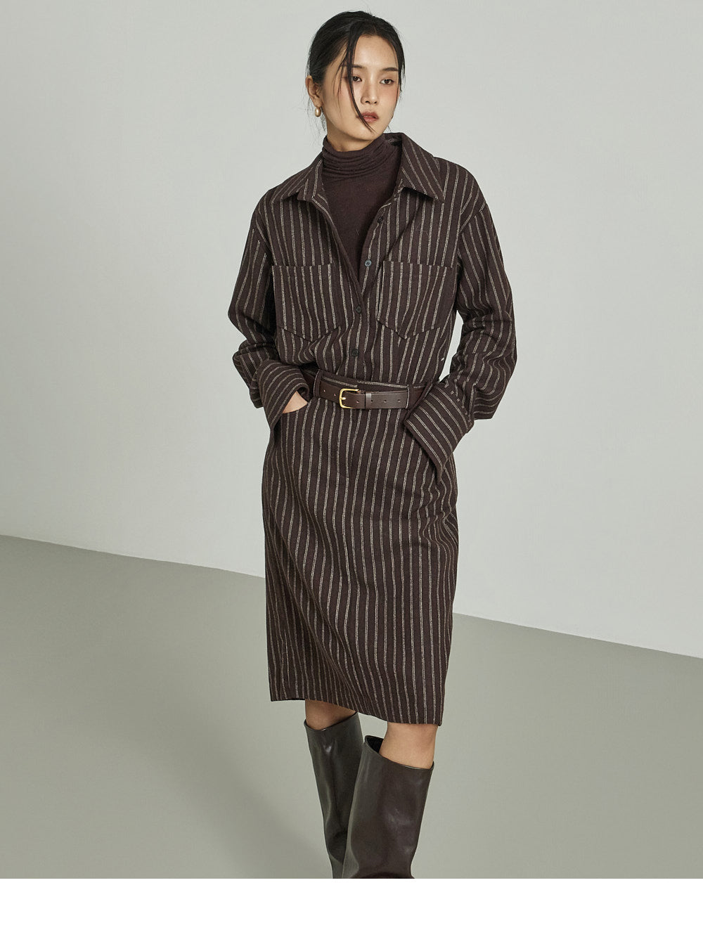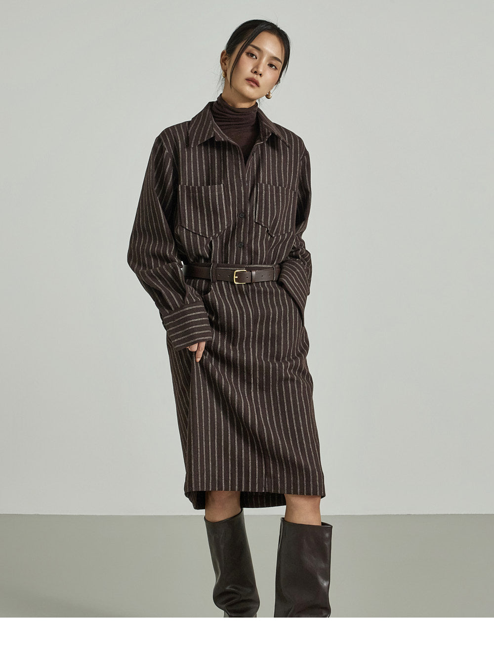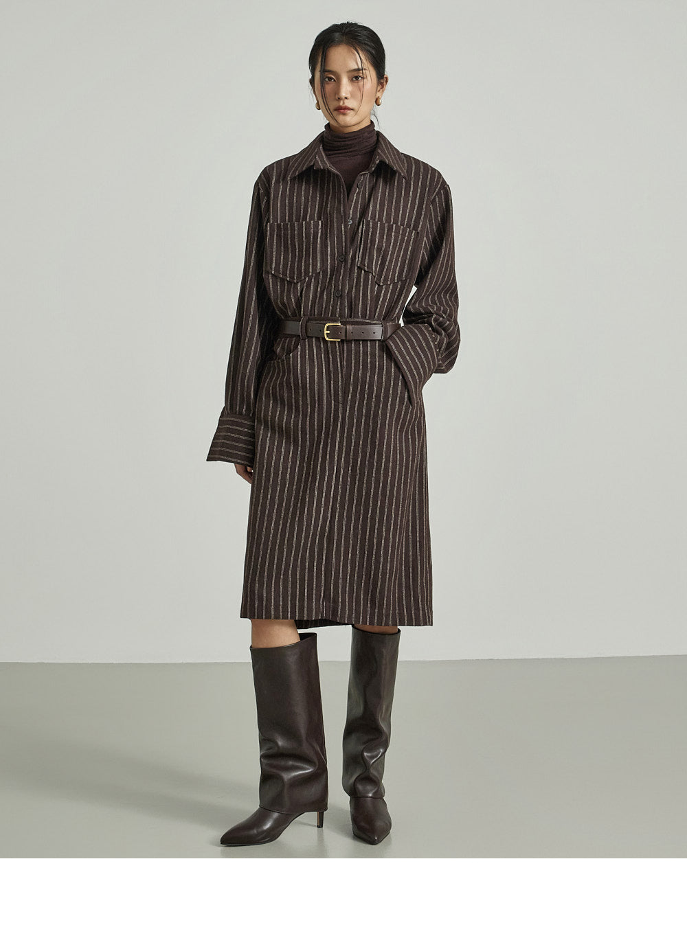 The shirt dress design neatly defines the upper body,