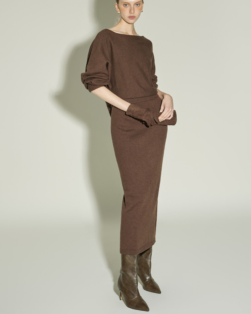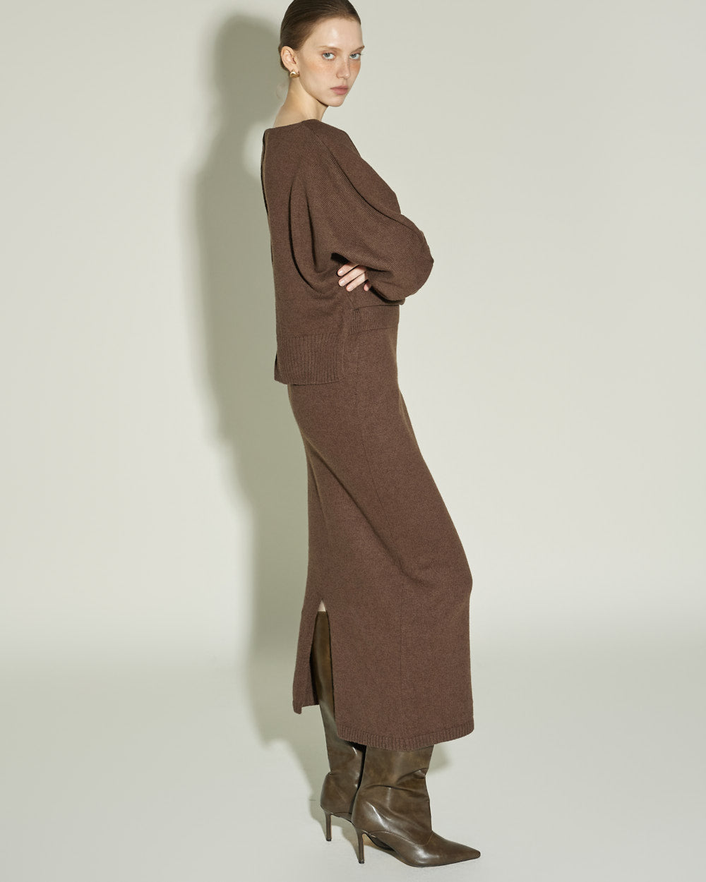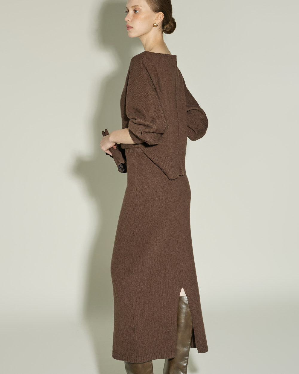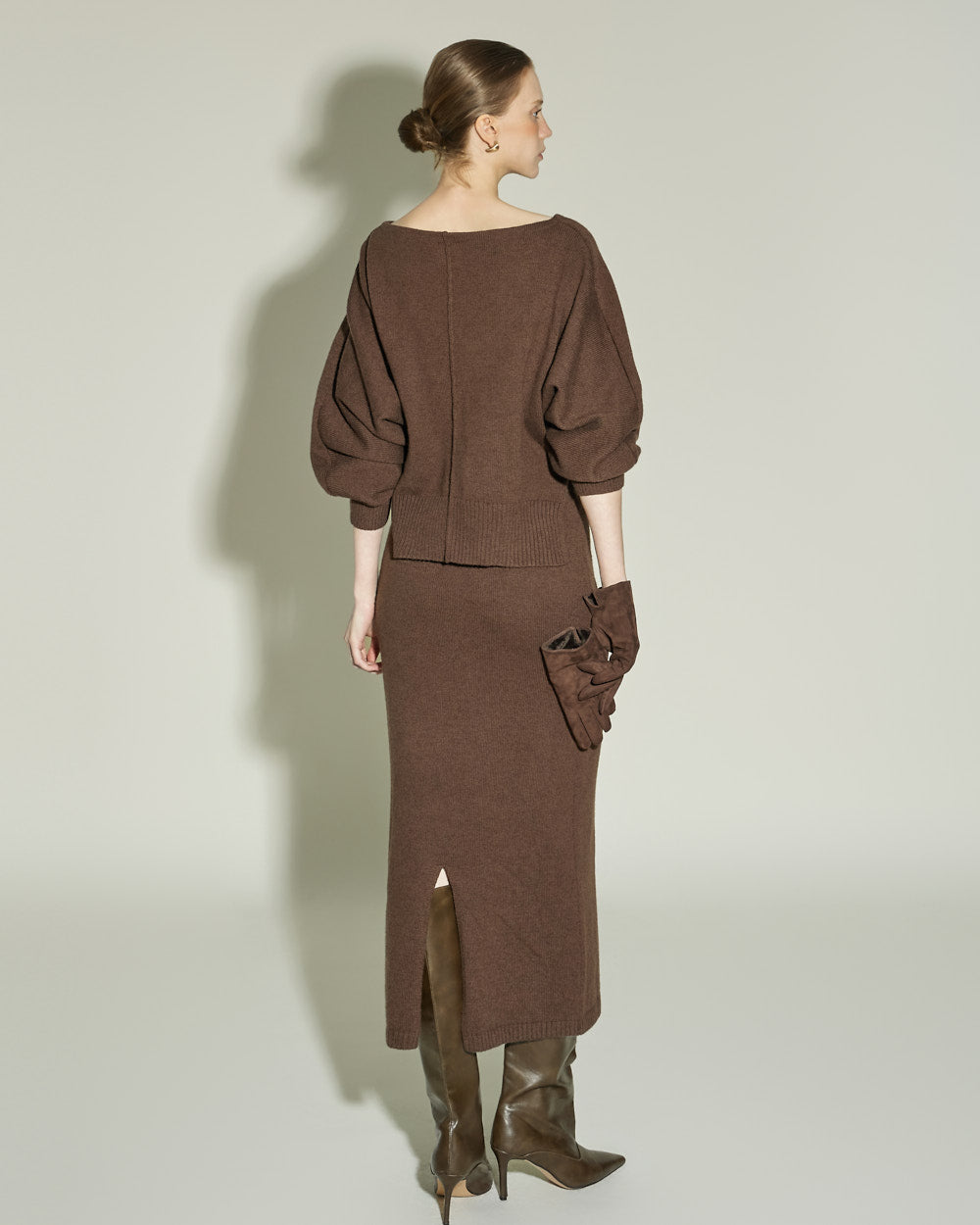 with a slit detail at the back of the waist and a back slit in the skirt,