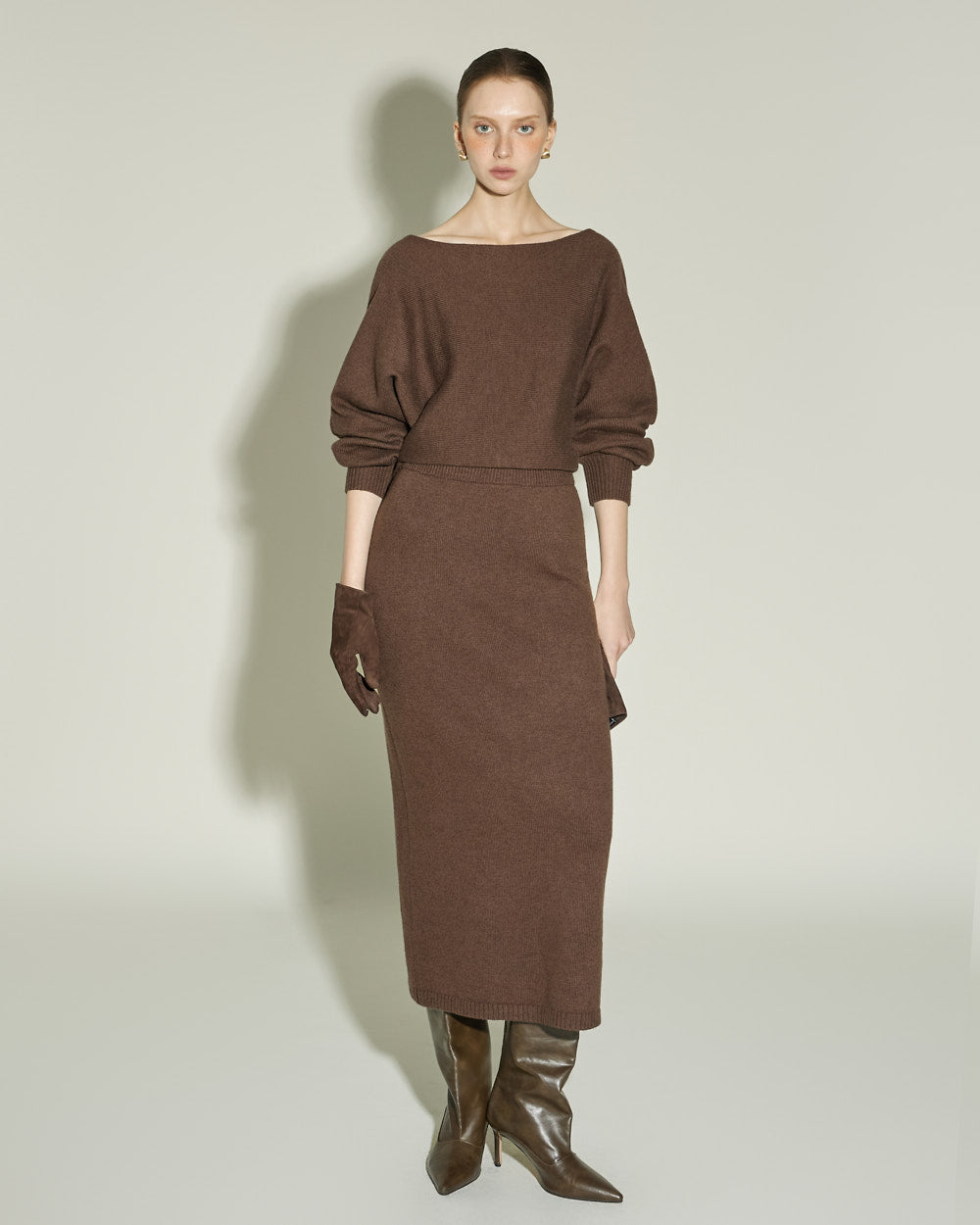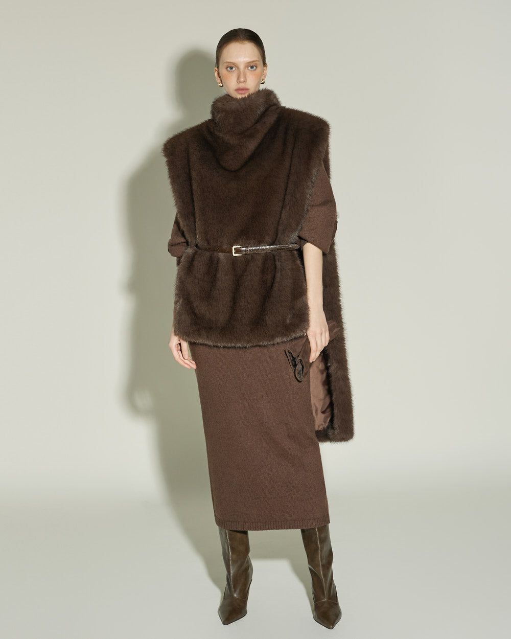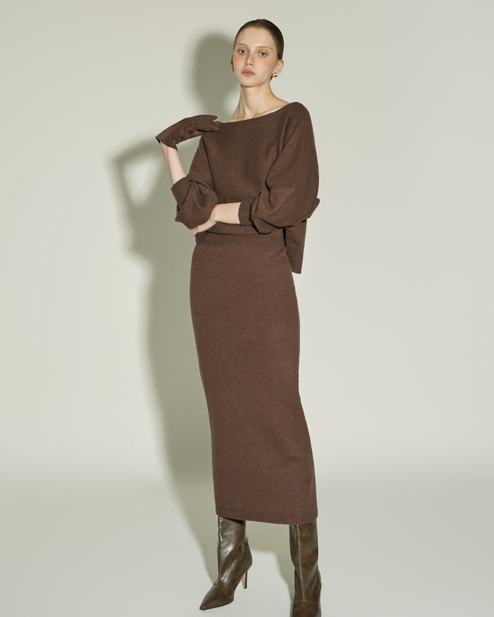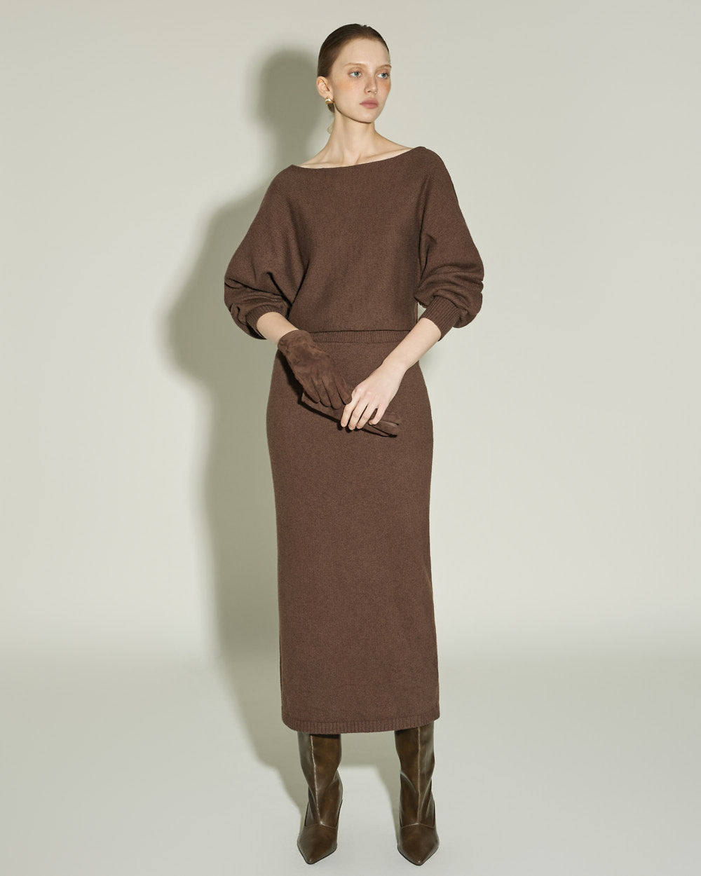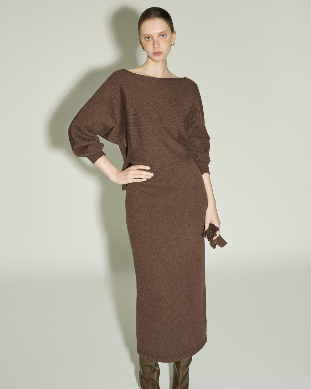 with a slit detail at the back of the waist and a back slit in the skirt,