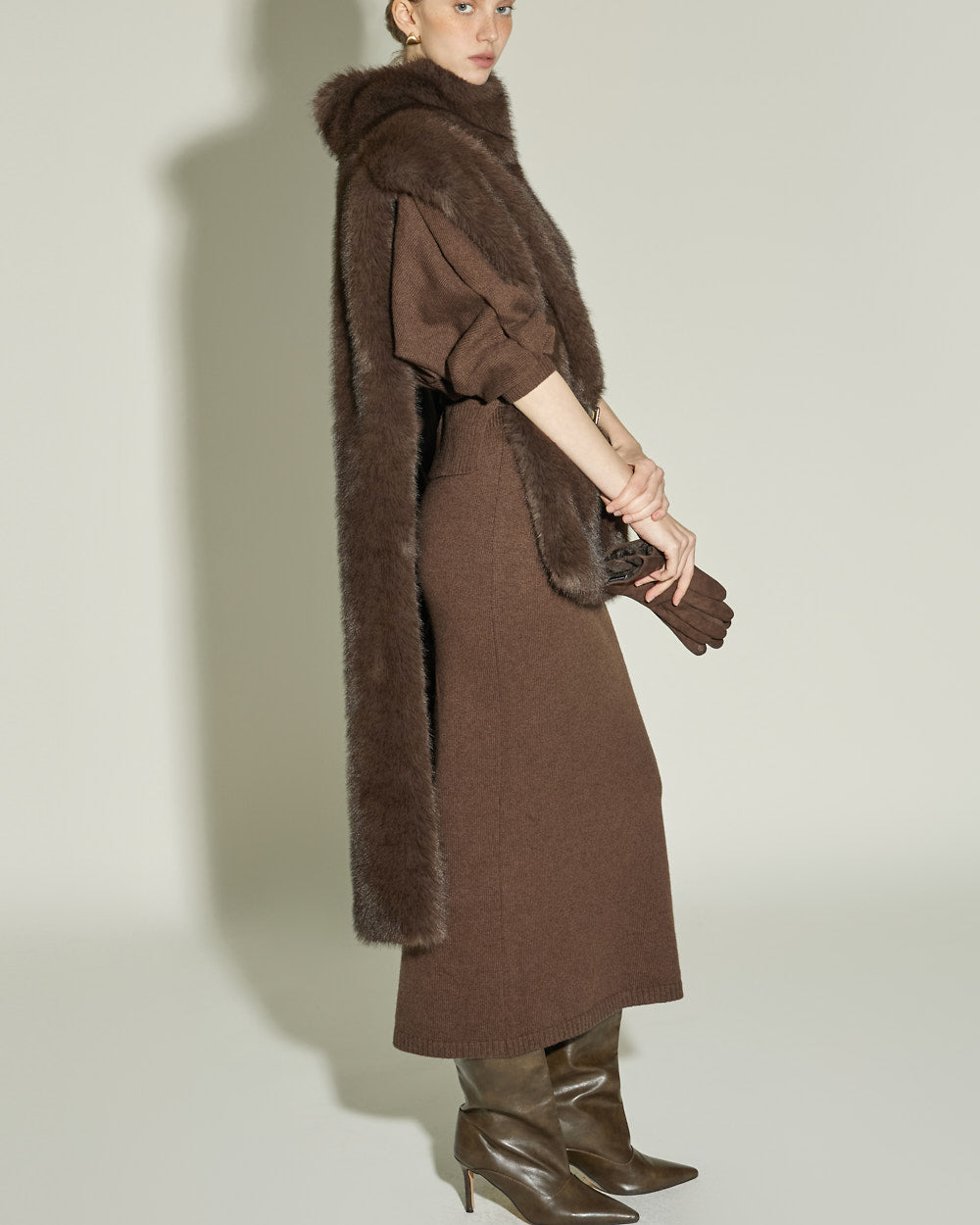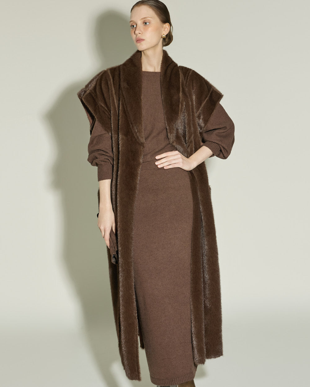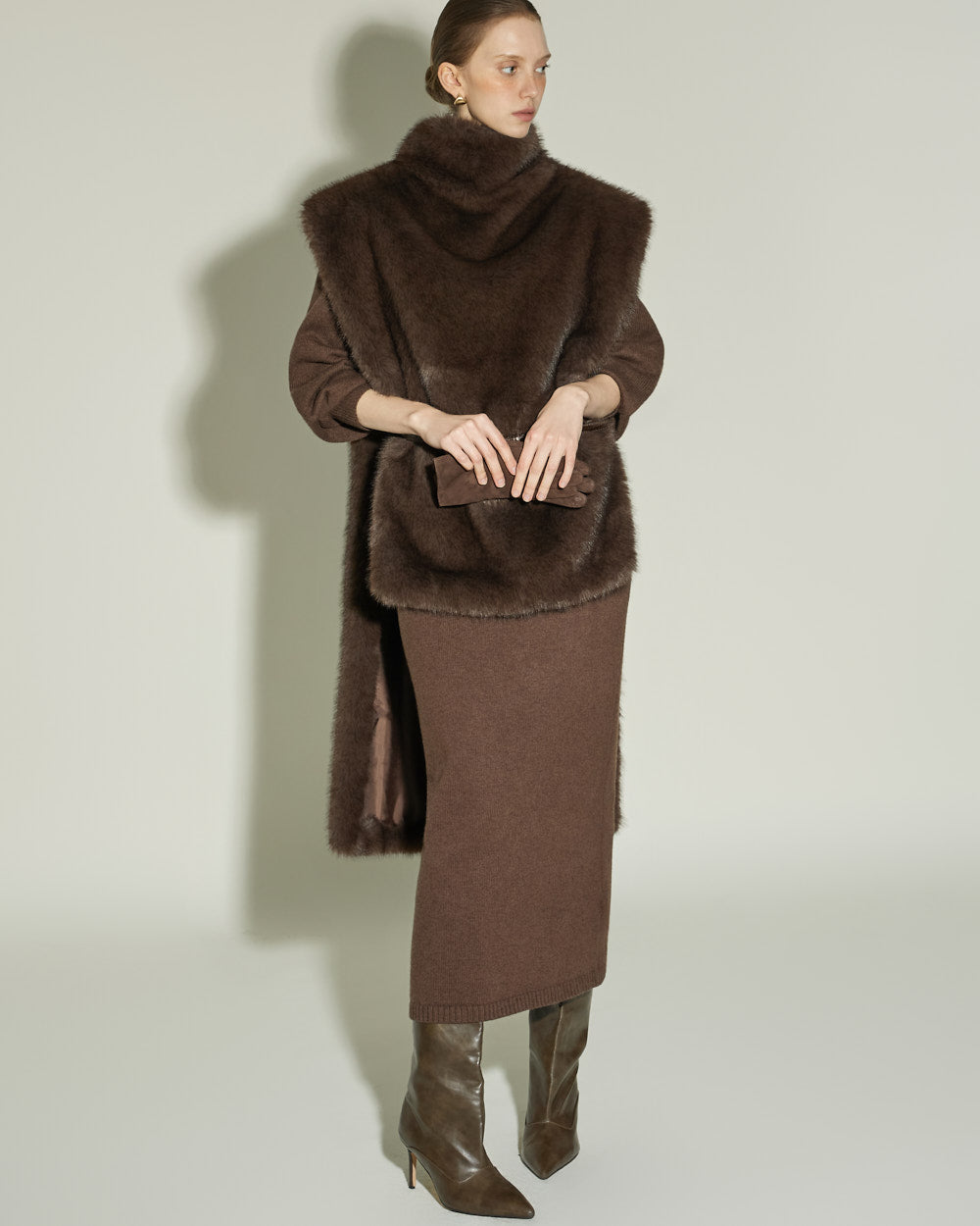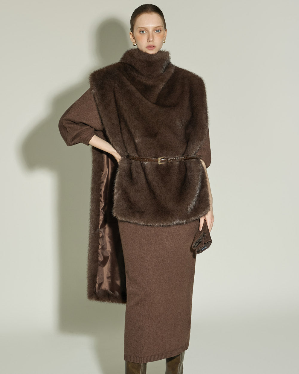 with a slit detail at the back of the waist and a back slit in the skirt,