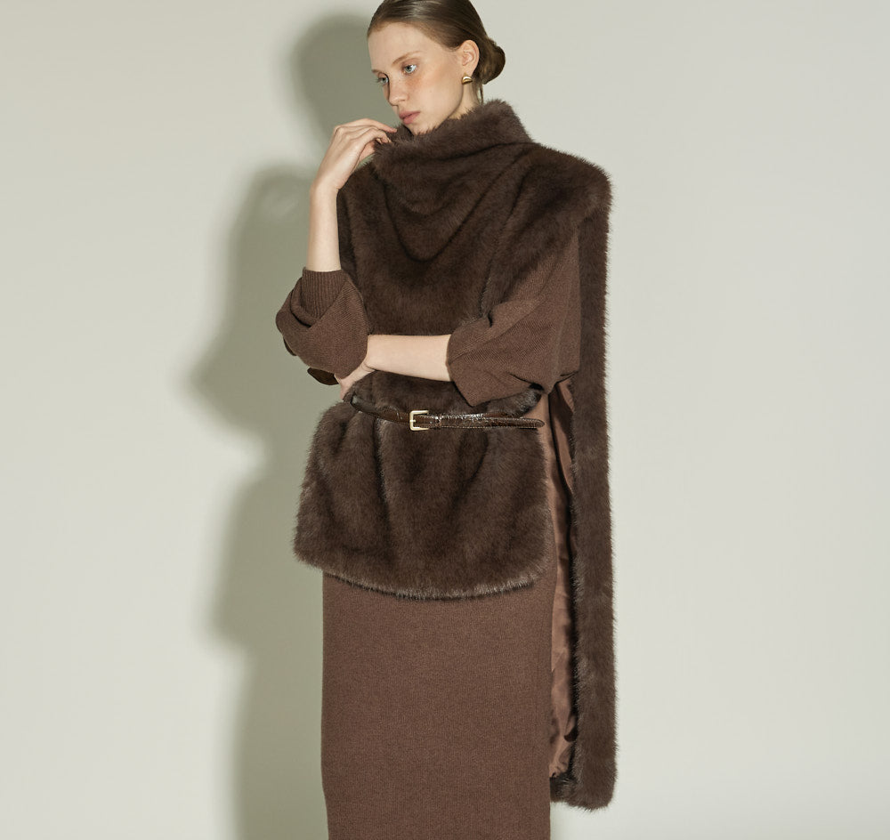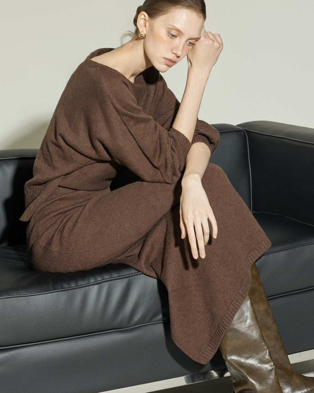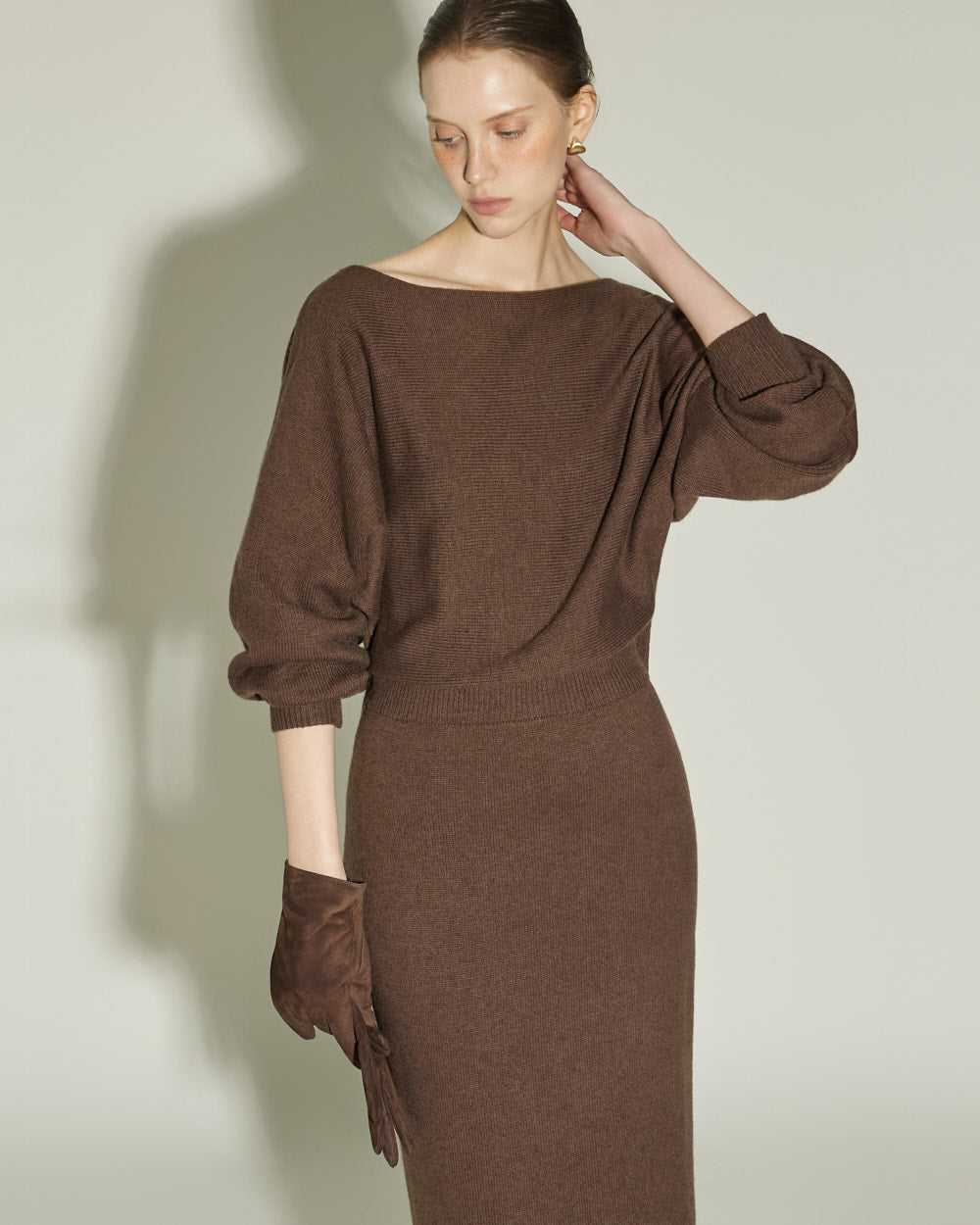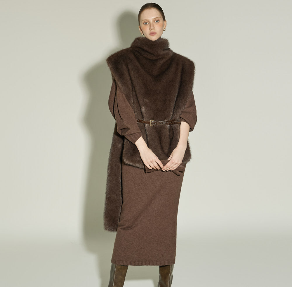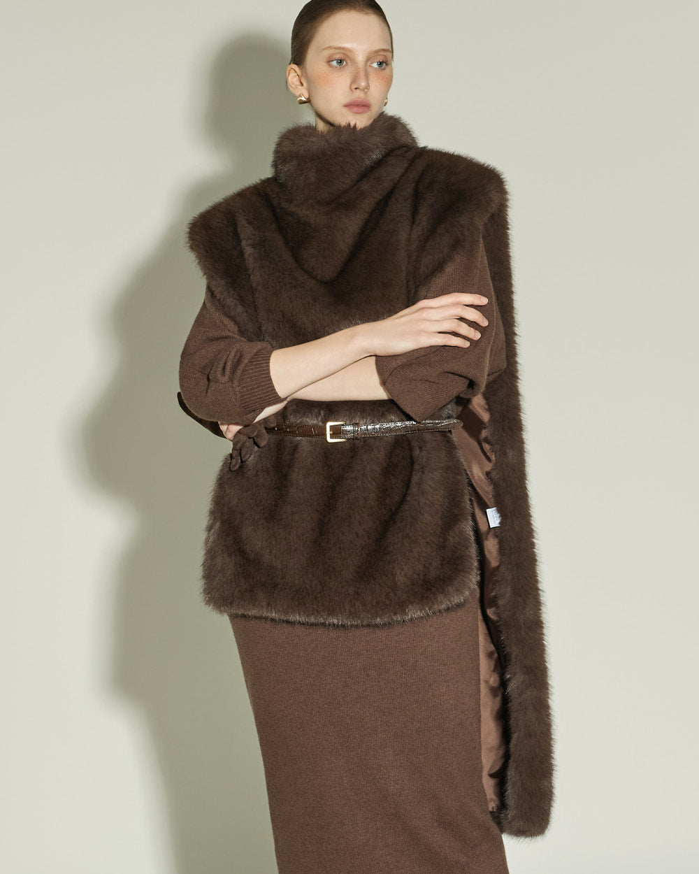 with a slit detail at the back of the waist and a back slit in the skirt,