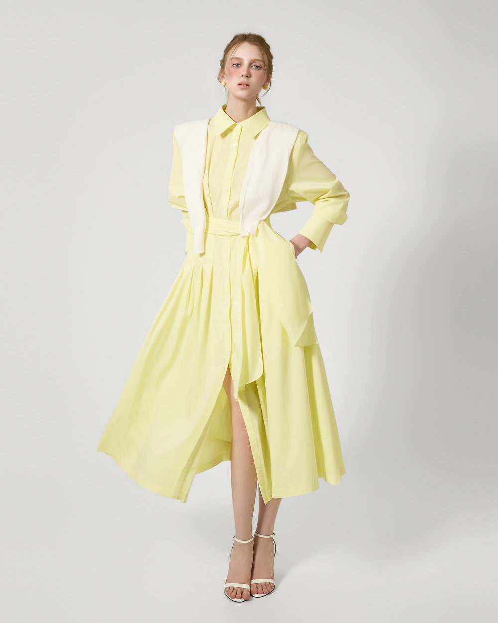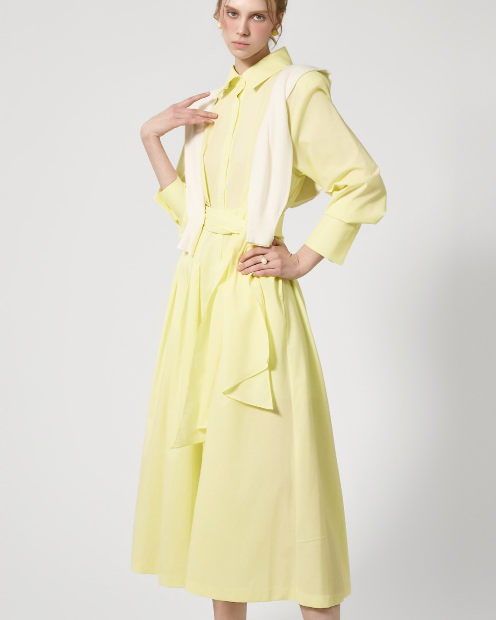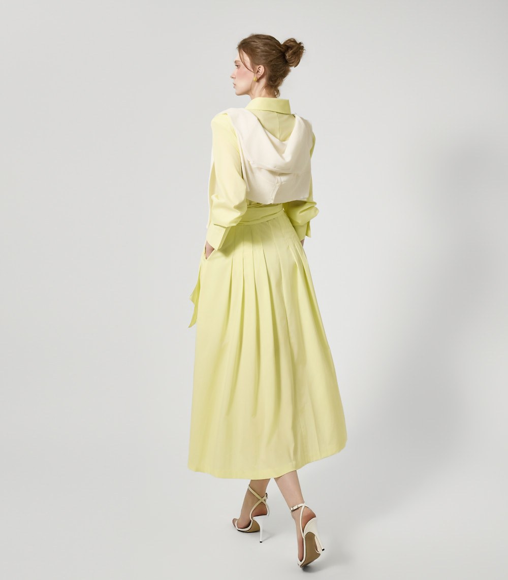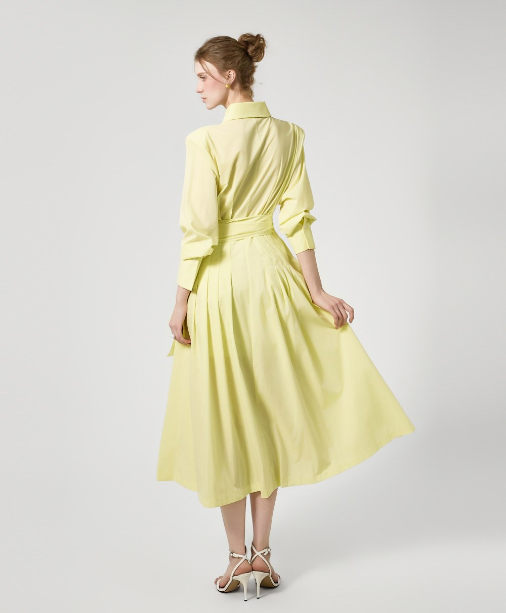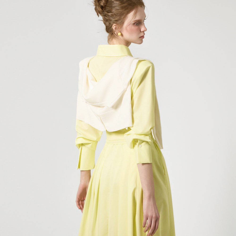 ウエストストラップのディテールがウエストを絞り、様々なシルエットの着こなしが可能で、スカートのボリュームのあるフレアラインがフェミニンな雰囲気を添えます。