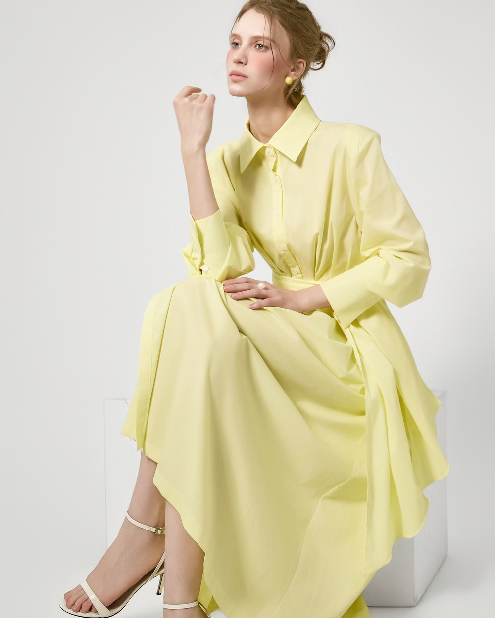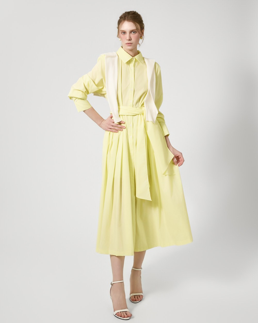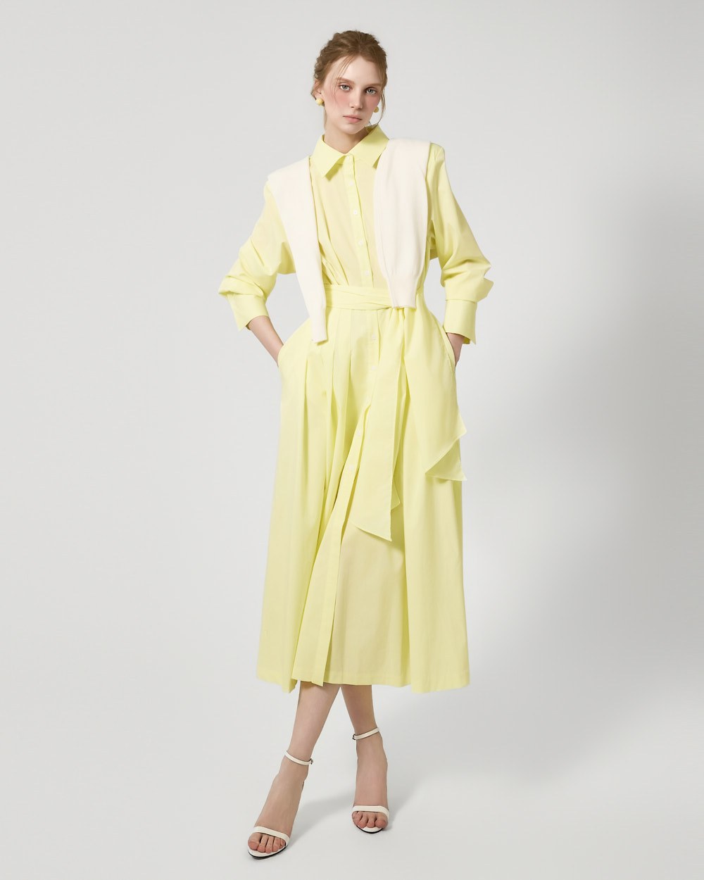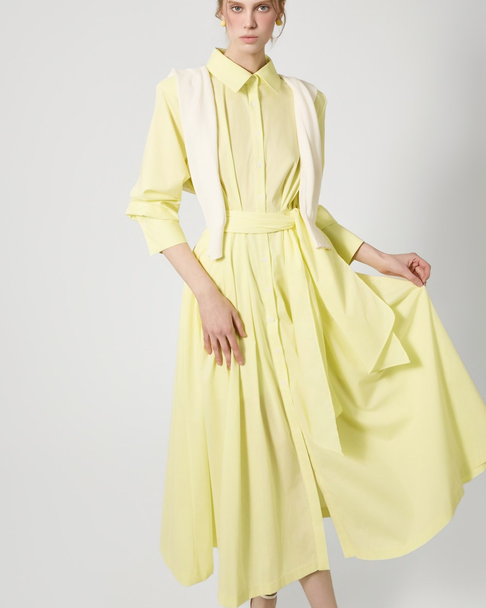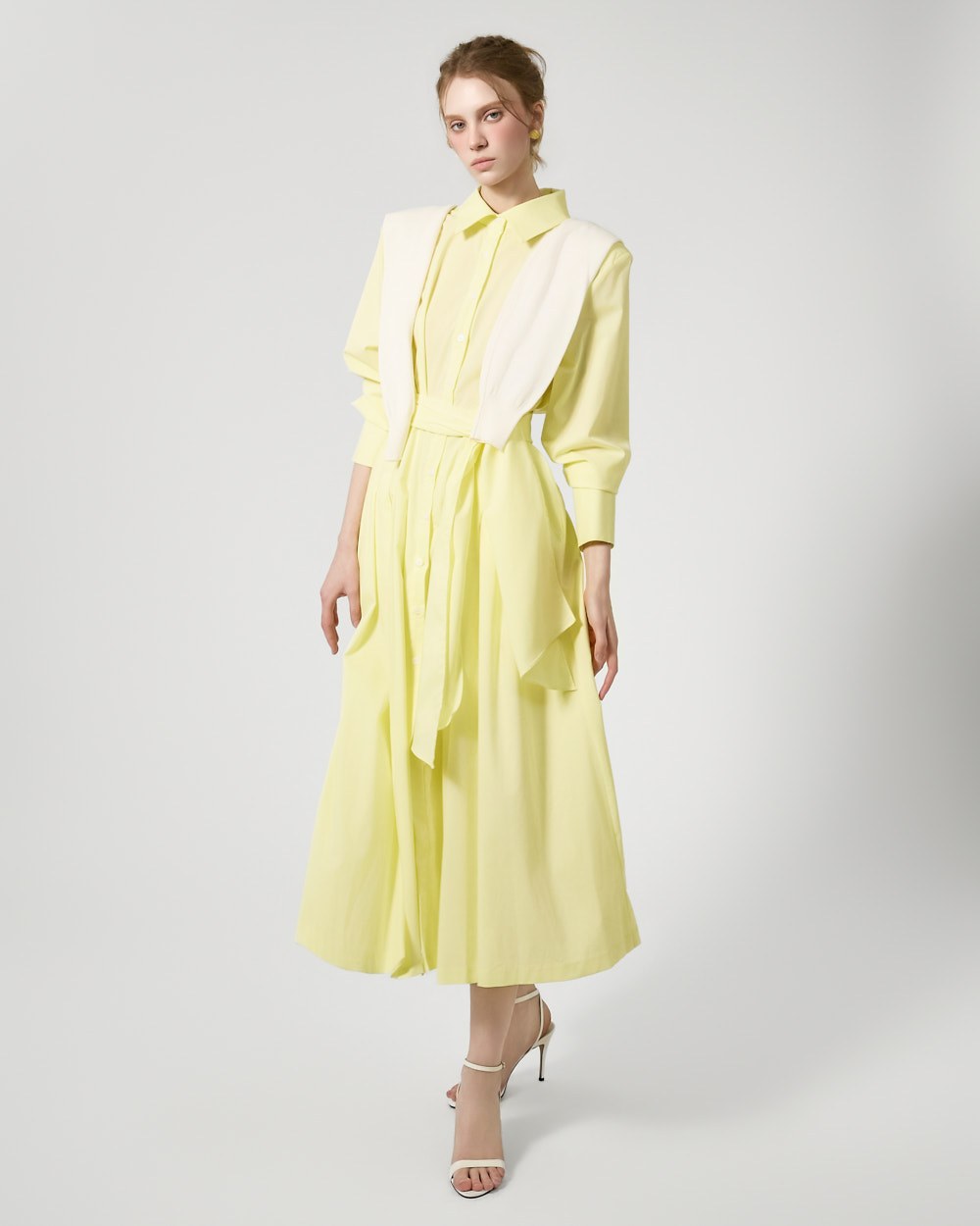 ウエストストラップのディテールがウエストを絞り、様々なシルエットの着こなしが可能で、スカートのボリュームのあるフレアラインがフェミニンな雰囲気を添えます。