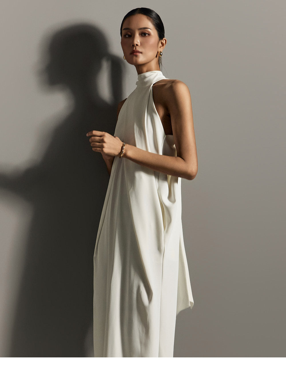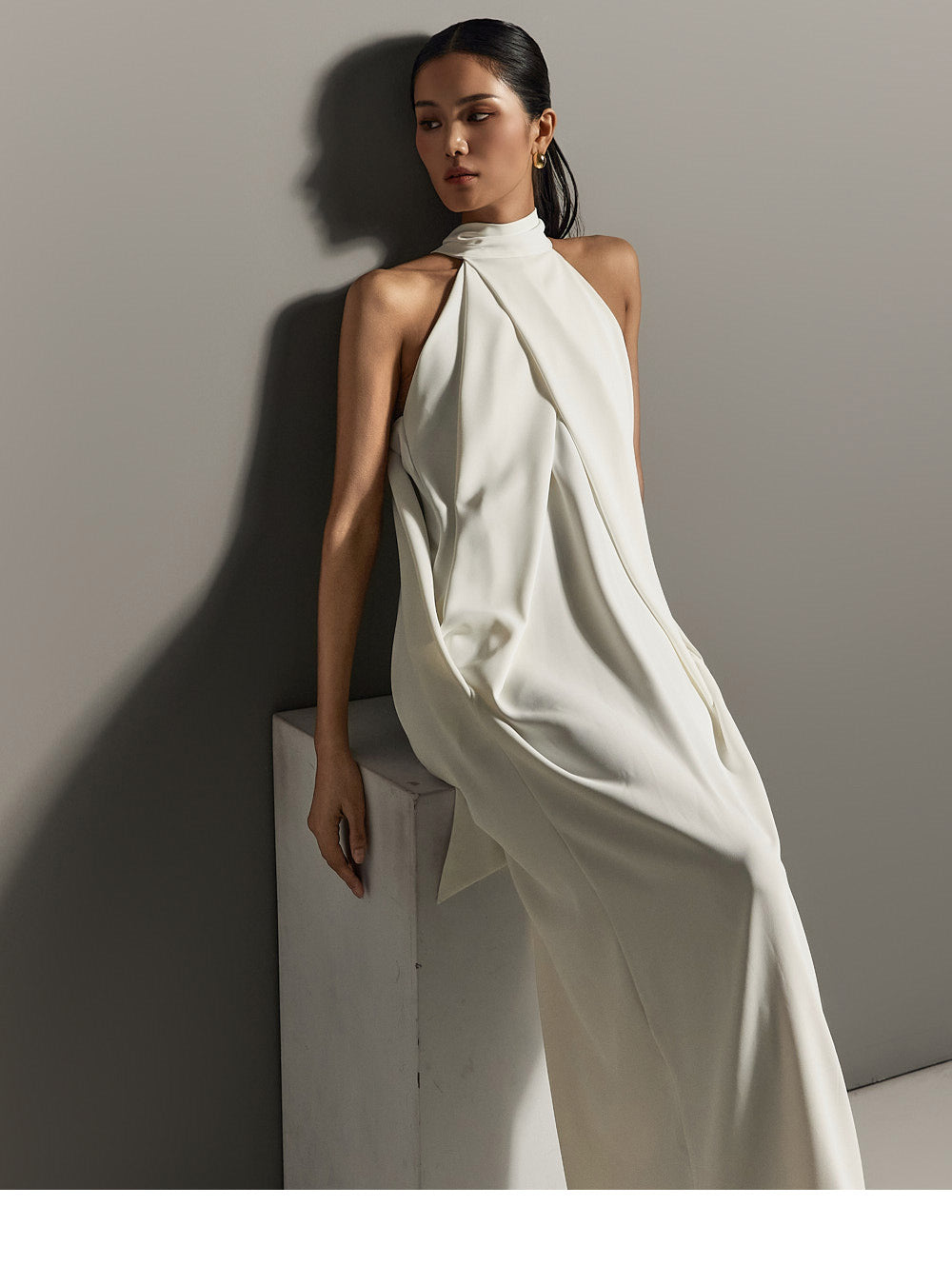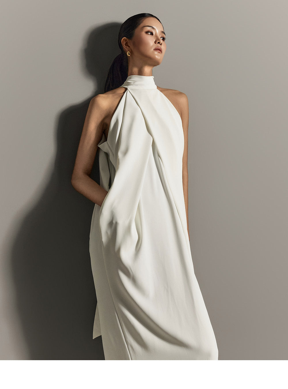 ホルターネックのラインがユニークでエレガントなシルエットを作り出し、