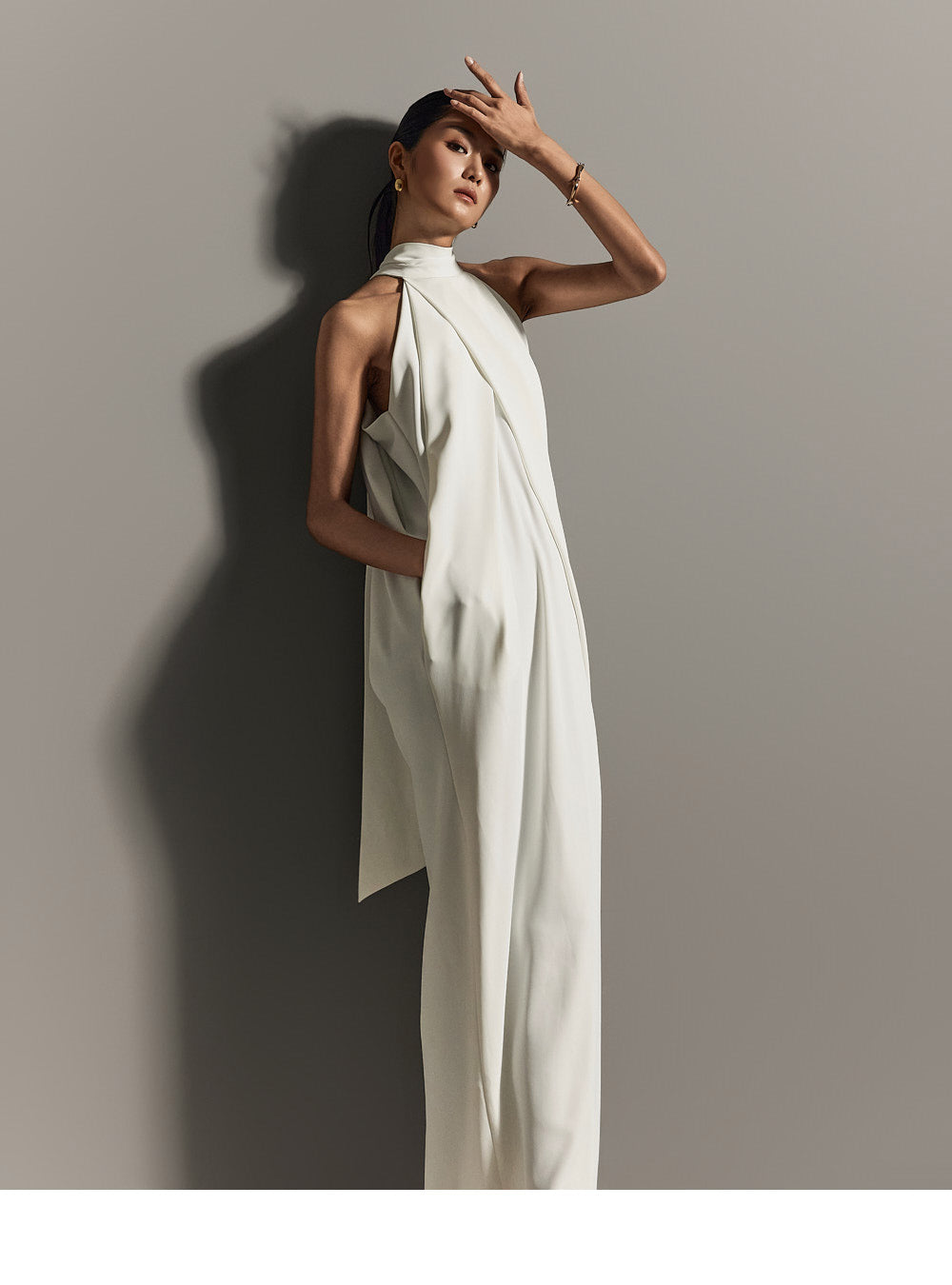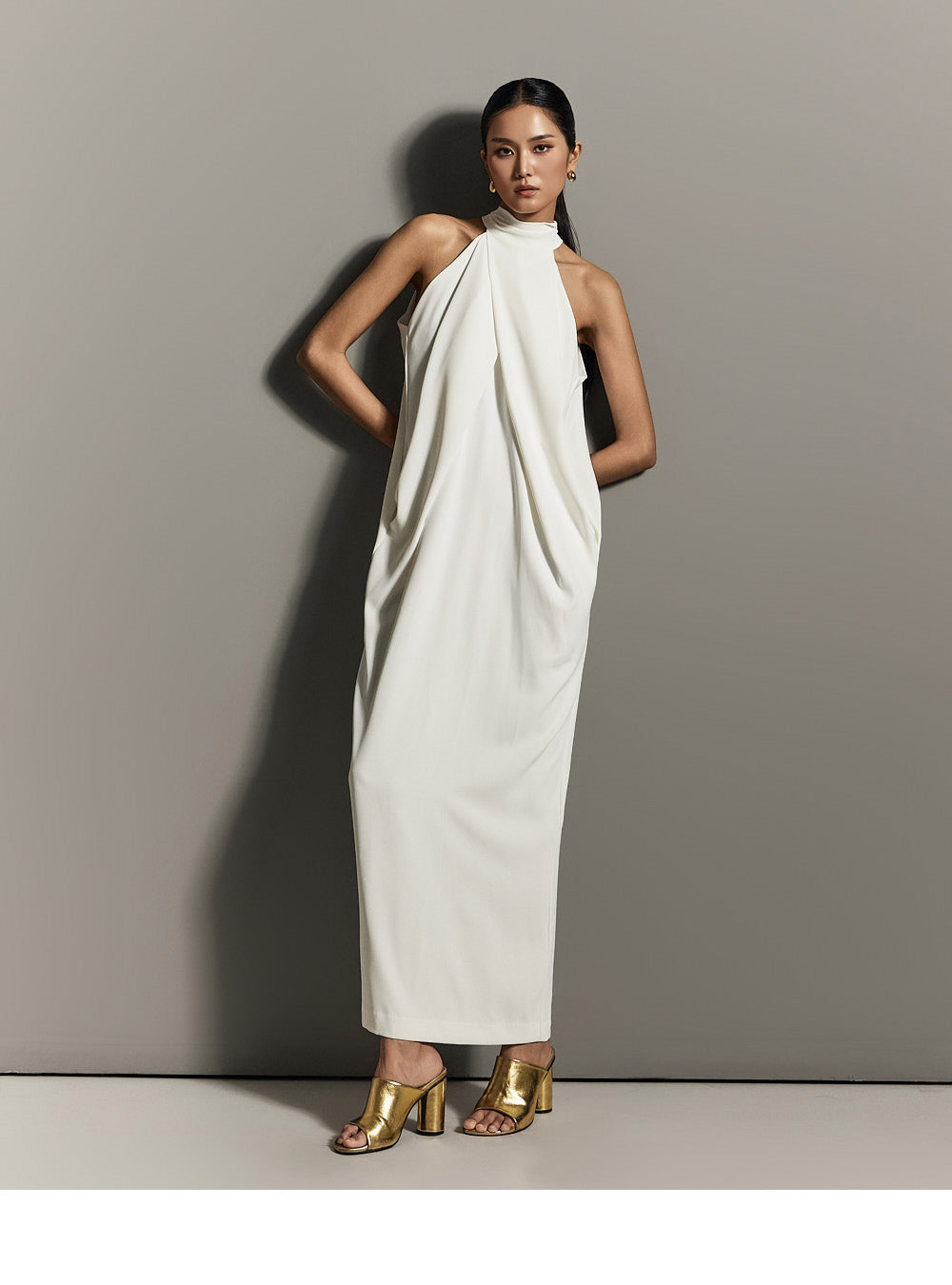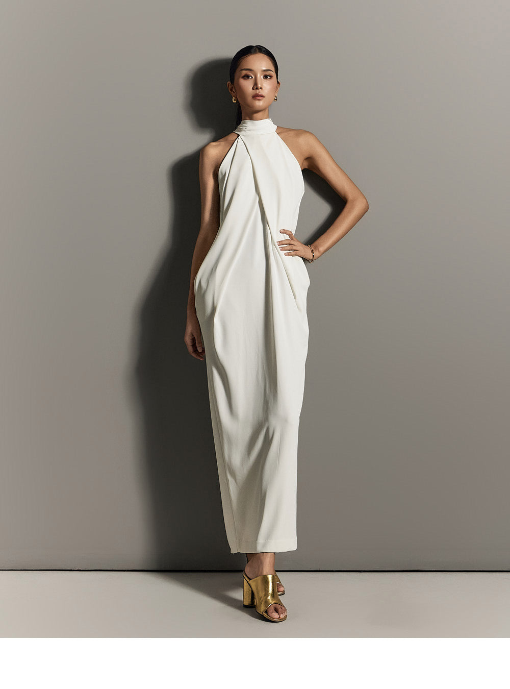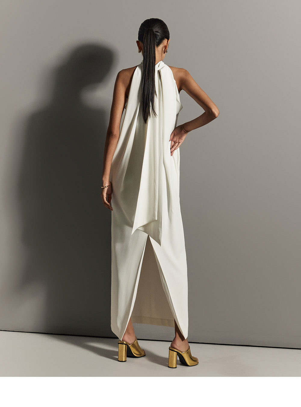 ホルターネックのラインがユニークでエレガントなシルエットを作り出し、