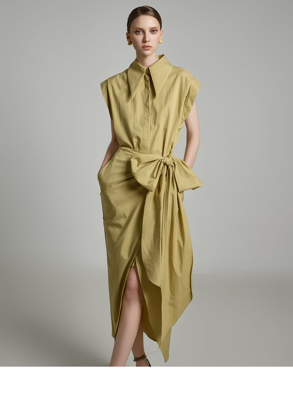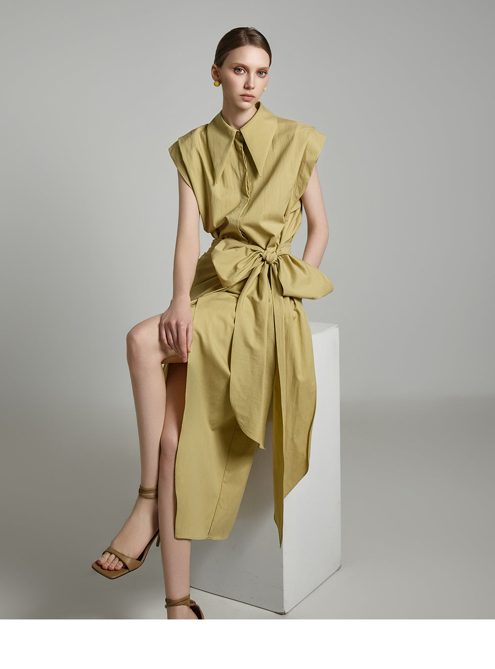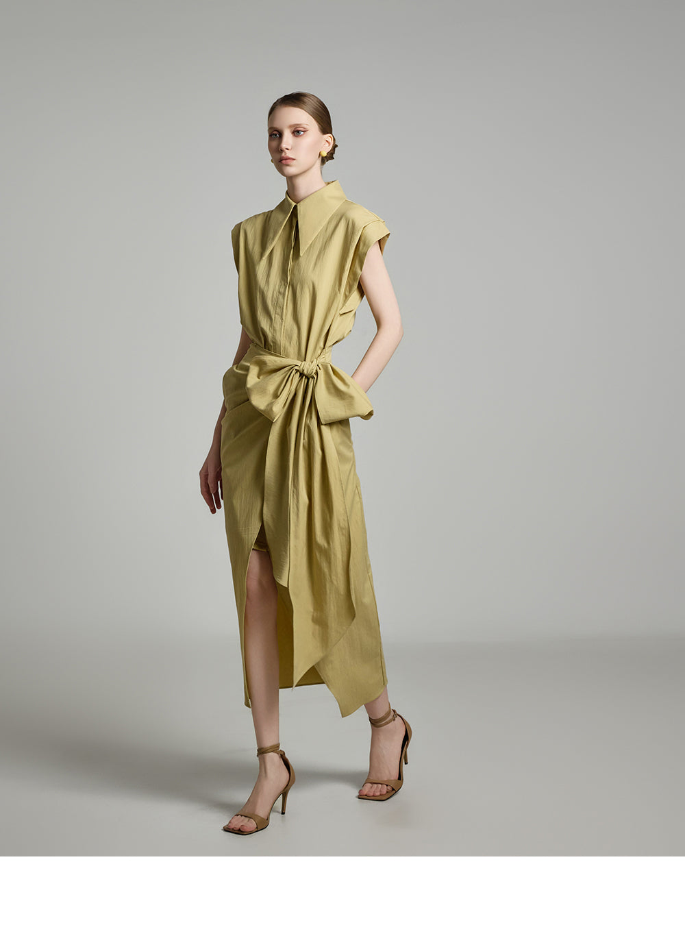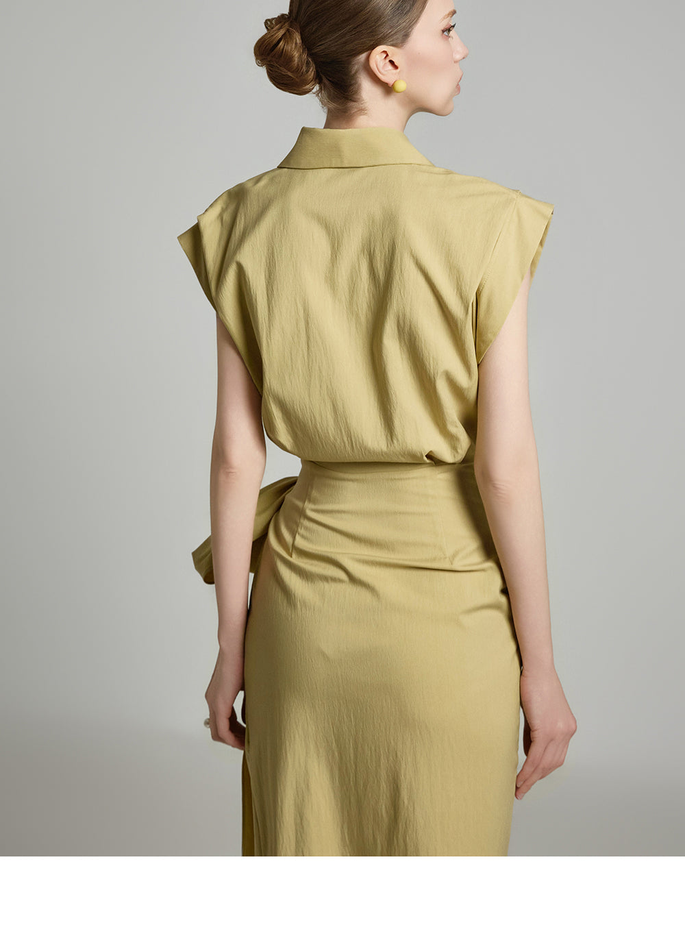 アシンメトリーな長さとノースリーブのシャツデザインが組み合わさって