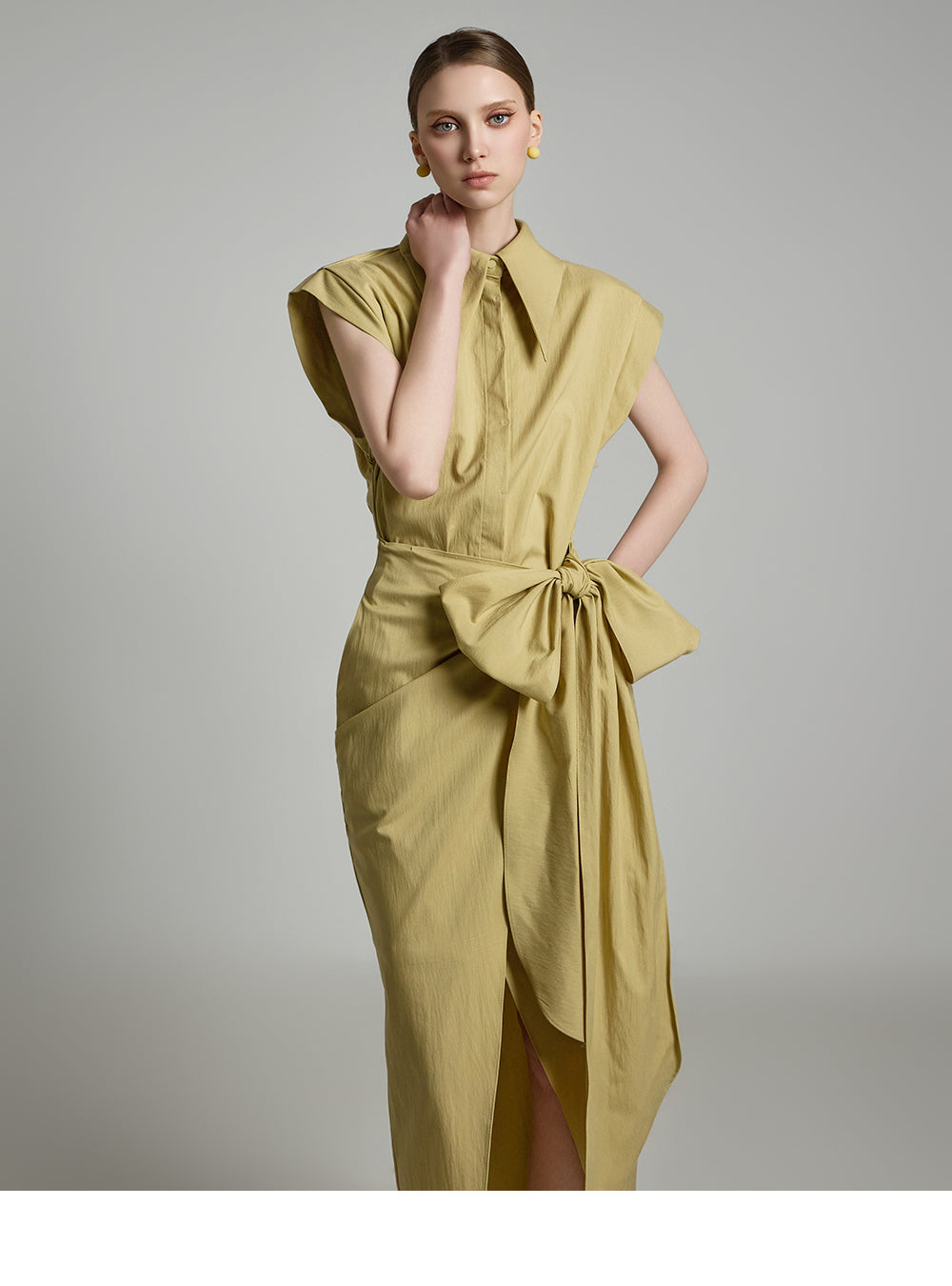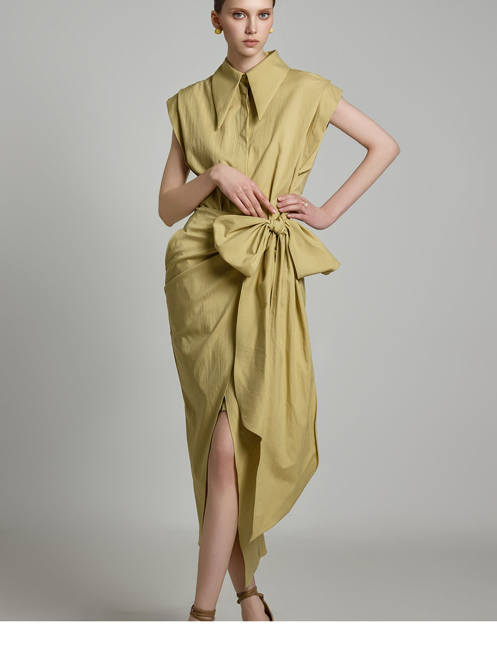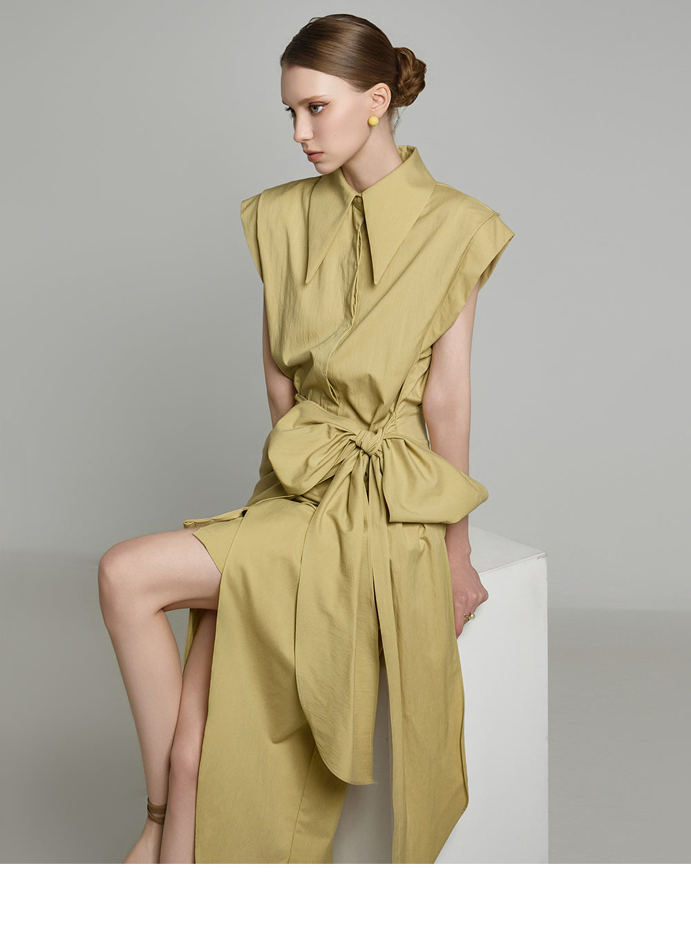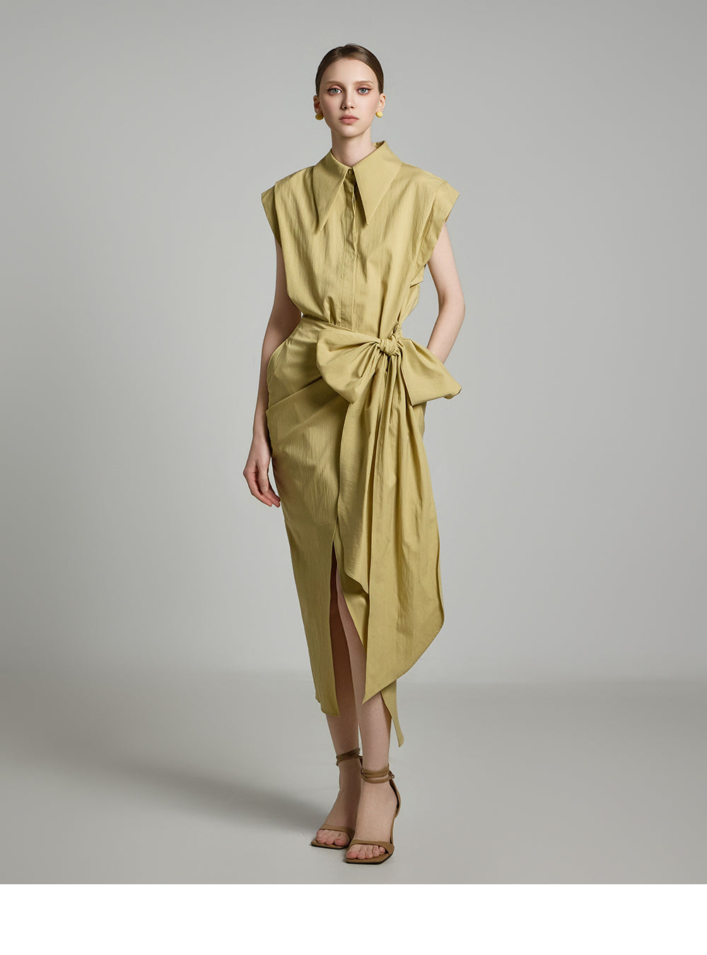 アシンメトリーな長さとノースリーブのシャツデザインが組み合わさって