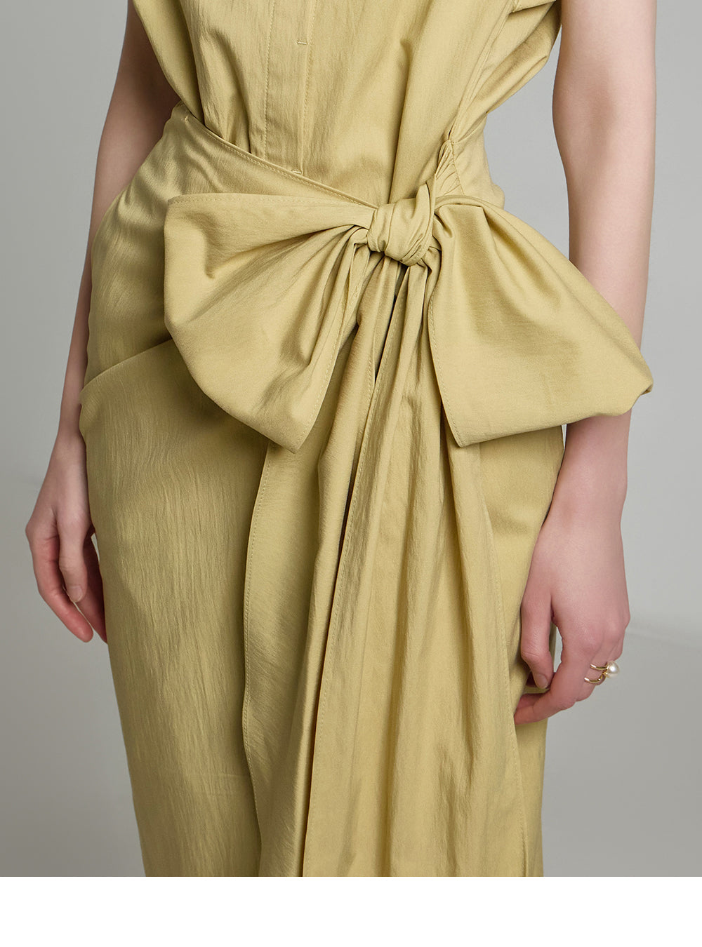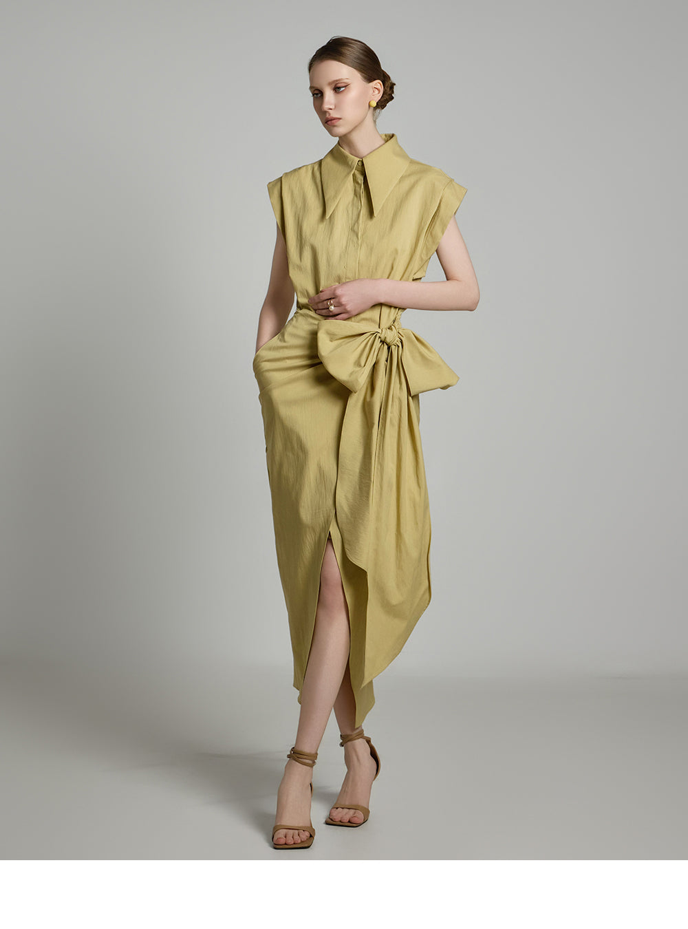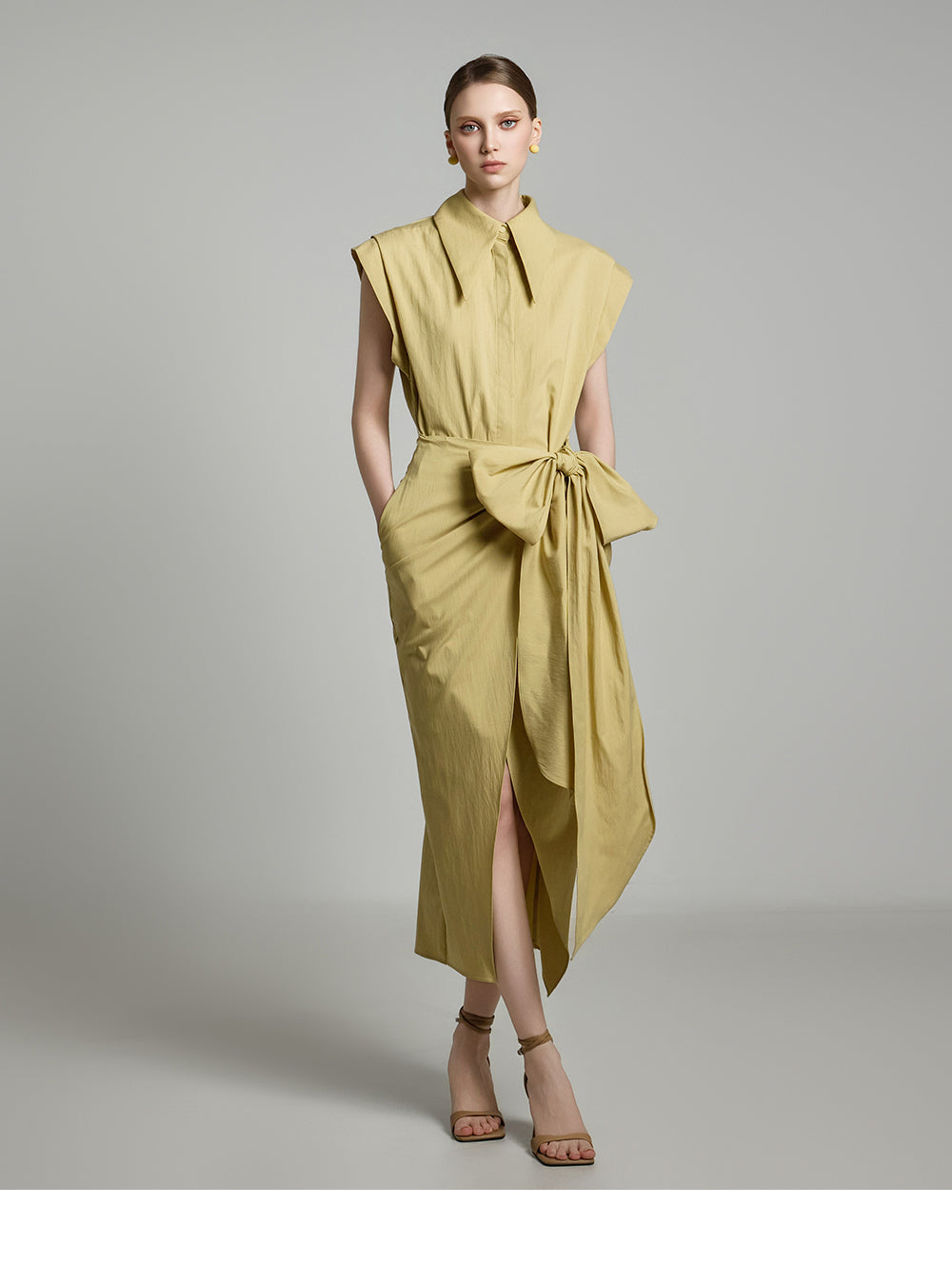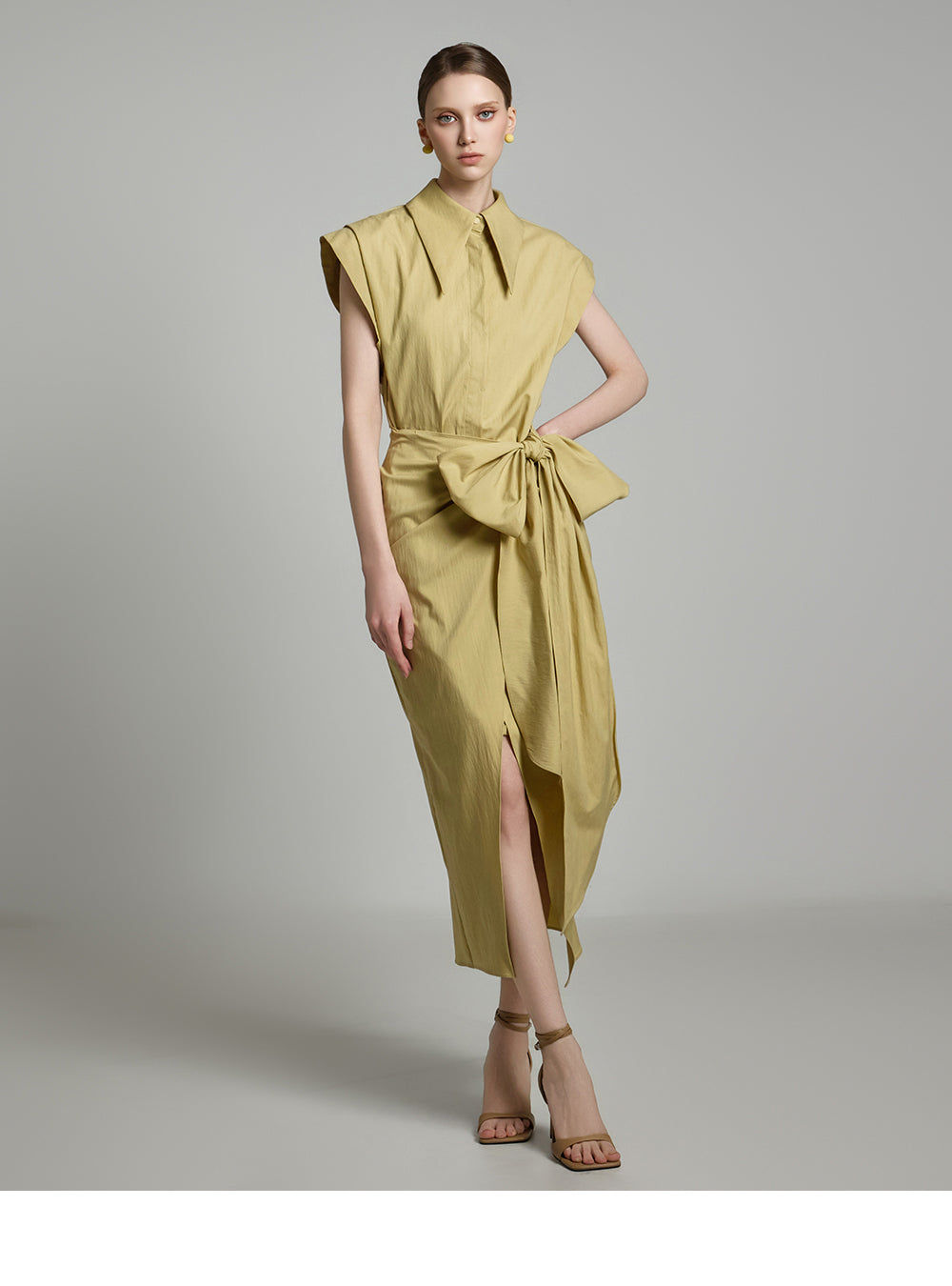 アシンメトリーな長さとノースリーブのシャツデザインが組み合わさって