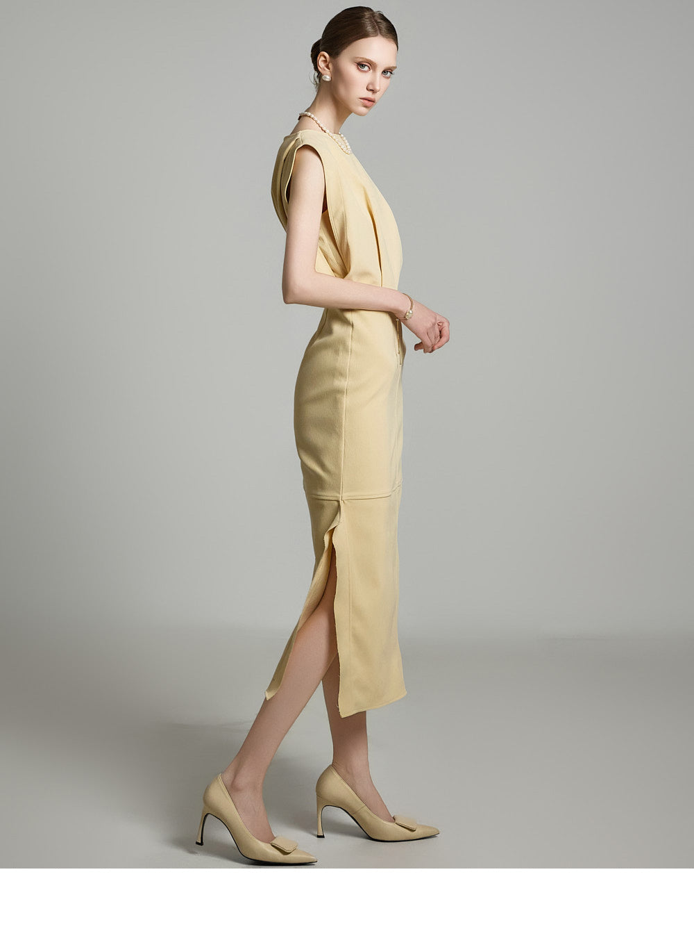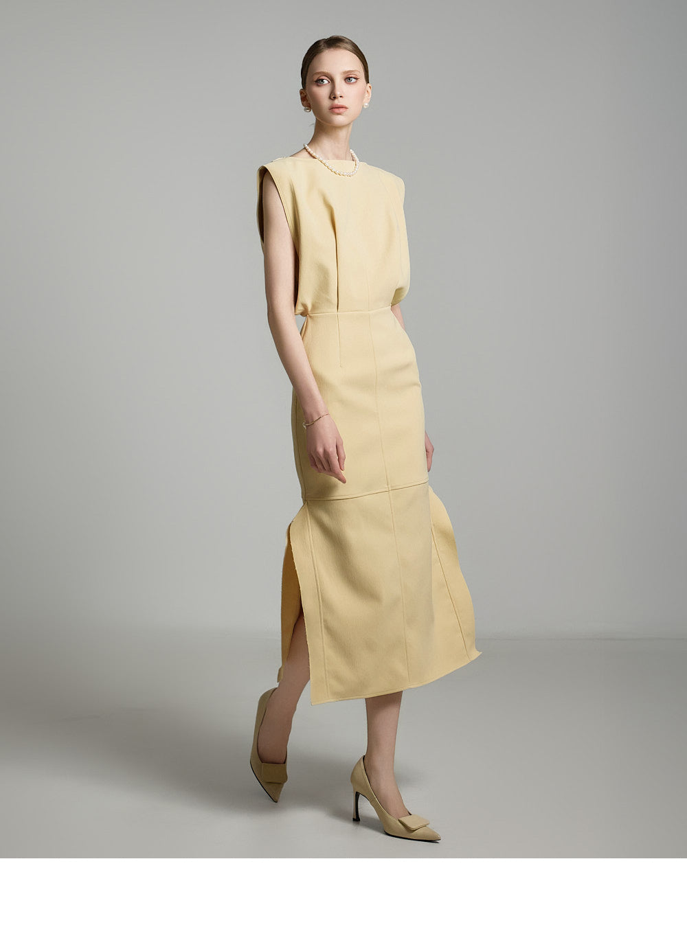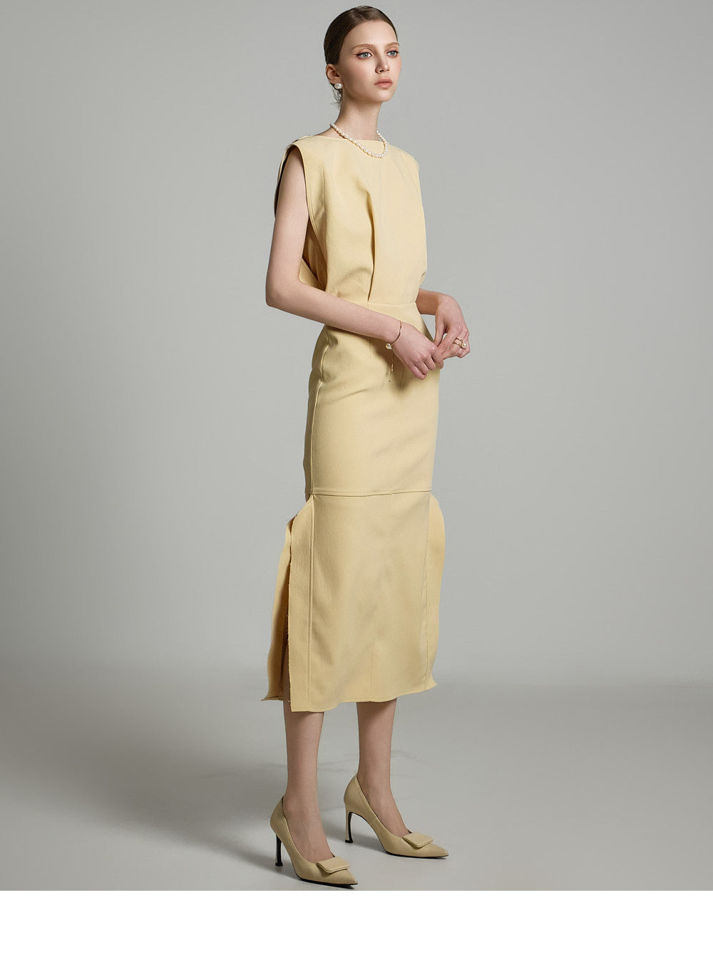 サイドのアシンメトリースリットが洗練されたスタイリッシュなアクセントを添えます。