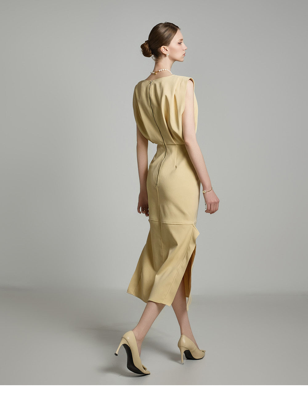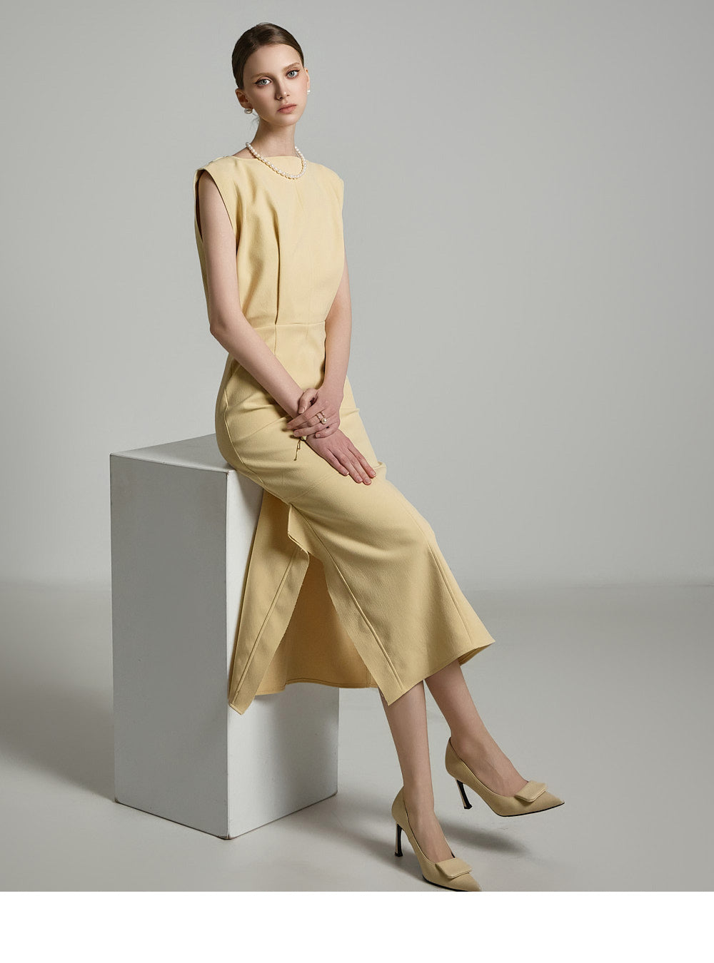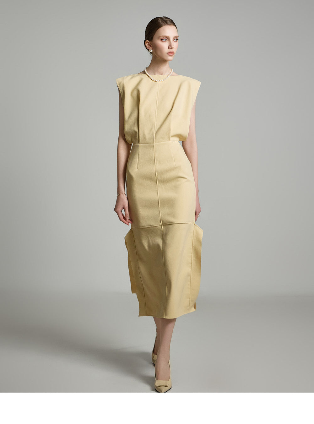 サイドのアシンメトリースリットが洗練されたスタイリッシュなアクセントを添えます。