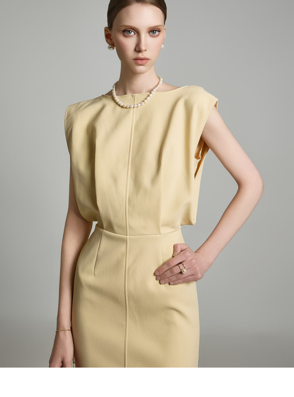 フロントの繊細なピンタックのディテールが、体型をさりげなく引き立てます。