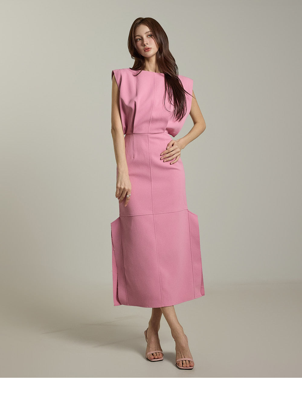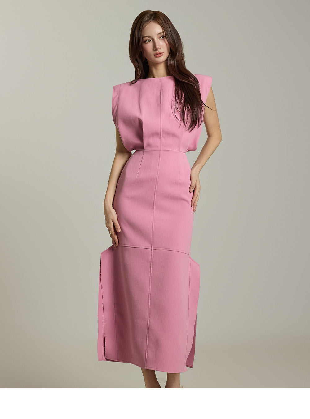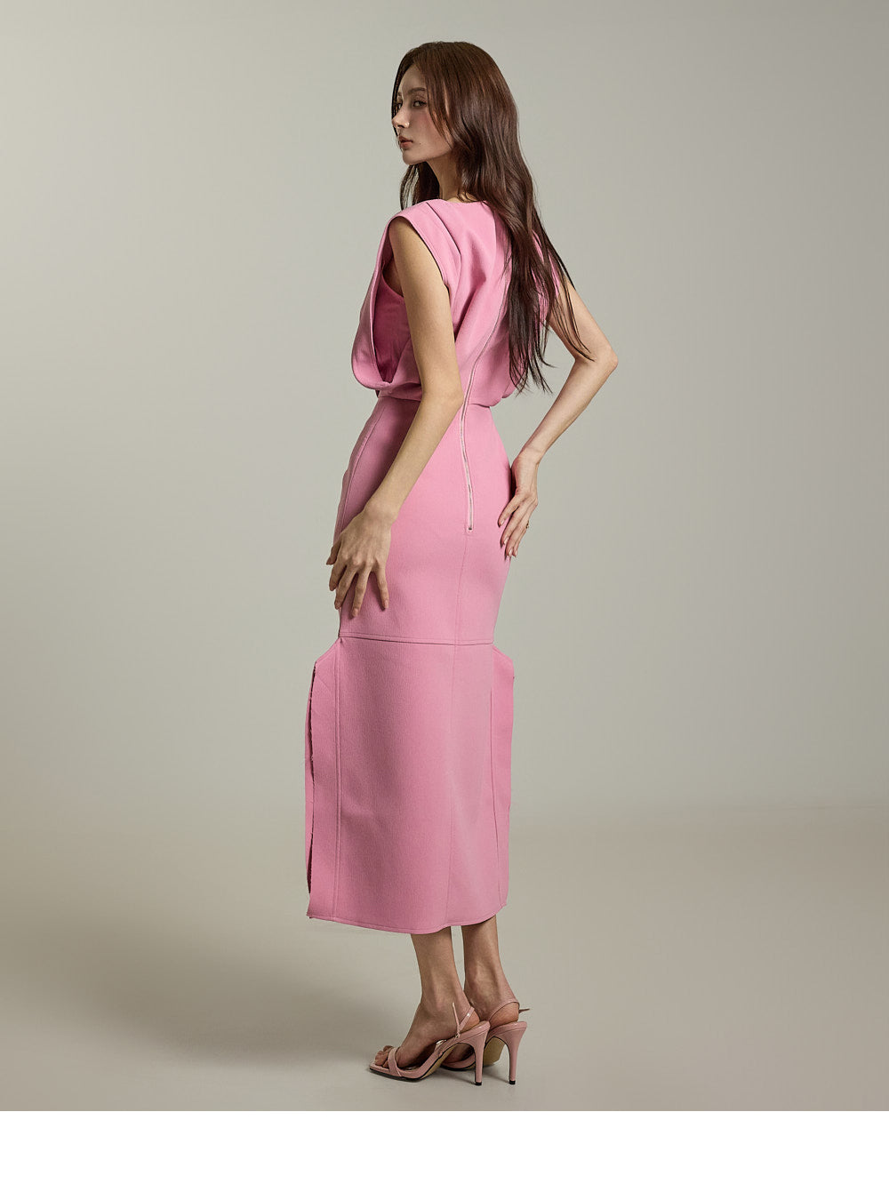 サイドのアシンメトリースリットが洗練されたスタイリッシュなアクセントを添えます。