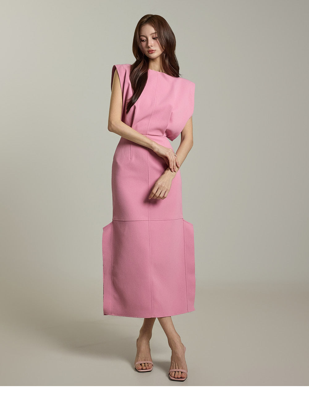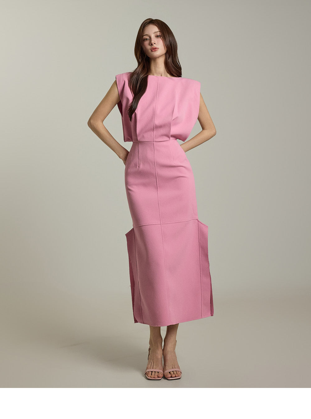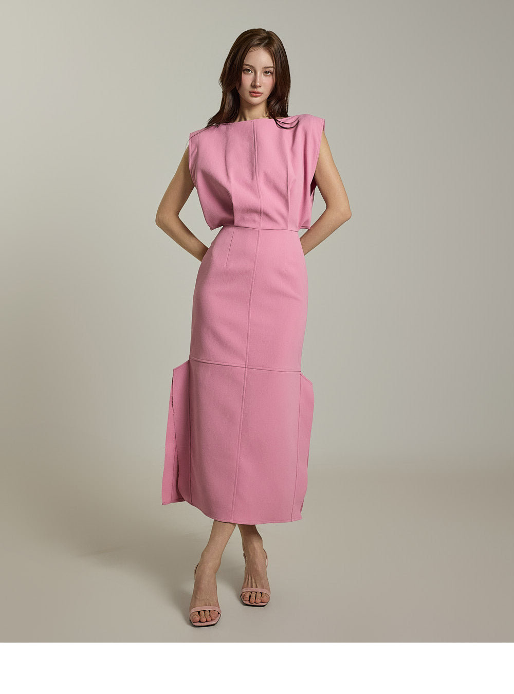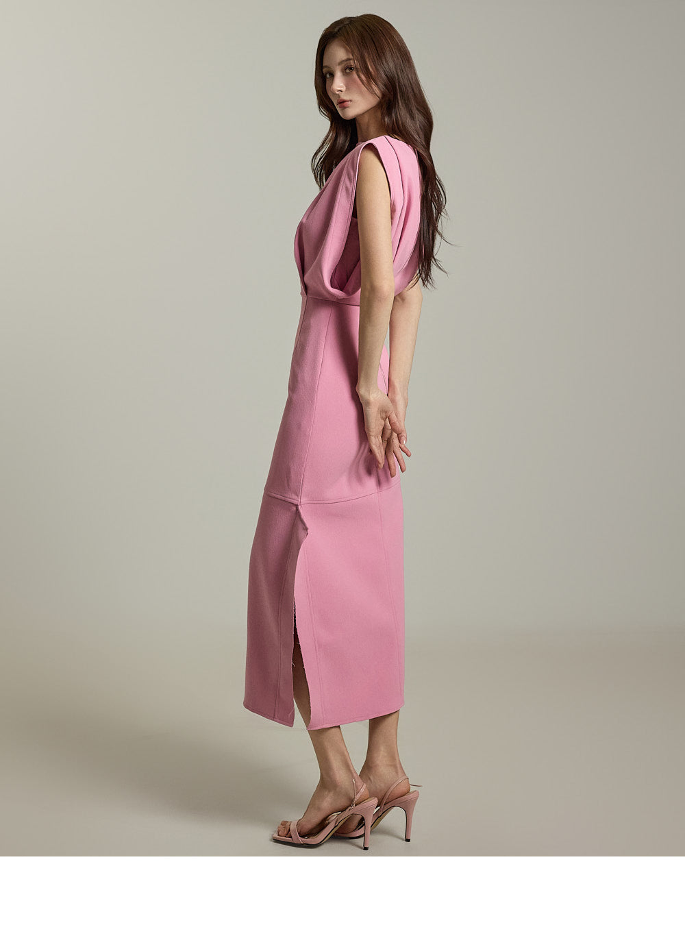 サイドのアシンメトリースリットが洗練されたスタイリッシュなアクセントを添えます。