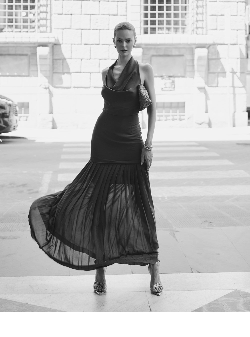 ラグジュアリーな雰囲気を漂わせるホルターネックのプリーツドレス。