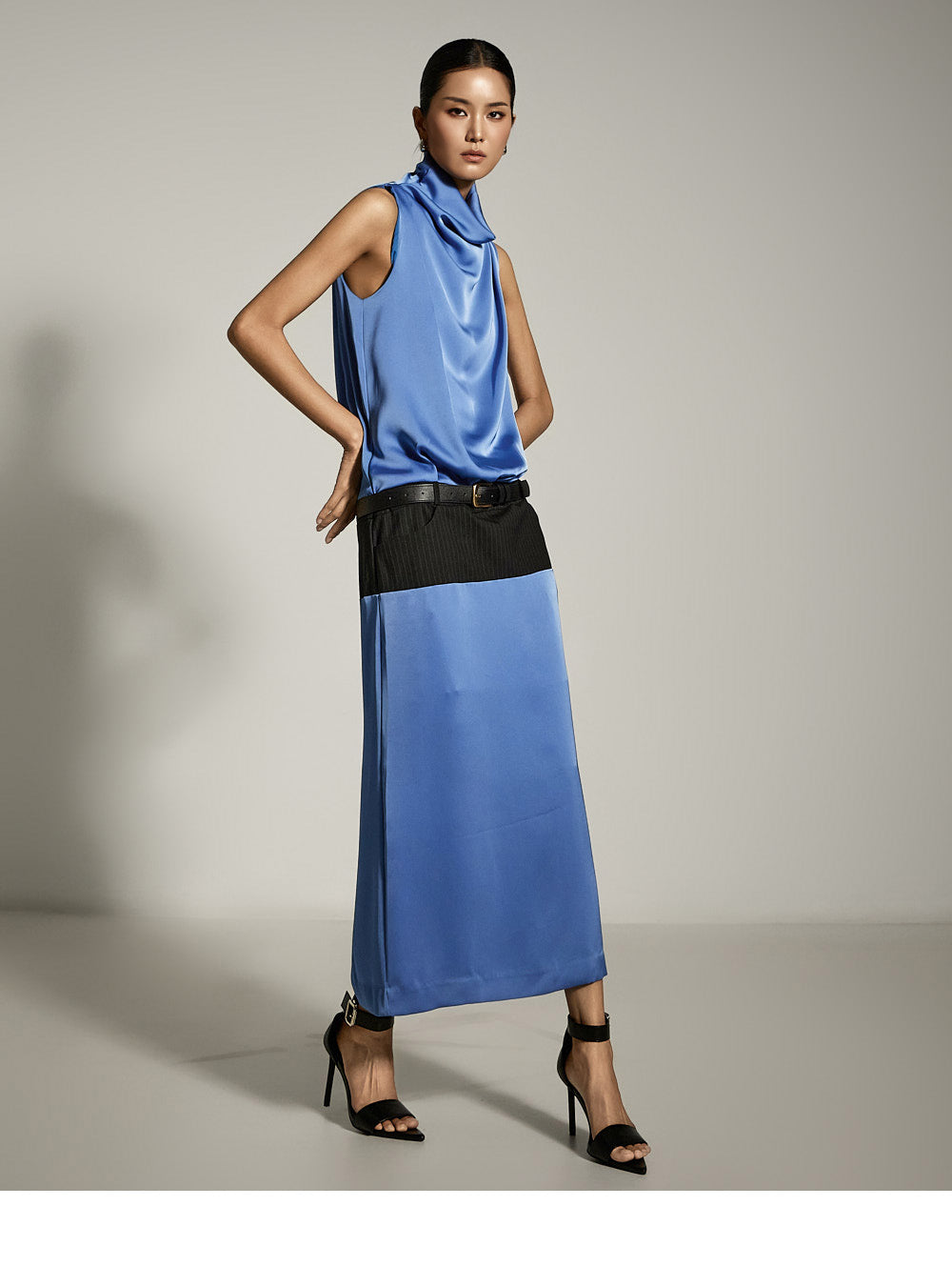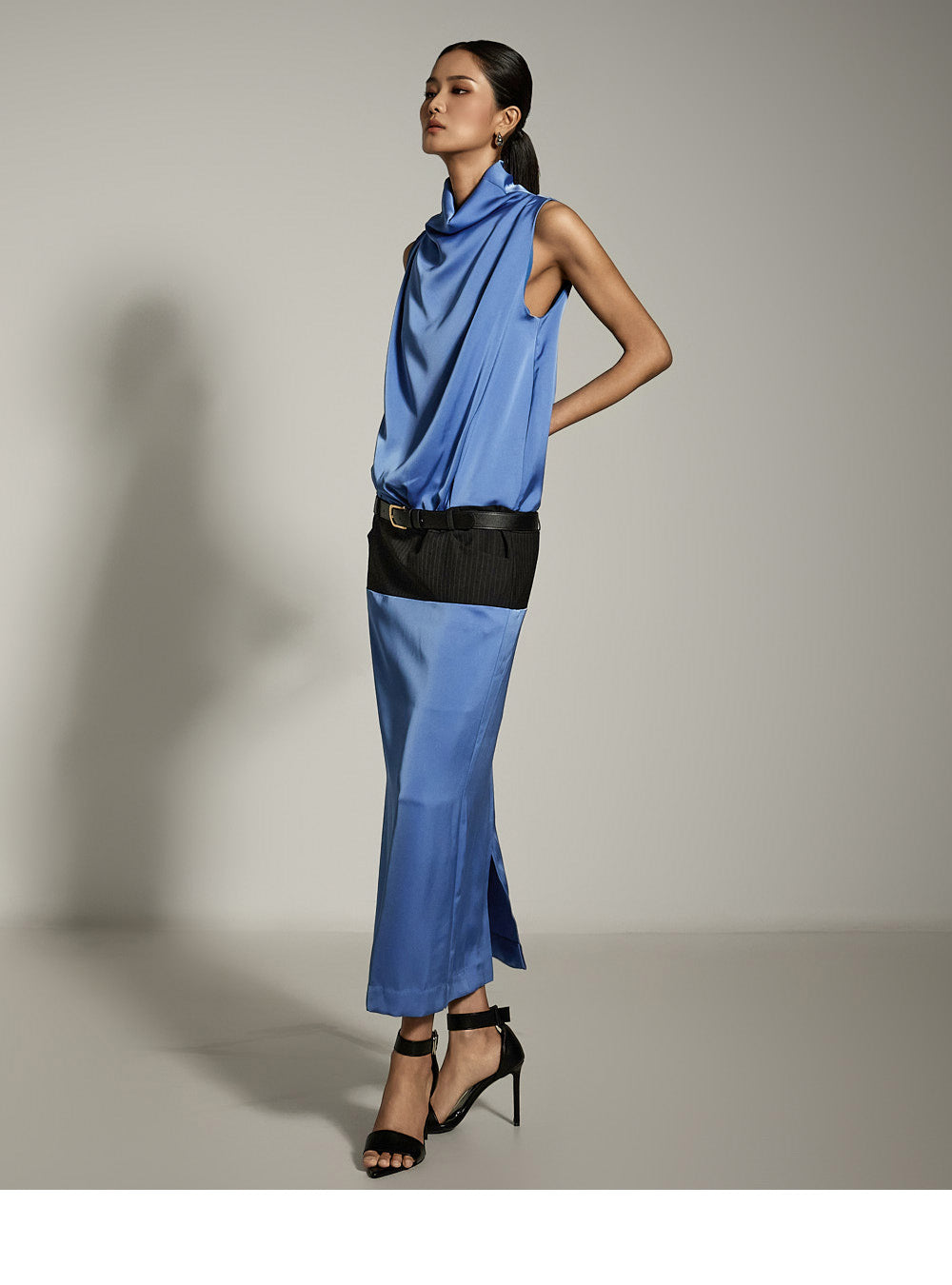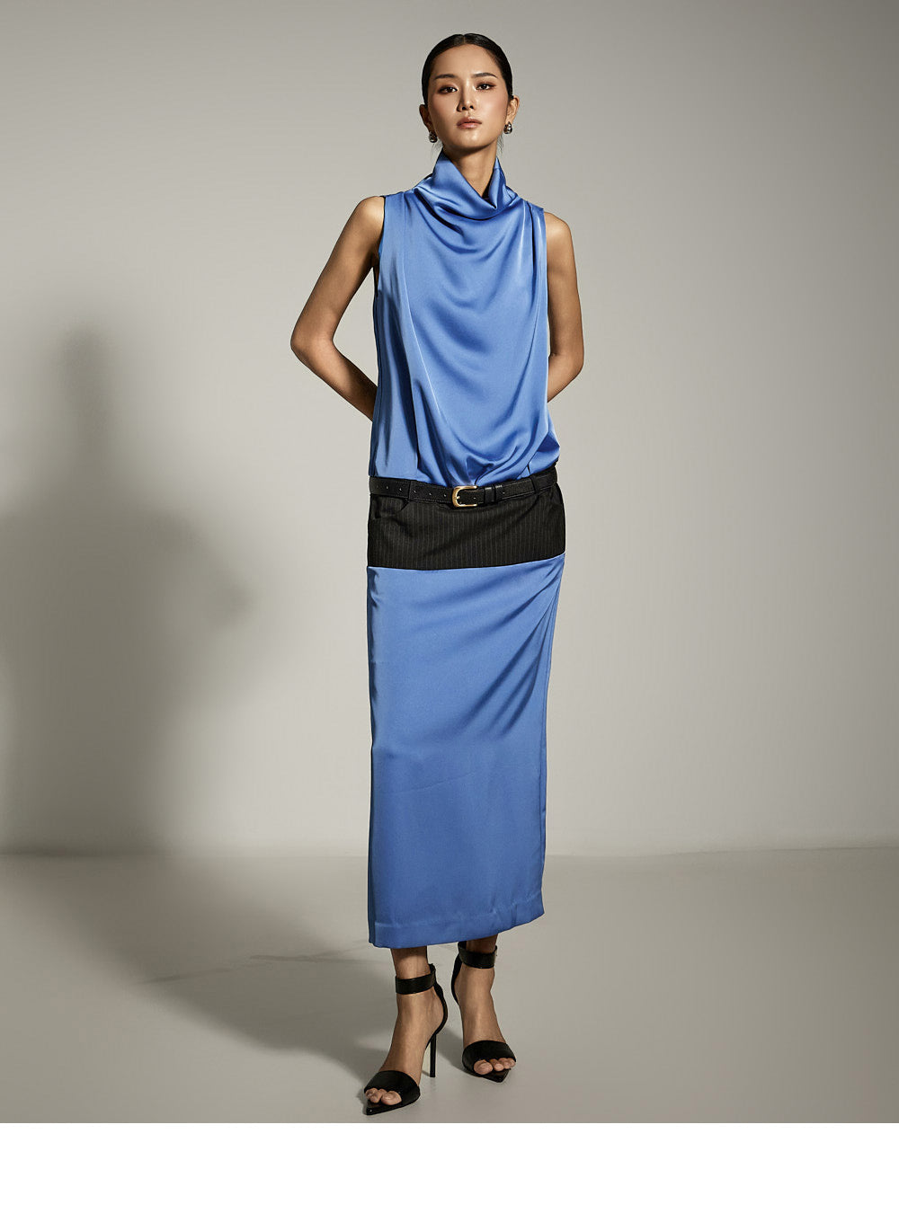 ベルトセット付きのサテンドレスはエレガントな雰囲気を醸し出します。