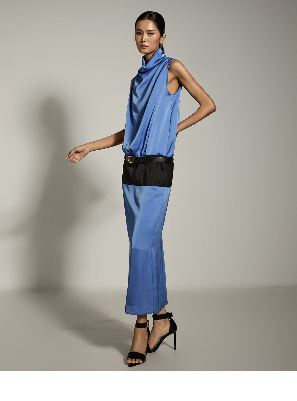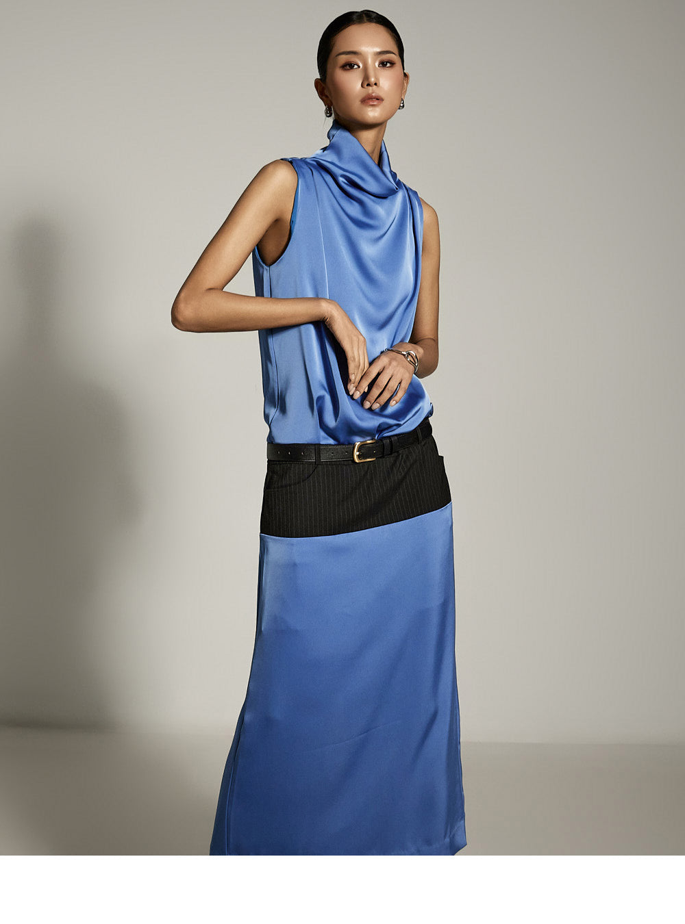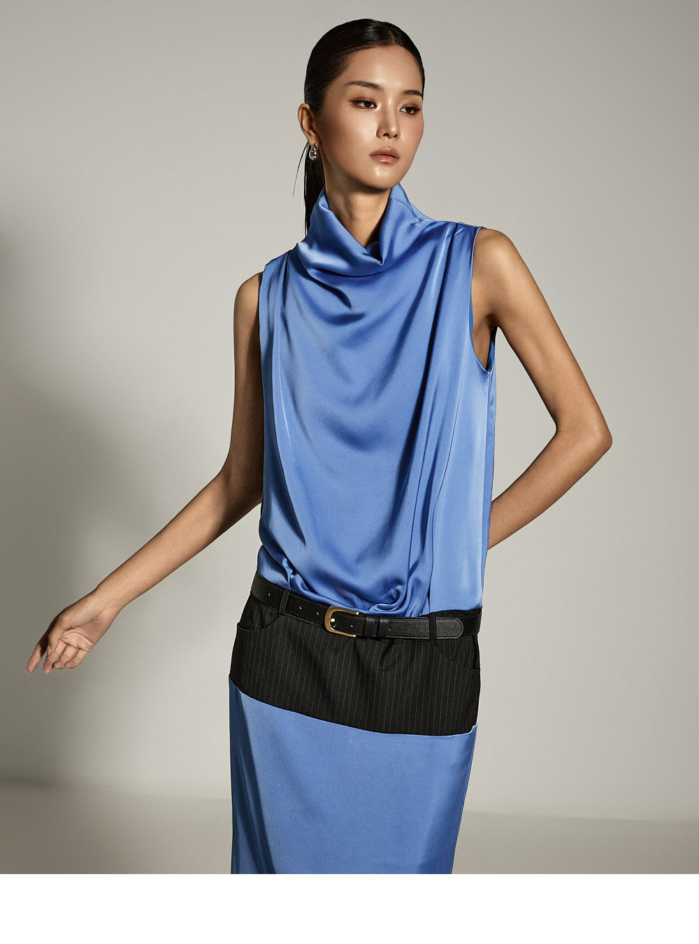 ホルターネックのシルエットがネックラインから胸元まで優雅に流れ、