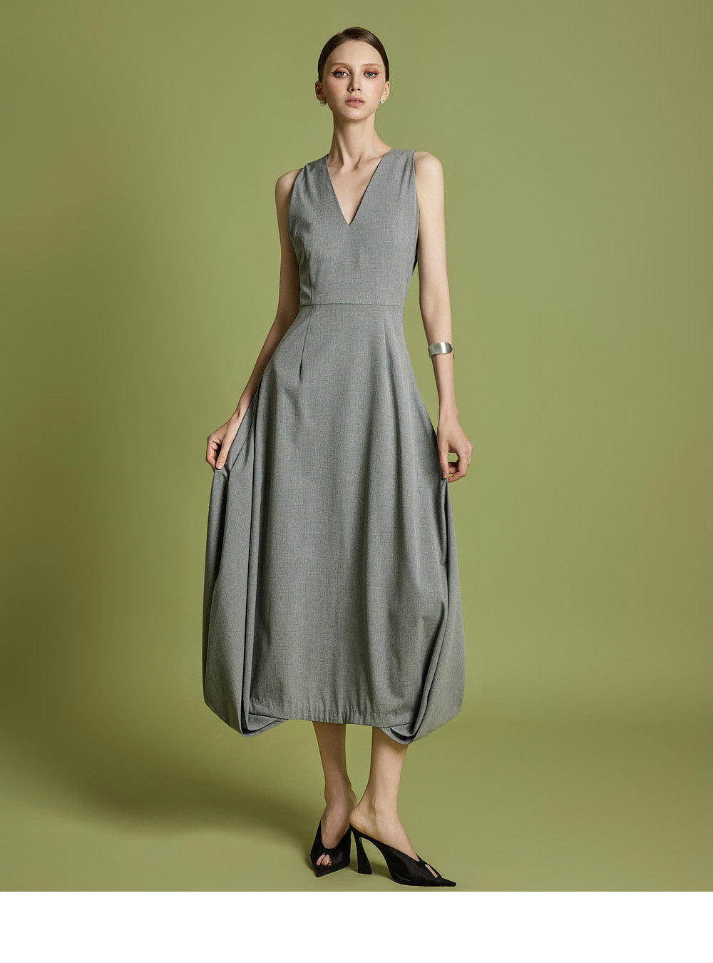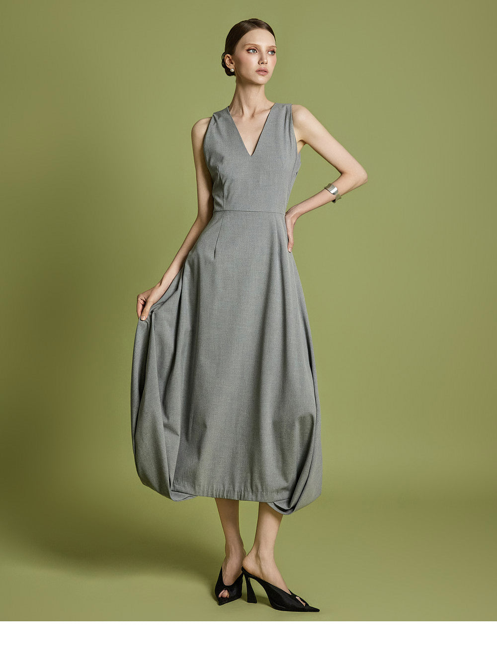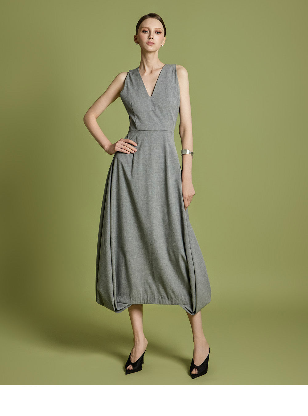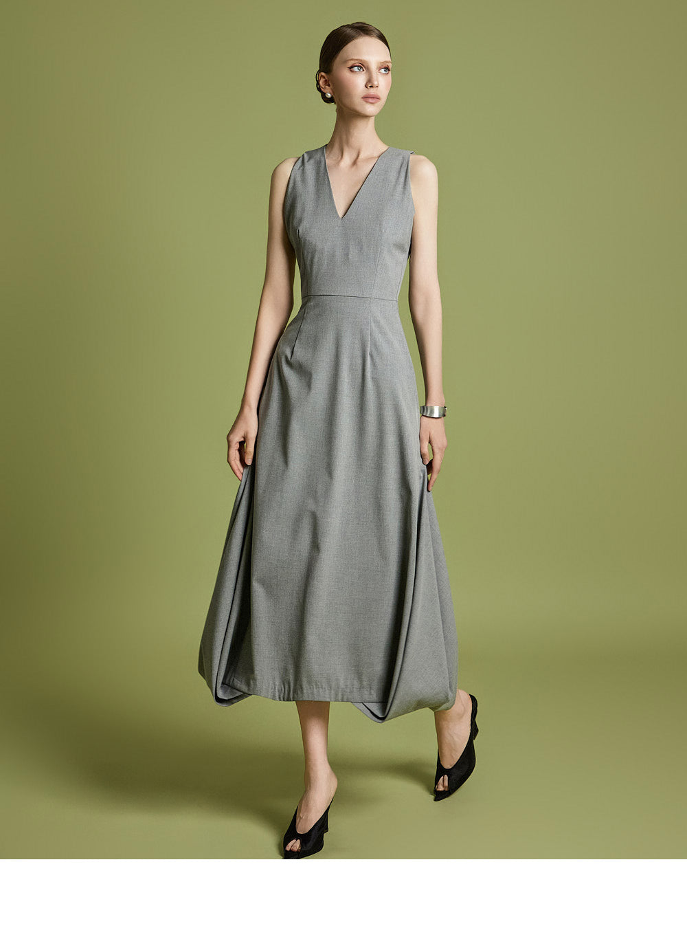 エレガントさと着やすさの両方を考慮してデザインされた、時代を超えたVネックフレアドレスです。