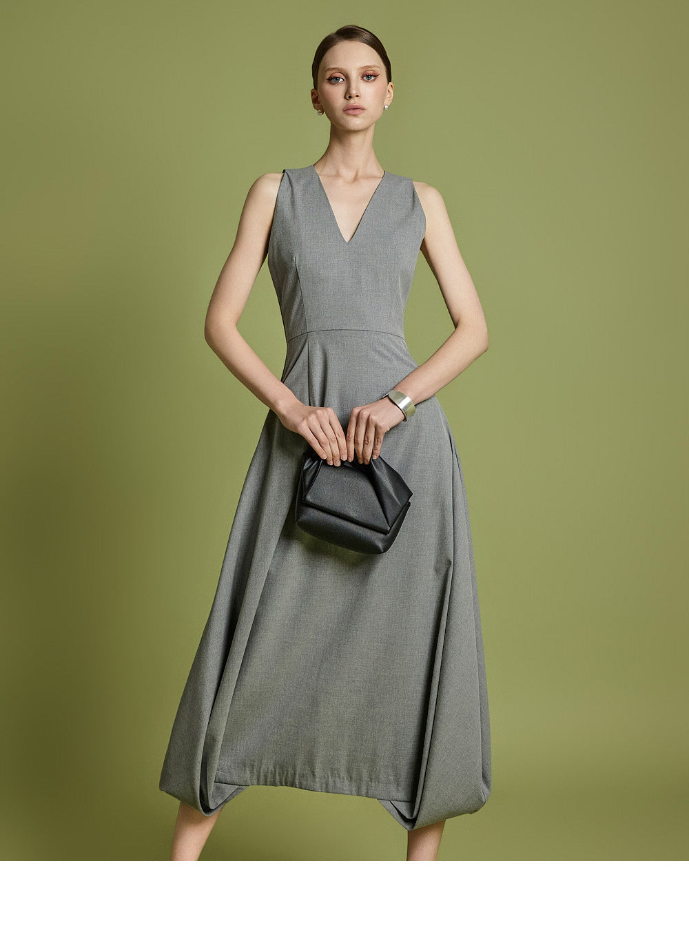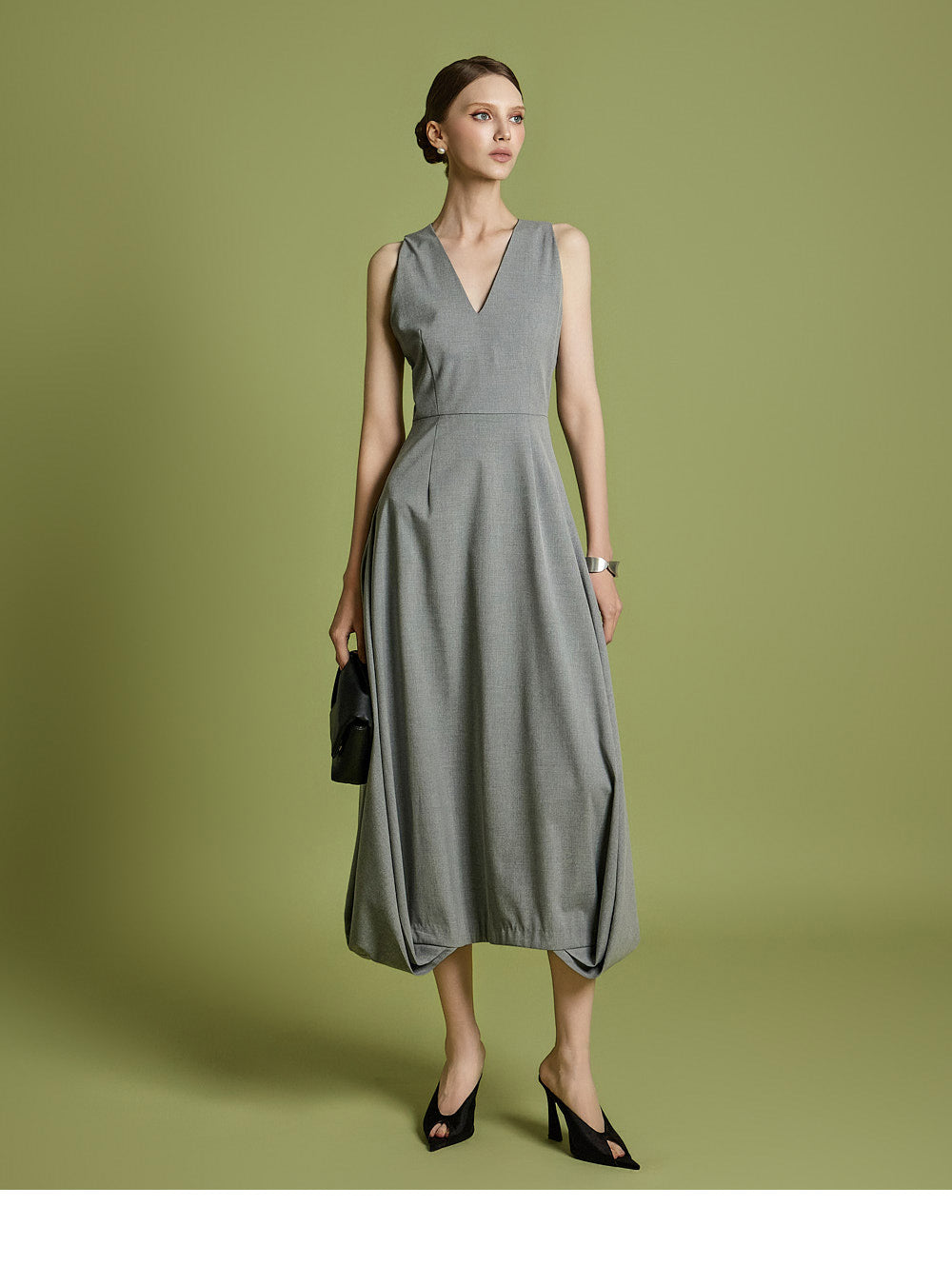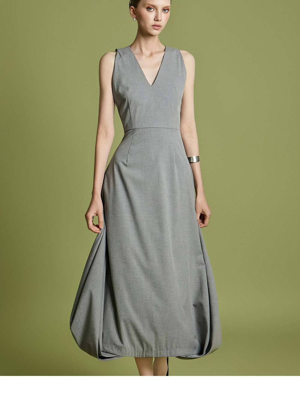 エレガントさと着やすさの両方を考慮してデザインされた、時代を超えたVネックフレアドレスです。