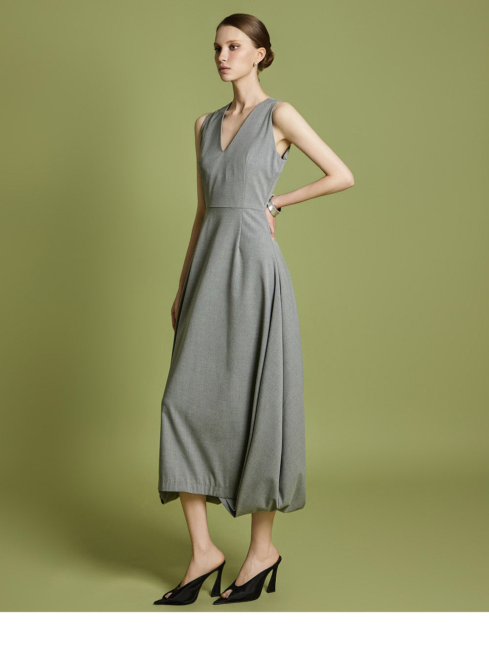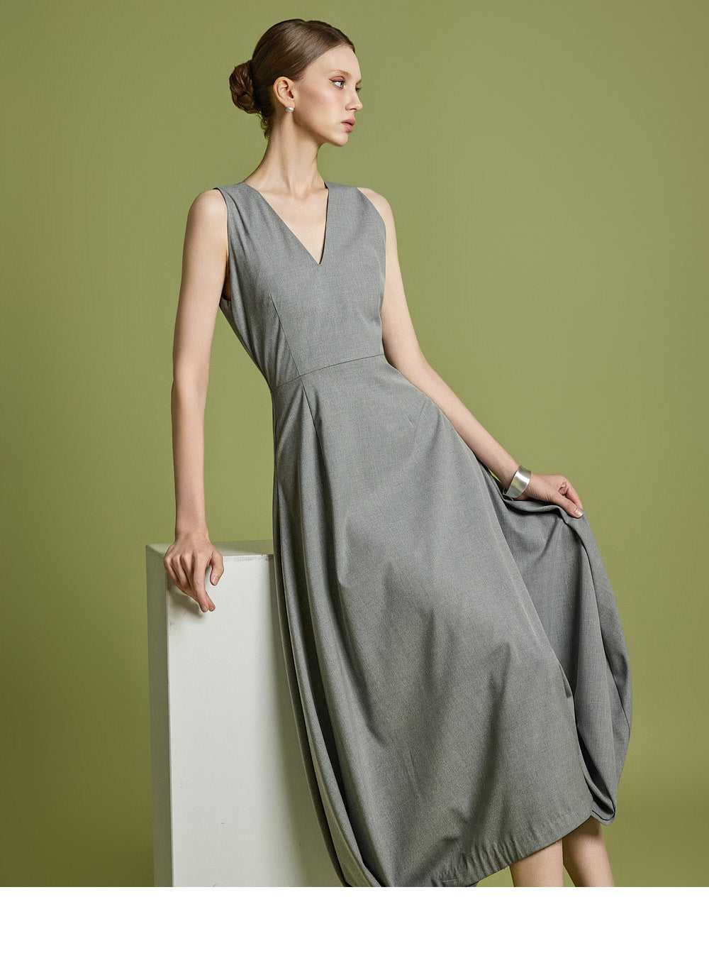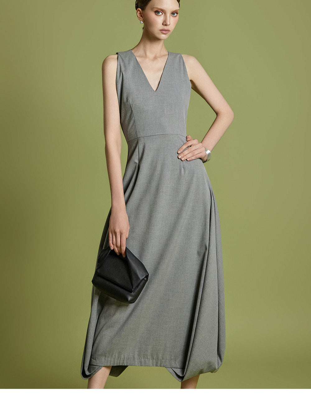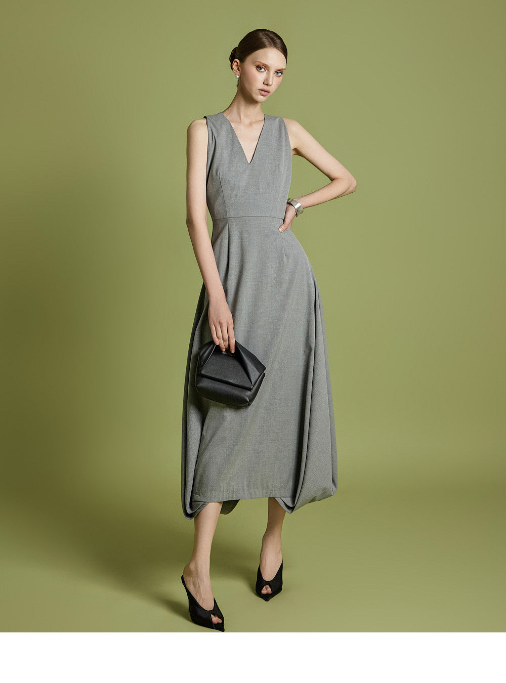 エレガントさと着やすさの両方を考慮してデザインされた、時代を超えたVネックフレアドレスです。