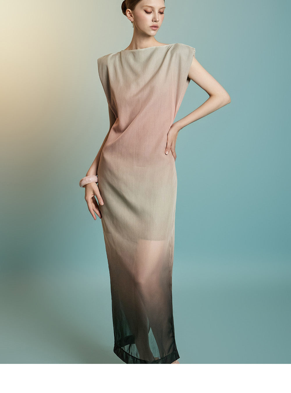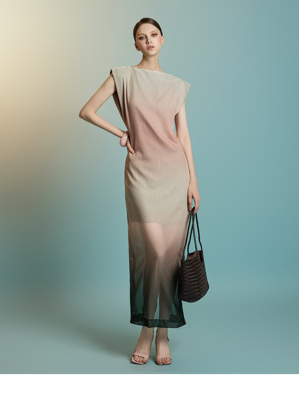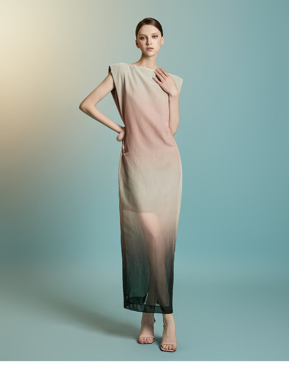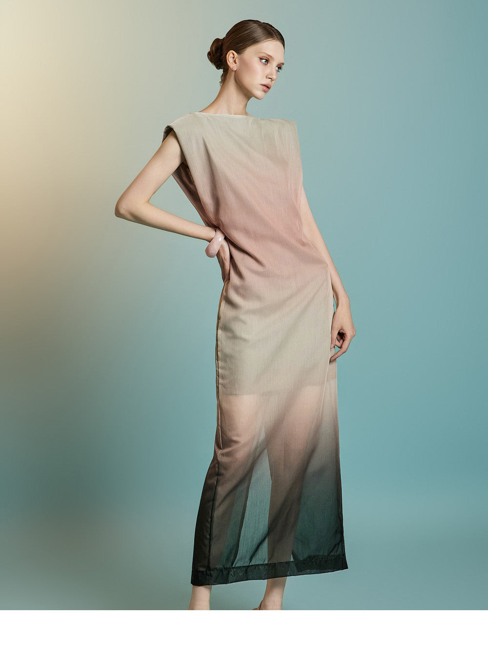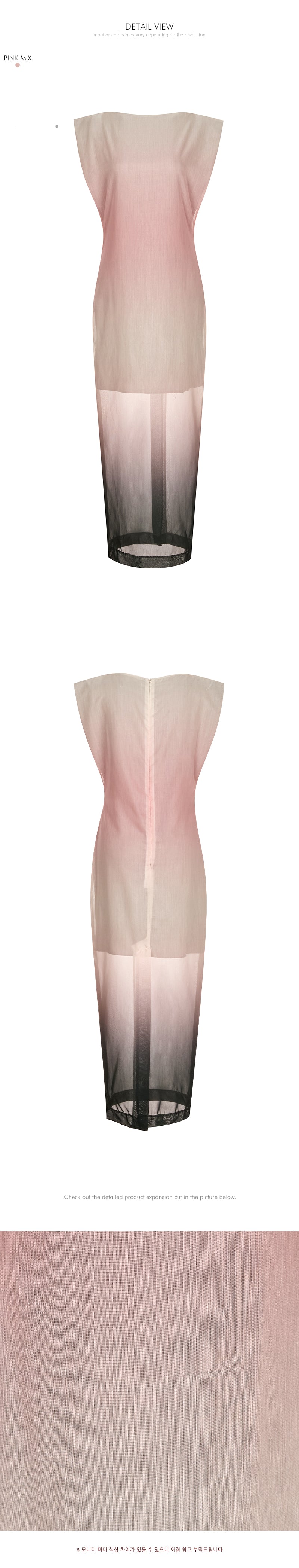 袖なしのロング丈デザインで、透け感のあるレイヤードが特徴です