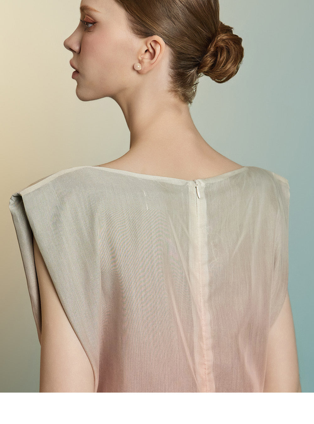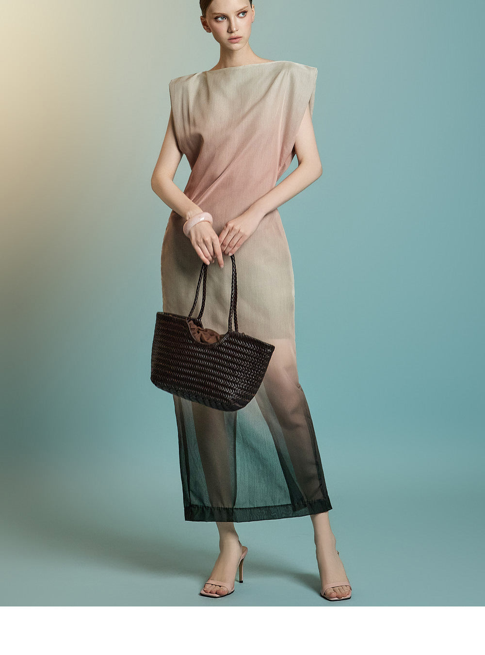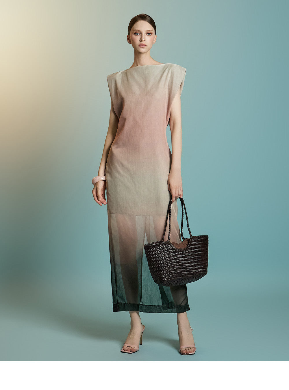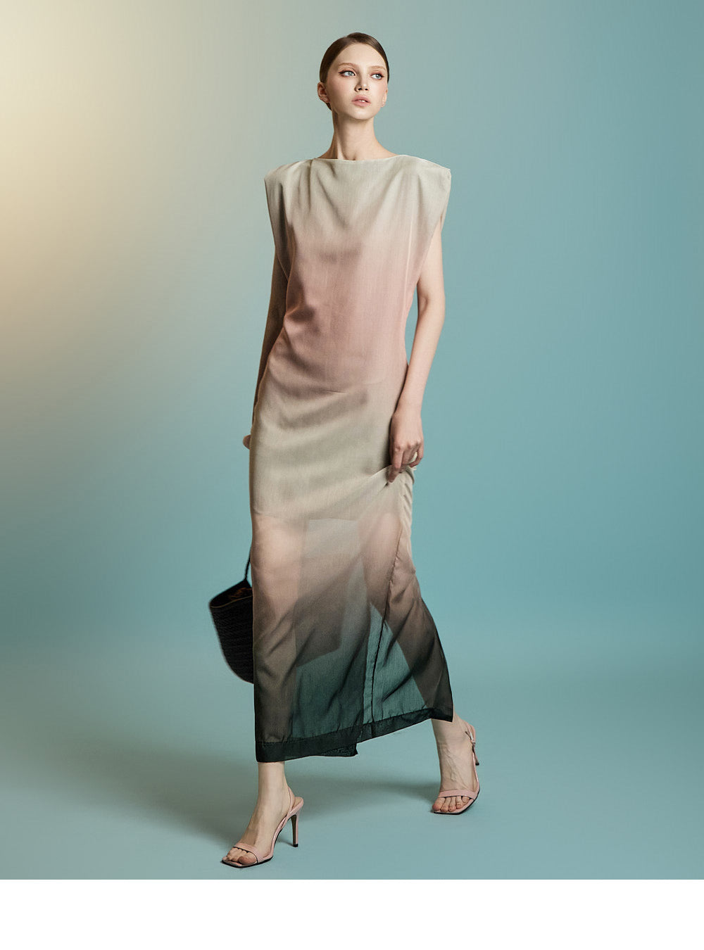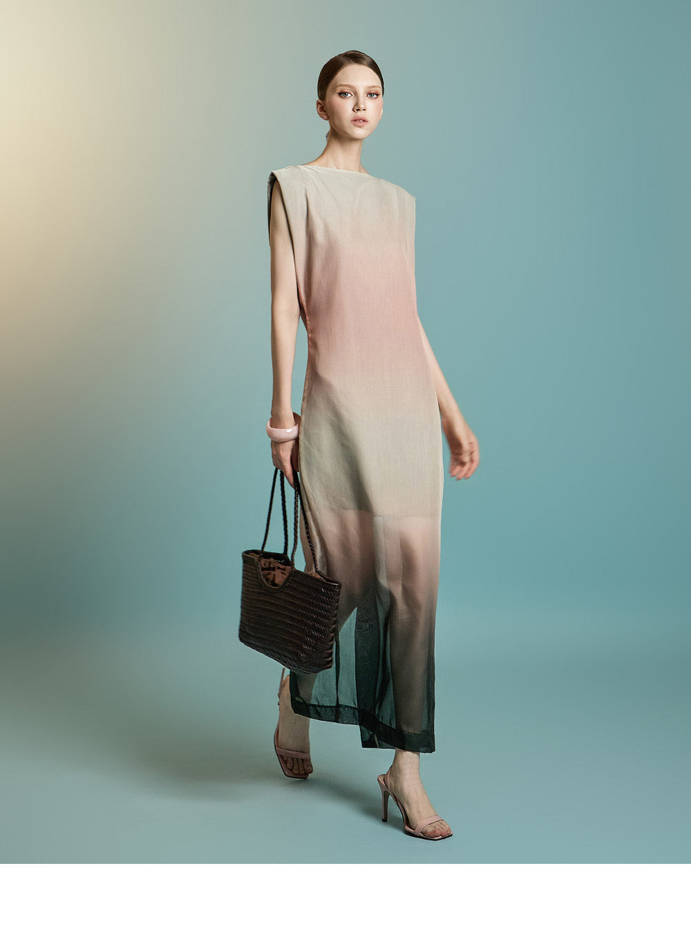 袖なしのロング丈デザインで、透け感のあるレイヤードが特徴です
