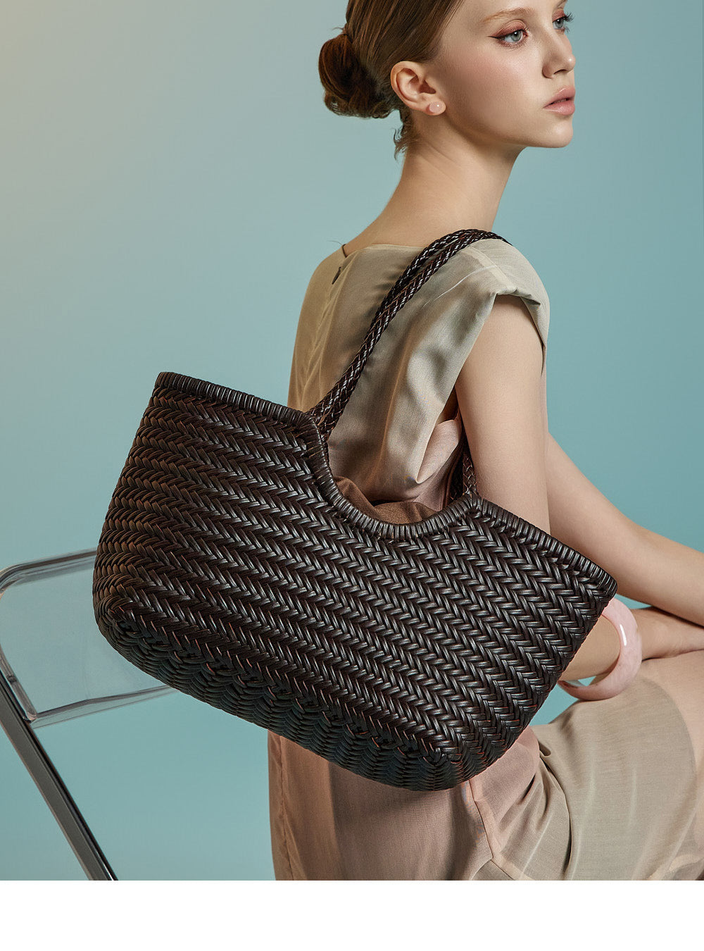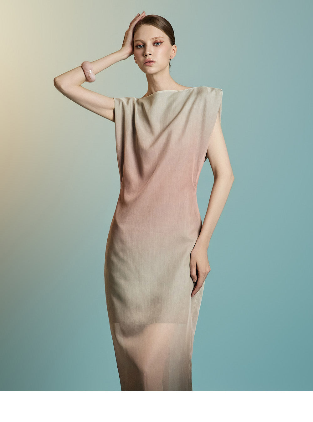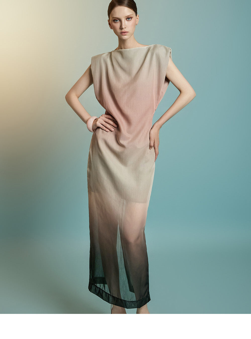 滑らかな質感が、柔らかく流れるようなドレープでシルエットを引き立てます。