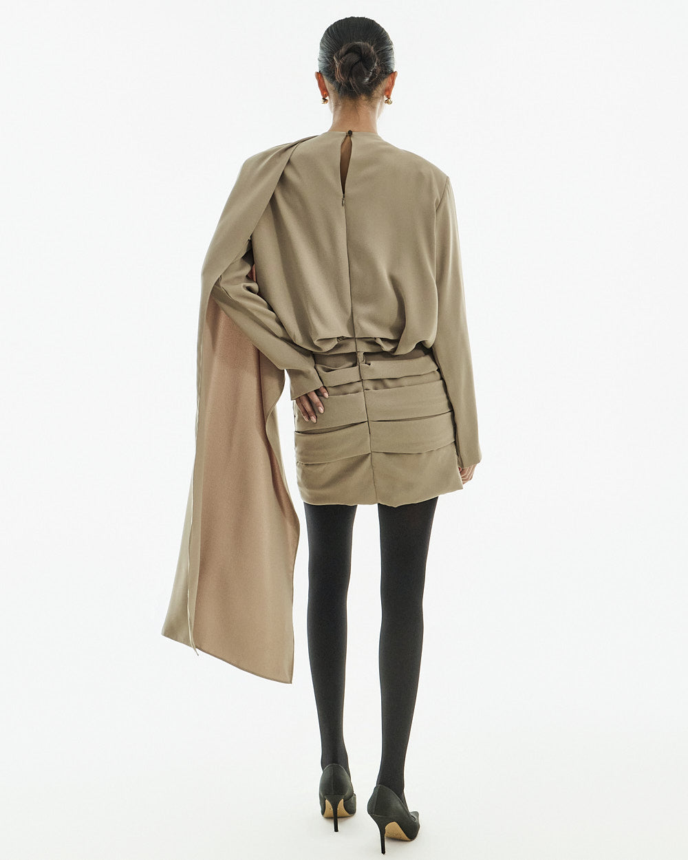 This elegant draped mini dress exudes elegance.