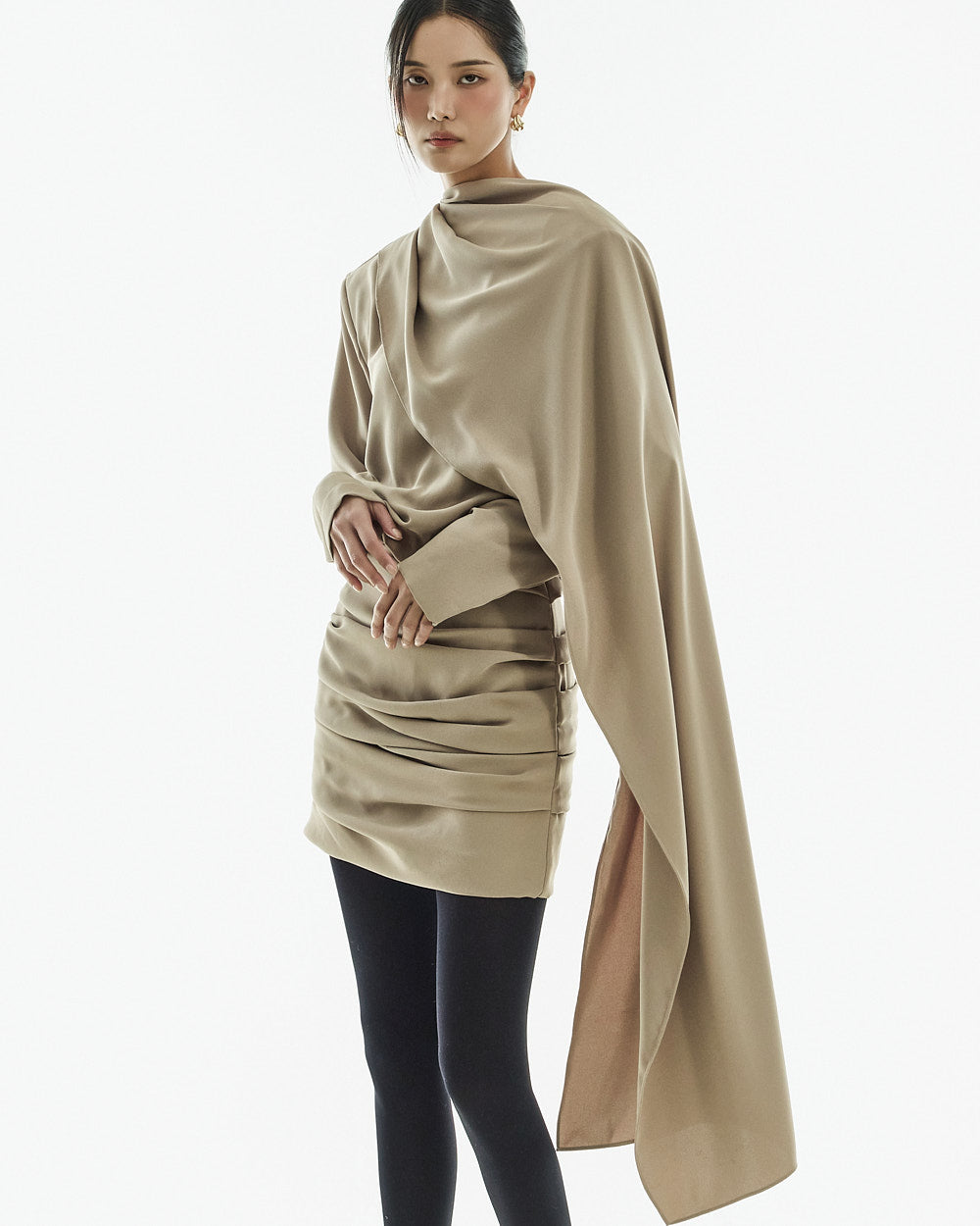 The front draped detail allows for a variety of styling options,